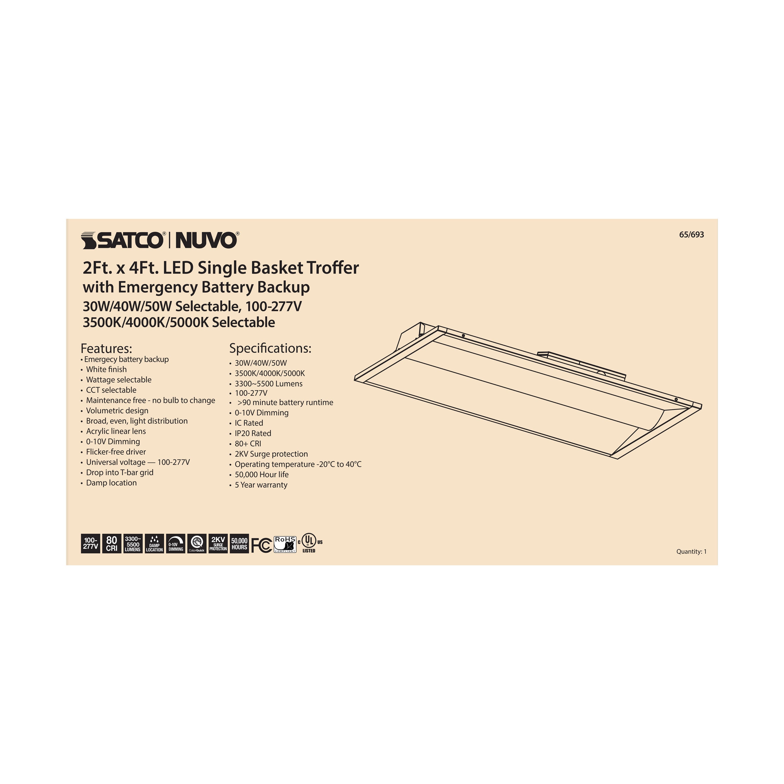 SATCO NUVO's versatile Single and Double Basket troffers now come in field selectable power and color options. Choose from three distinct wattage settings and color temperatures during installation. Engineered with cutting-edge driver technology, our troffers are rated for 50,000 hours of illumination.