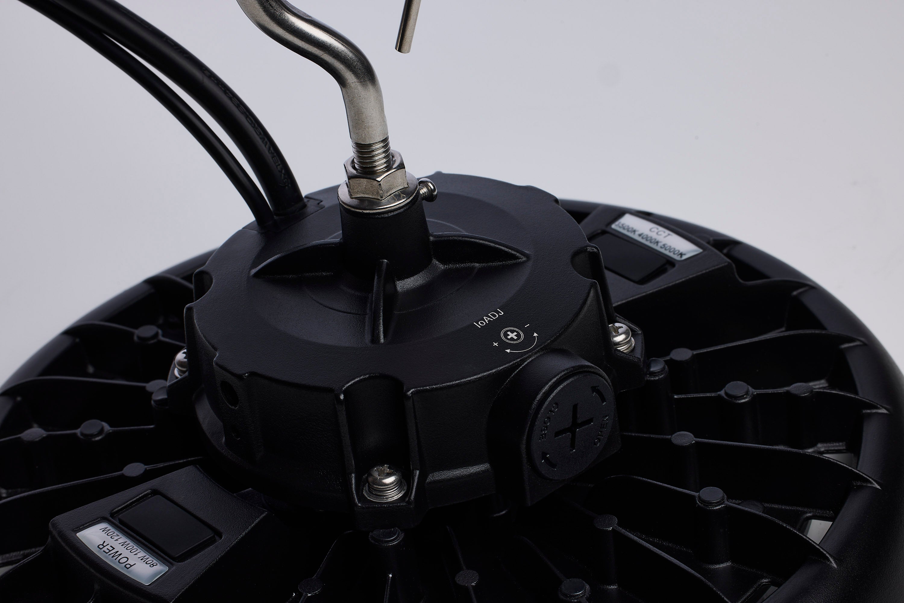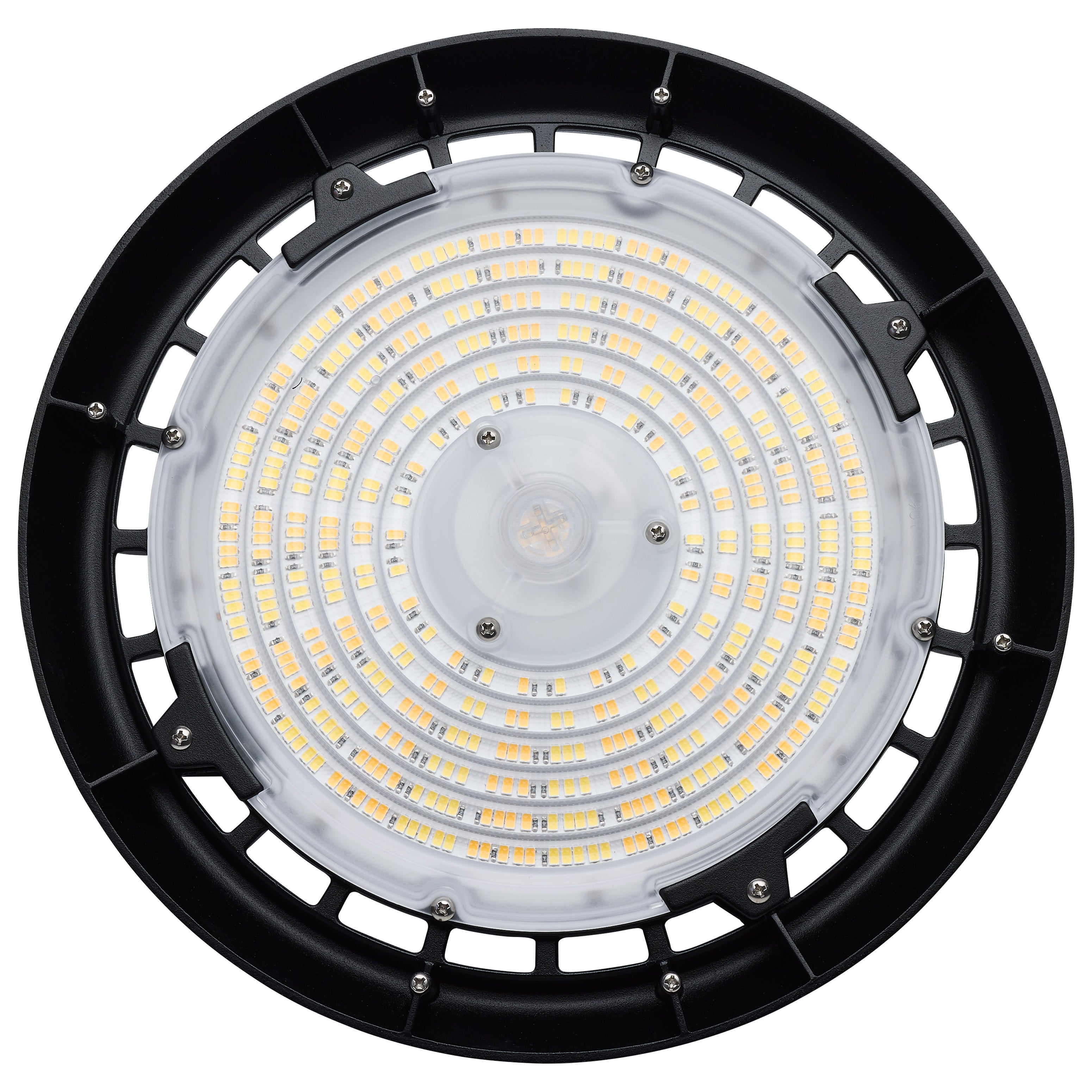 SATCO NUVO's Round High Bay Field Selectable fixtures offer an energy efficient and low-maintenance alternative to traditional HID fixtures. These luminaires are field selectable, giving users the flexibility to choose from three wattage and three CCT options during installation. The fixtures are constructed with a durable die-cast aluminum housing and an IK08 impact-rated polycarbonate lens. Featuring 6kV surge protection, 120V-347V range voltage and NEMA 4X (IP65) wet location rating, these high bays are resilient in various commercial environments. Compatible with a wide variety of accessories (sold separately) fixtures can be customized to accommodate a multitude of lighting needs.