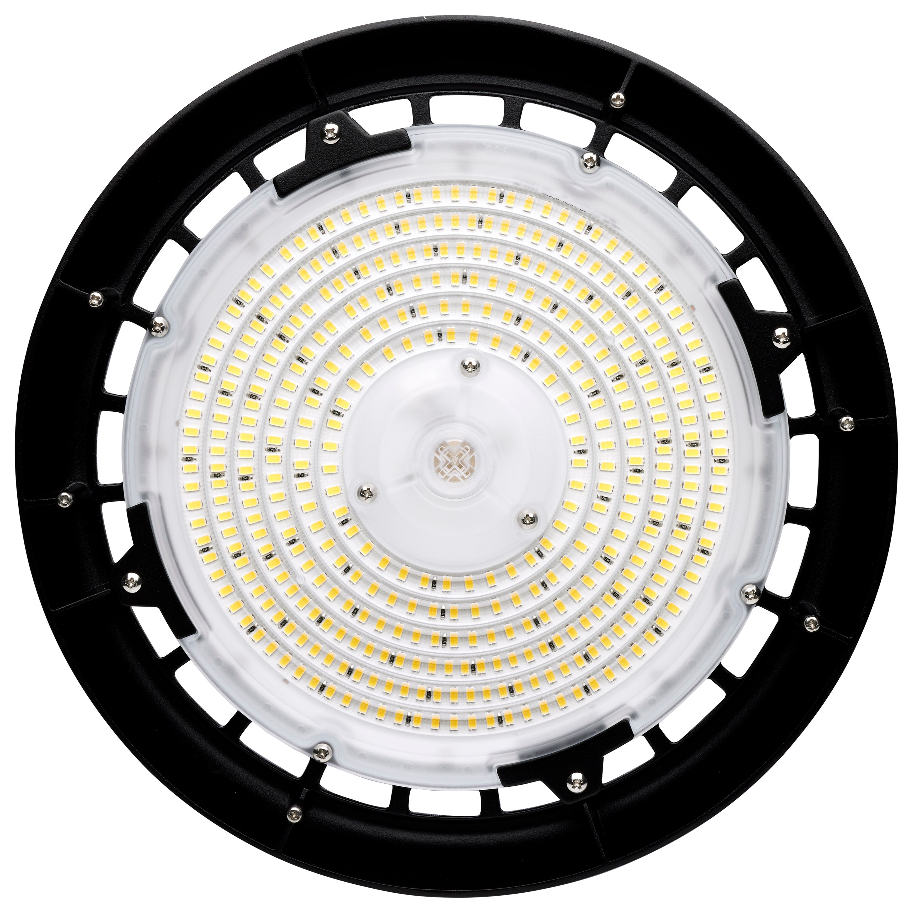 SATCO NUVO's 100-watt, 5000K, black UFO LED High Bay offers superior value and meets the needs of numerous applications. A few add-ons that are available for purchase for this item include a pendant adapter, emergency battery back-up, protective wire guard, and a microwave sensor. This product also features dimming capabilities, 6KV surge protection, is wet location rated, and is also DLC Premium 5.1 listed.