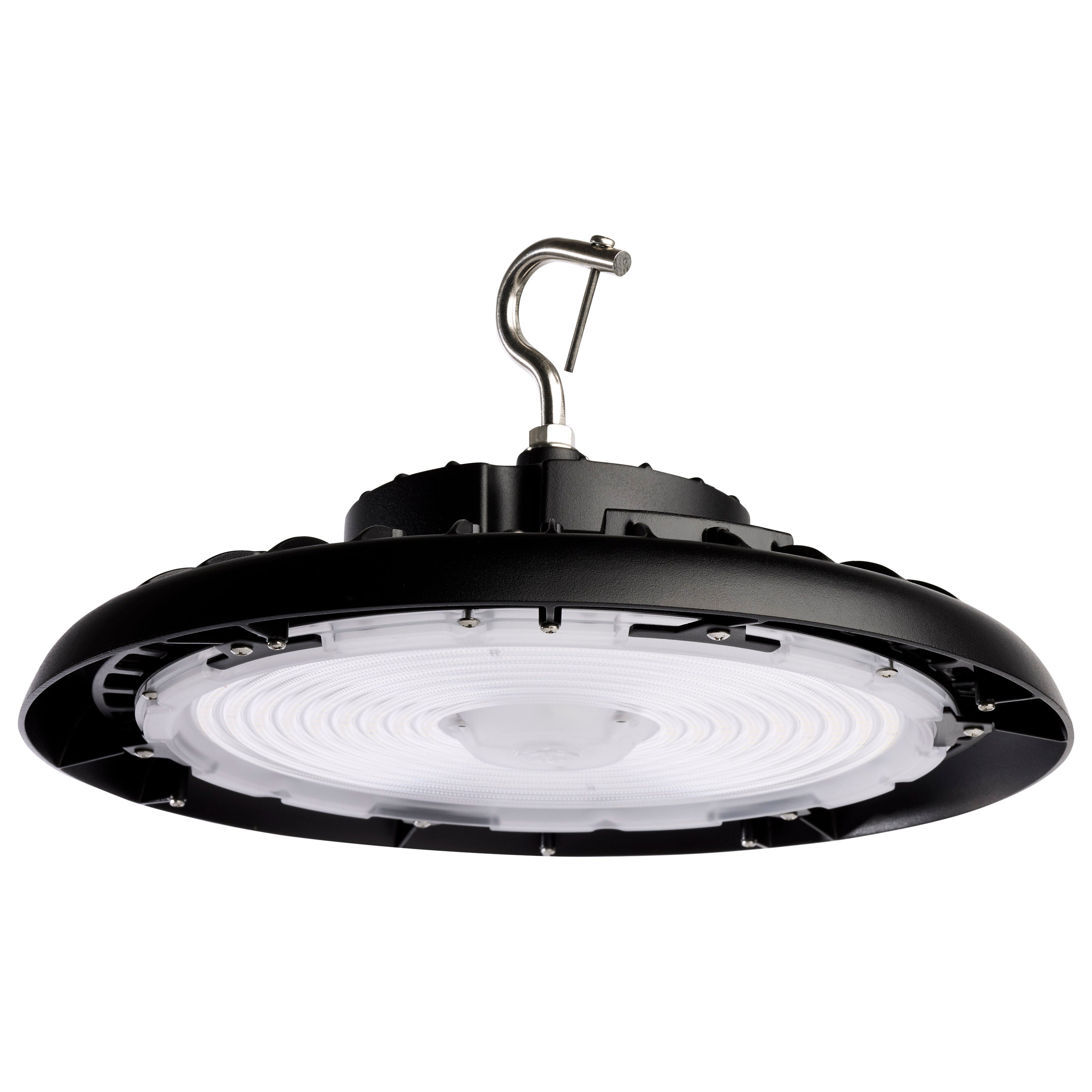 SATCO NUVO's 240-watt, 5000K, black UFO LED High Bay offers superior value and meets the needs of numerous applications. A few add-ons that are available for purchase for this item include a pendant adapter, emergency battery back-up, protective wire guard, and a microwave sensor. This product also features dimming capabilities, 6KV surge protection, is wet location rated, and is also DLC Premium 5.1 listed.