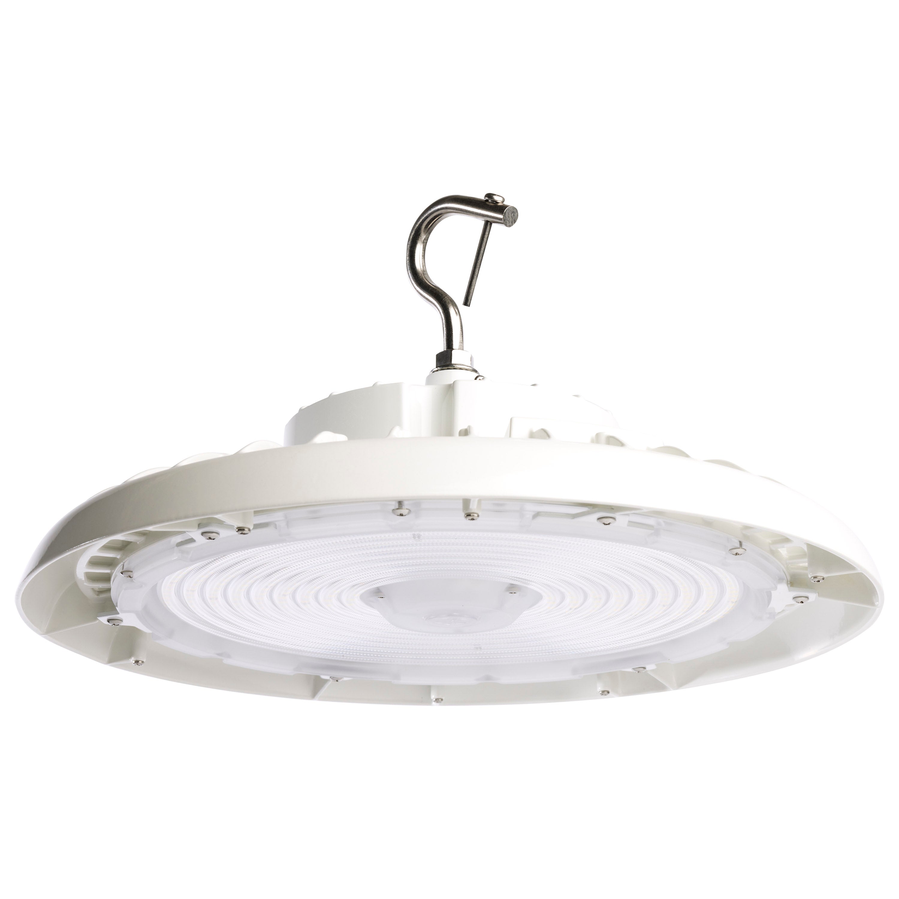 SATCO NUVO's 200-watt, 5000K, white UFO LED High Bay offers superior value and meets the needs of numerous applications. A few add-ons that are available for purchase for this item include a pendant adapter, emergency battery back-up, protective wire guard, and a microwave sensor. This product also features dimming capabilities, 6KV surge protection, is wet location rated, and is also DLC Premium 5.1 listed.