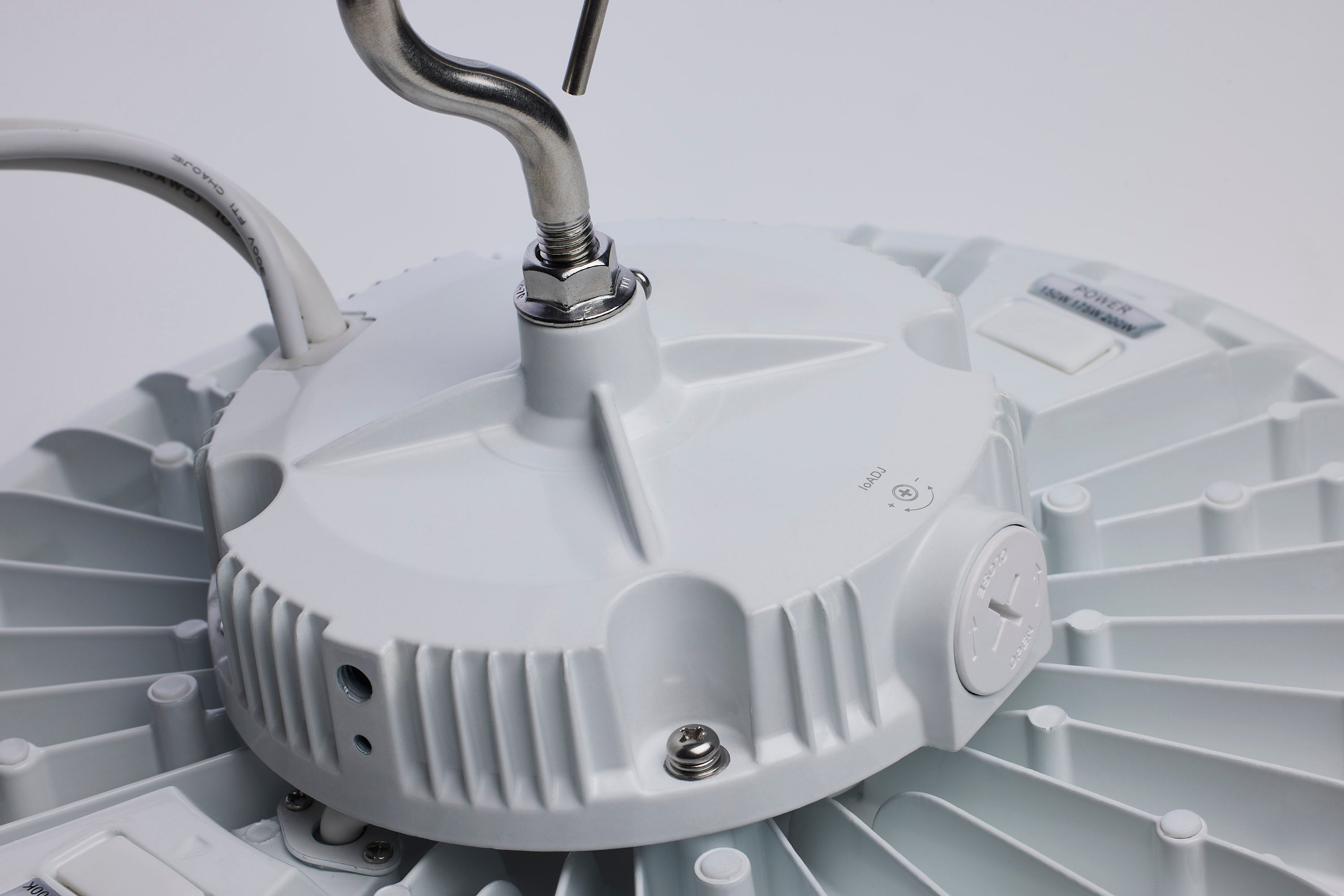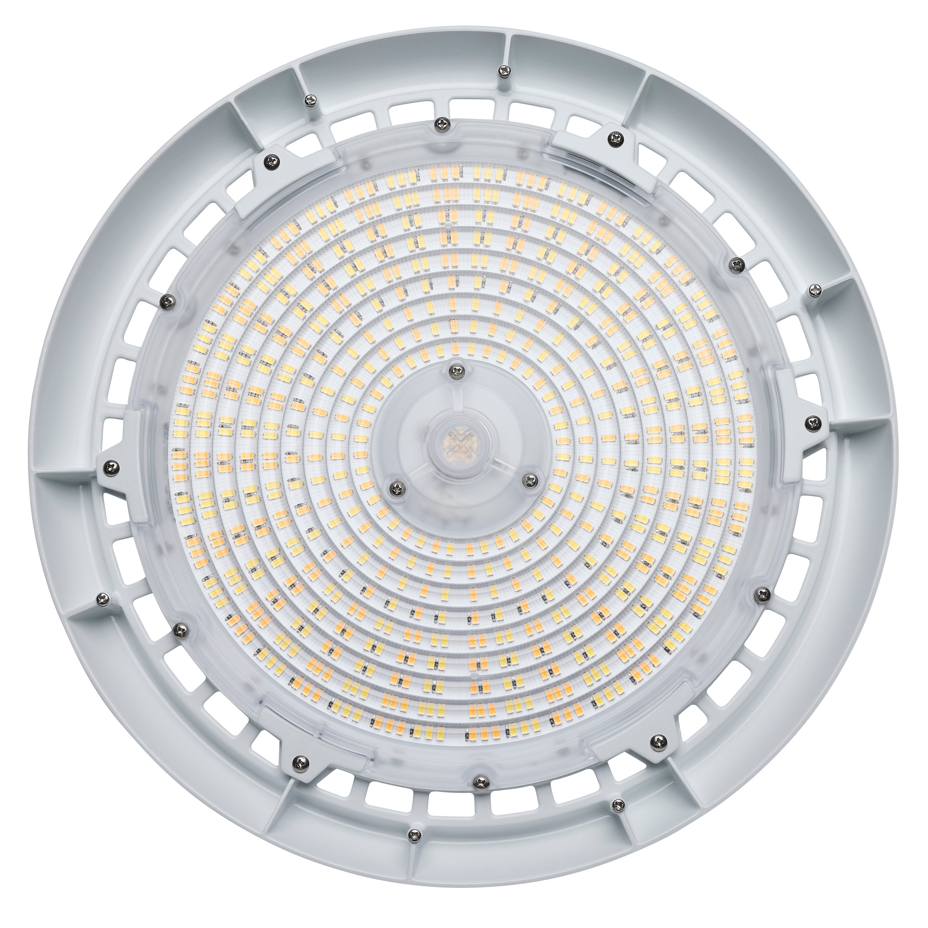 SATCO NUVO's Round High Bay Field Selectable fixtures offer an energy efficient and low-maintenance alternative to traditional HID fixtures. These luminaires are field selectable, giving users the flexibility to choose from three wattage and three CCT options during installation. The fixtures are constructed with a durable die-cast aluminum housing and an IK08 impact-rated polycarbonate lens. Featuring 6kV surge protection, 120V-347V range voltage and NEMA 4X (IP65) wet location rating, these high bays are resilient in various commercial environments. Compatible with a wide variety of accessories (sold separately) fixtures can be customized to accommodate a multitude of lighting needs.