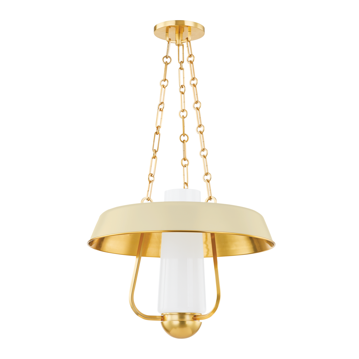 A modern reimagining of a vintage hurricane lamp, this stylish pendant light blends a sense of heritage with contemporary usability. While the Aged Brass framework and thick chains add to the antique feel of this fixture, the decorative shade in either Soft Sand or Soft Black adds a fresh feel. The large opal glossy glass tube at the center provides comforting illumination over a large area.