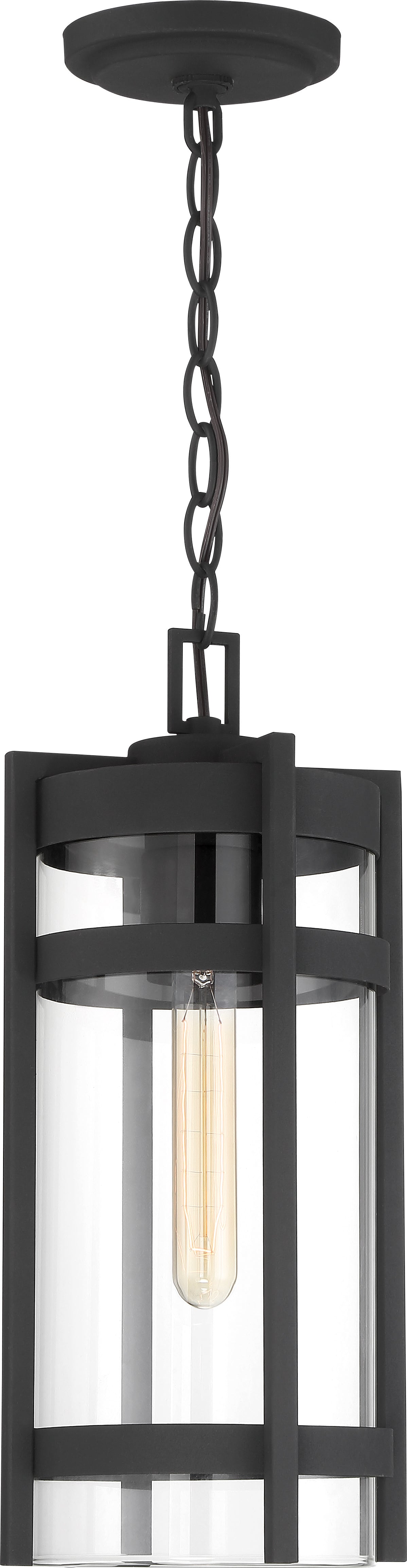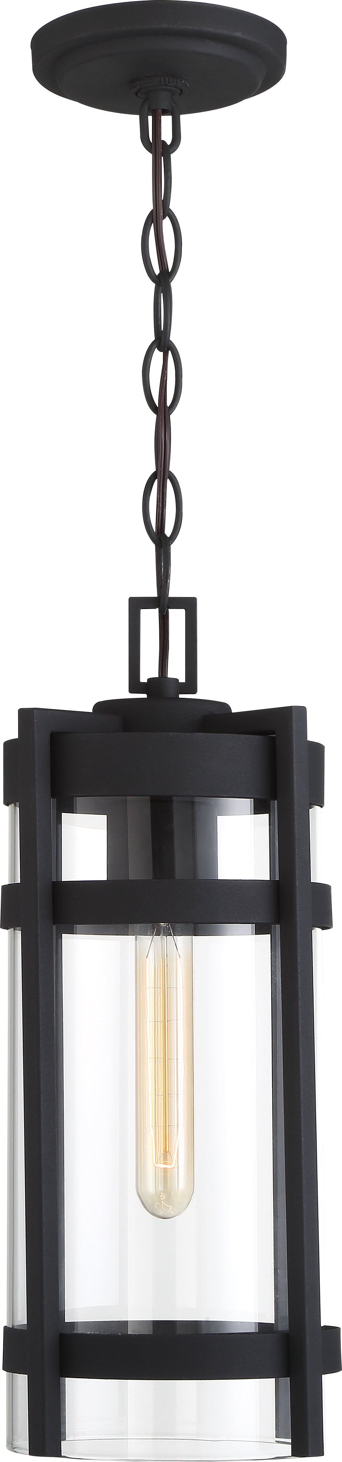 Satco's Tofino 1 light hanging lantern, the clear glass chimney shade of this outdoor 16 inch hanging lantern surrounds a T9 spiral lamp. The cap and chain support the glass rings and accent the bulb. The textured black finish is ideal for complementing a variety of home exteriors and brings a glowing ambiance to light your evenings.