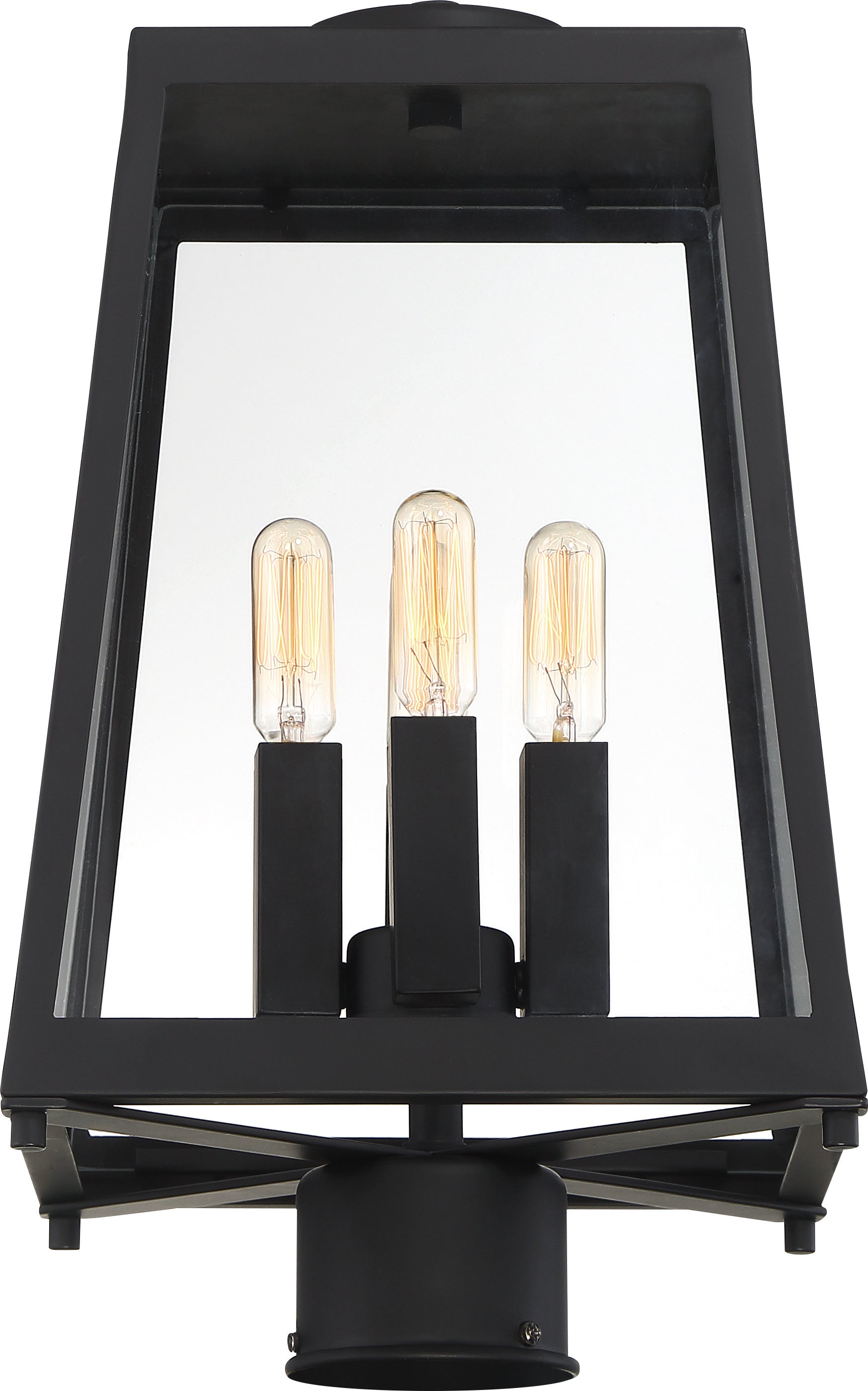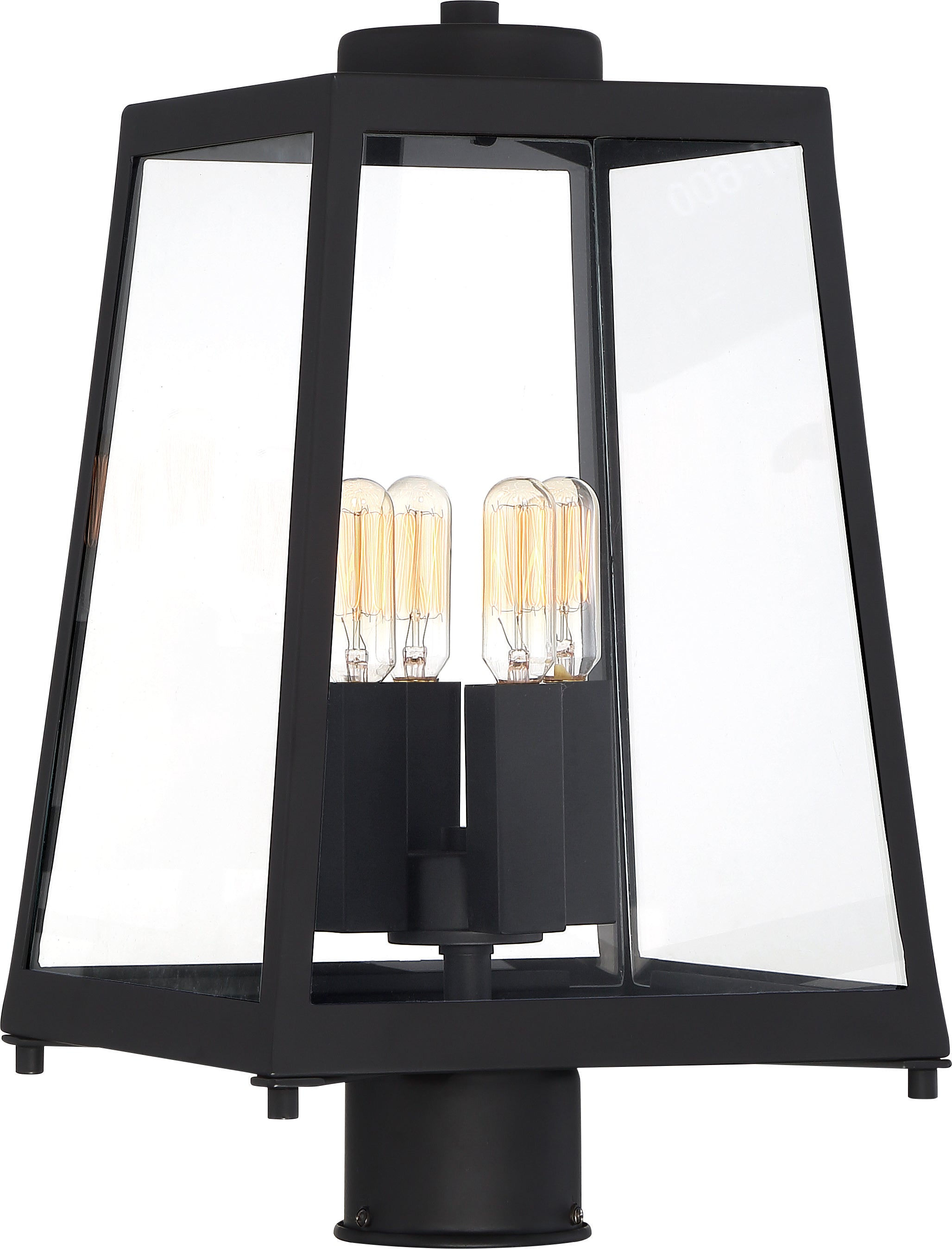 Satco's Halifax 4 light post lantern styled sconce with clear glass windows and trapezoidal frame is a modern design with hints of a nautical theme. Four T9 bulbs sit elegantly inside clear glass, surrounded by a matte black frame. Slightly oversized, this luminaire offers style for outdoor home décor.