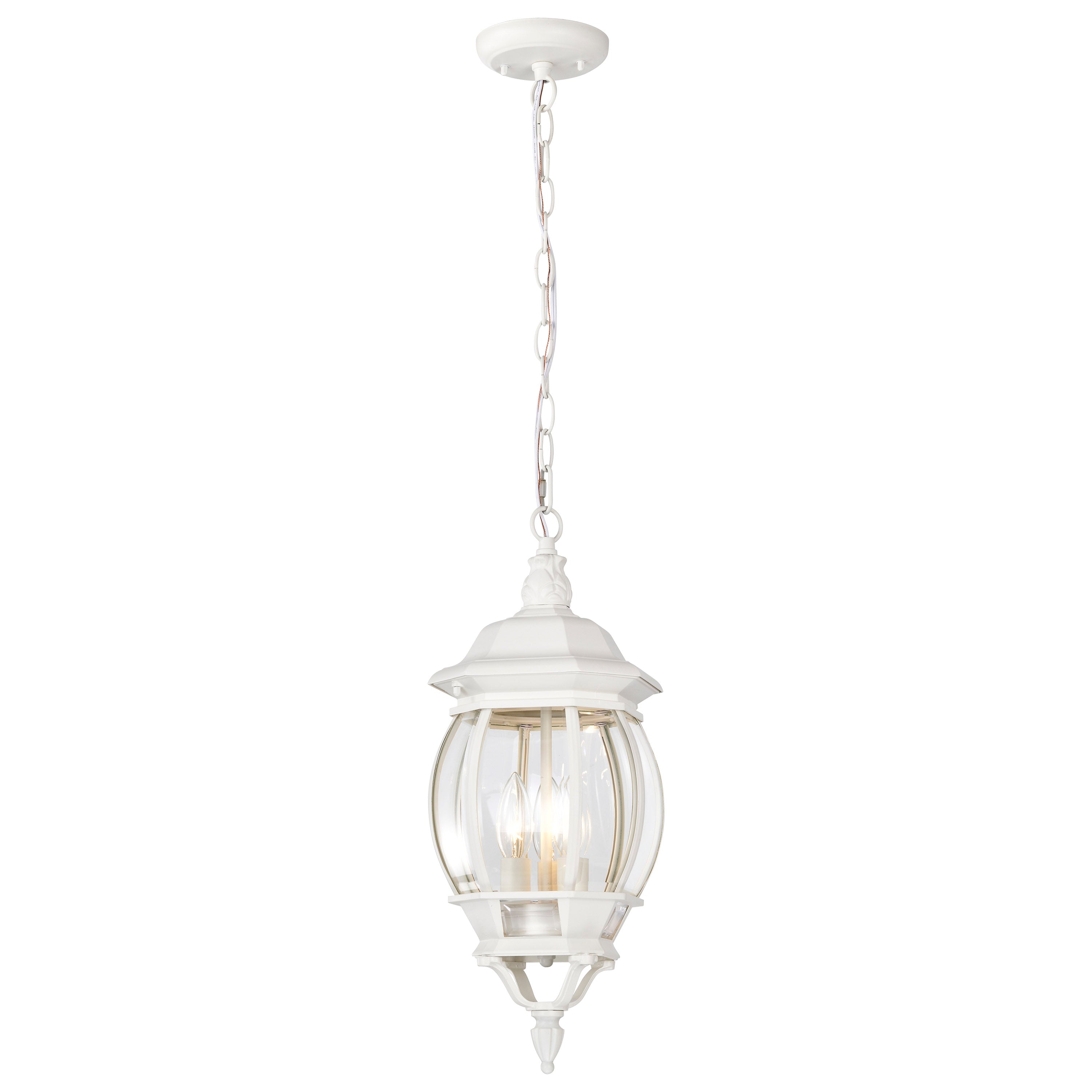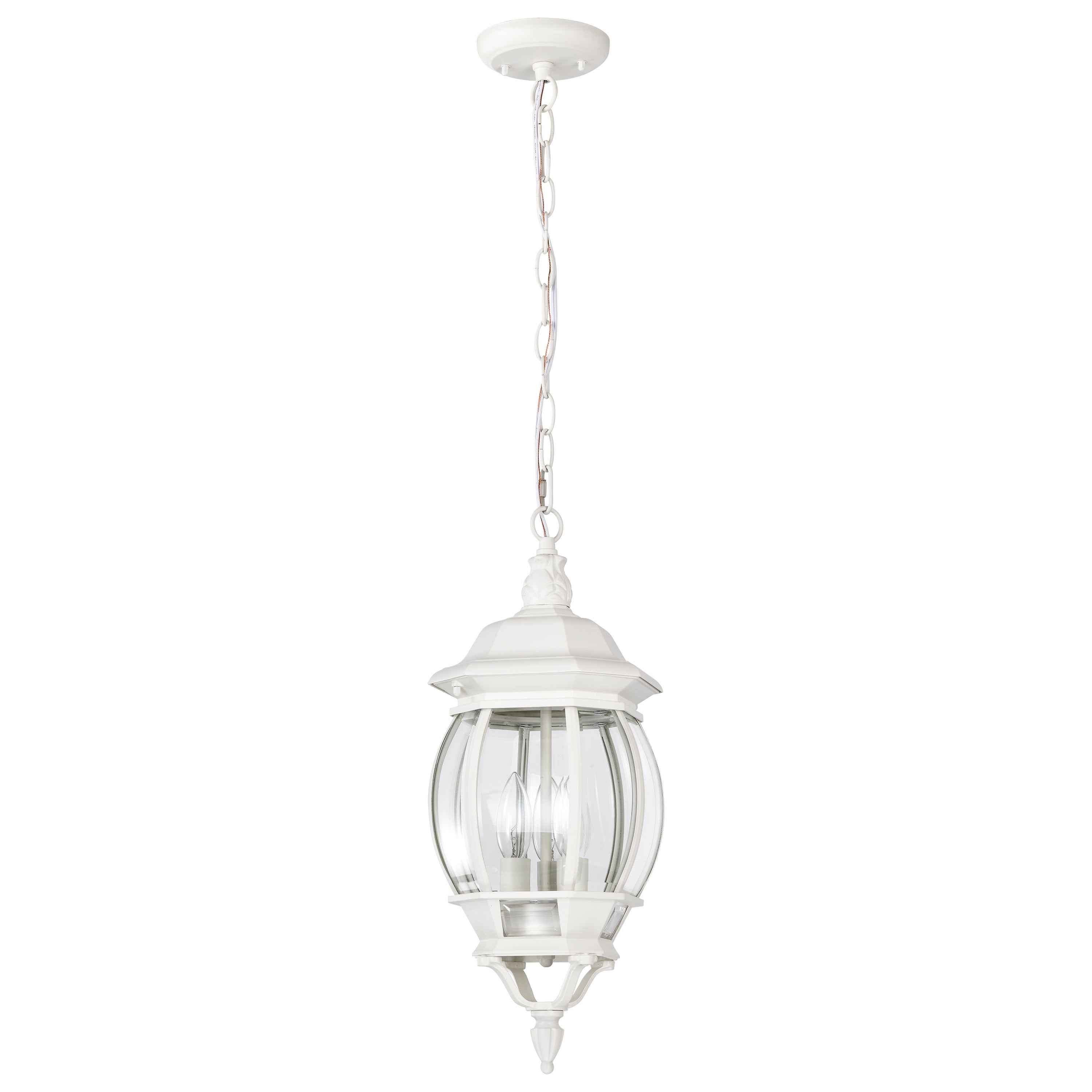 The 60-894 3 light, 20 inch outdoor hanging lantern is an elegant lighting solution for outside the home. Three bulbs sit elegantly inside clear beveled glass, surrounded by a white finished fixture. Stylish and sophisticated, this outdoor hanging lantern is a fashionable lighting solution for the exterior of the home.
