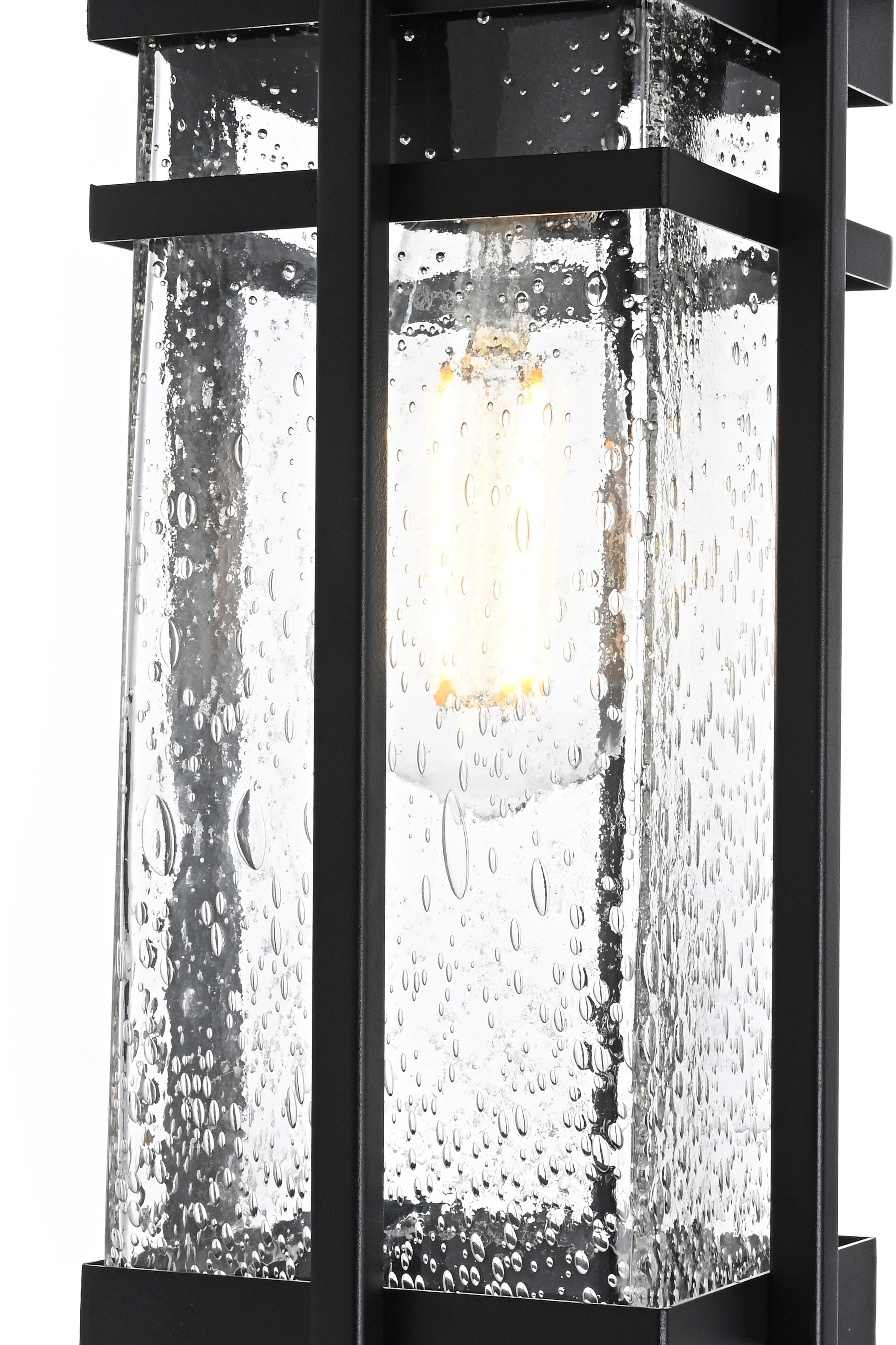 Transform your outdoor living spaces with the sleek elegance of this pendant light, designed to bring modern charm and functionality to your exterior decor. The stylish rectangular frame, finished in matte black, is paired with clear seeded glass panels that diffuse light beautifully, adding texture and inviting warmth to your porch, patio, or entryway. The visible bulb design enhances the pendant's overall appeal, making it perfect for use with decorative filament bulbs. With an adjustable chain for customizable height and weather-resistant construction, this pendant light is built to withstand the elements while providing a stylish glow. ETL certified for wet locations, it offers reliable performance in all outdoor conditions, making it a perfect choice to illuminate and elevate your outdoor spaces.