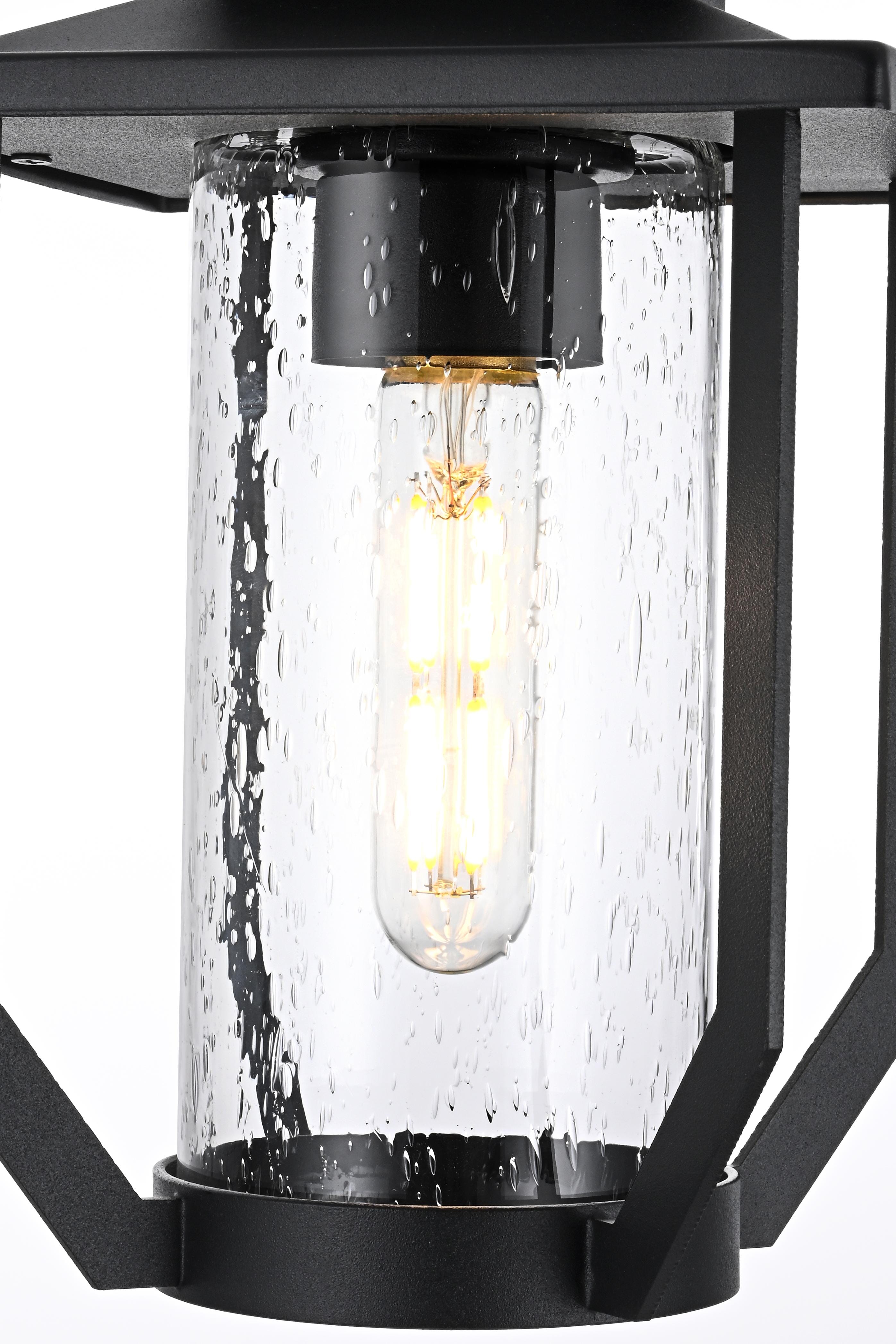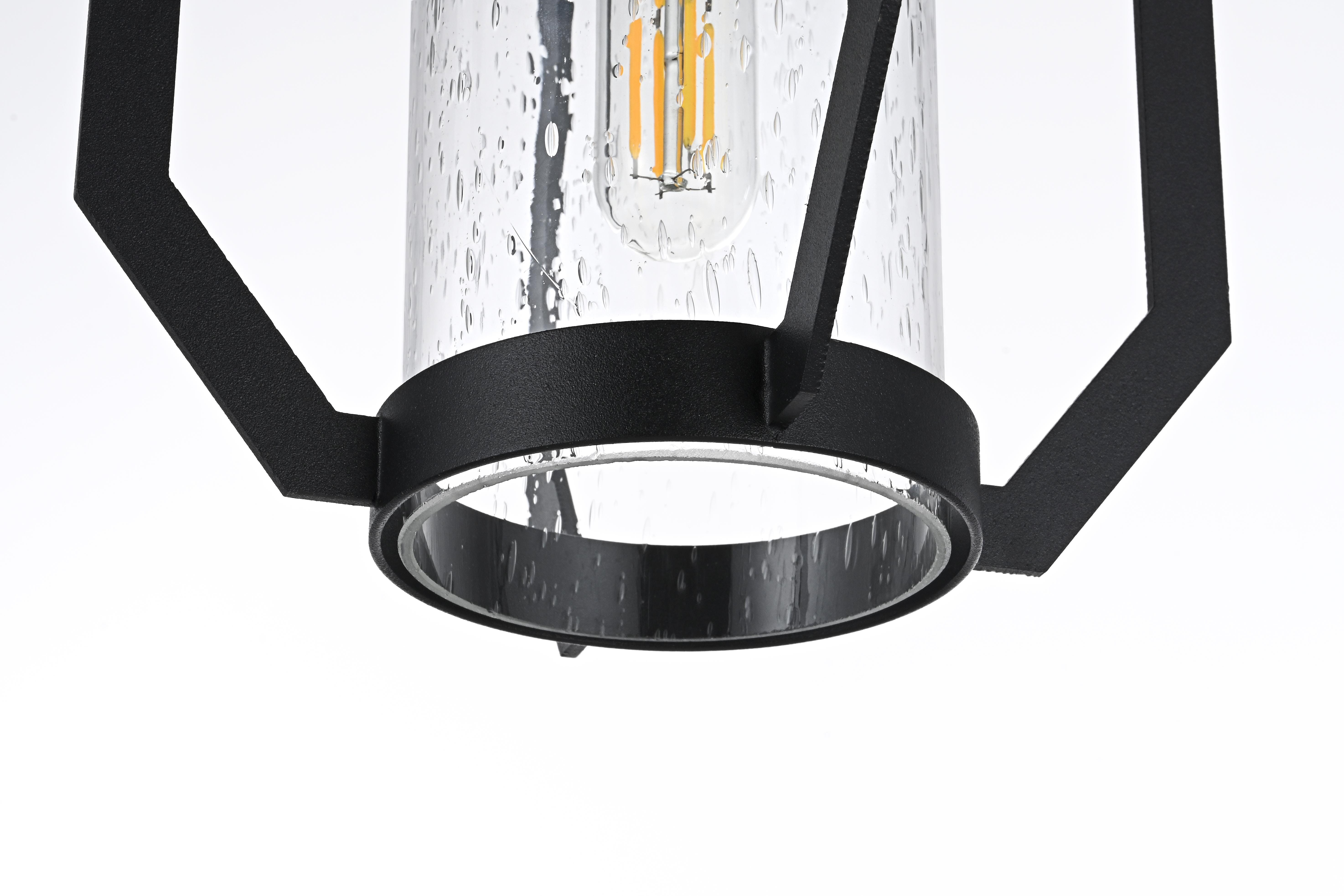Elevate your outdoor decor with this stunning geometric outdoor pendant light. Featuring a unique open-frame design with sleek angular arms and a clear seeded glass shade, this pendant offers a striking mix of modern and classic aesthetics. The matte black finish gives it a versatile charm, fitting well with any style of exterior decor—from contemporary to rustic. The clear seeded glass adds texture and beauty, creating a soft, warm light that enhances your porch, patio, or entryway. Built with durable, weather-resistant metal and certified for wet locations, this pendant light is both stylish and built to last. The adjustable chain offers flexibility in hanging height, making it perfect for various outdoor settings. Illuminate your exterior spaces with elegance and charm, and create a welcoming atmosphere for guests and family alike.