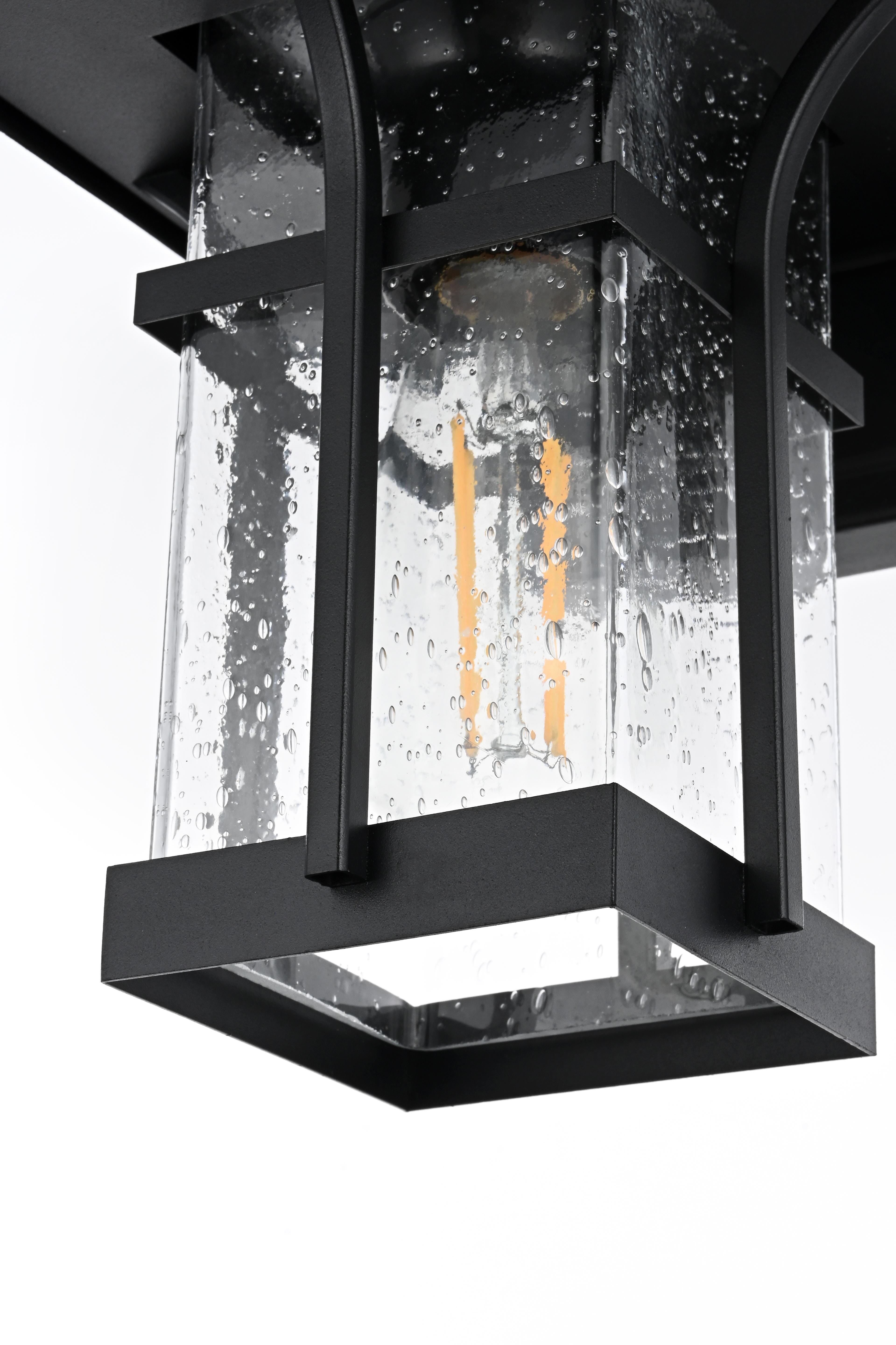 Introduce a modern aesthetic to your outdoor space with this beautifully crafted wall sconce, featuring an E26 socket. The sconce is made of a sturdy iron frame, finished in matte black, and complemented by clear glass panels that allow ample light to illuminate your entryway or garden path. Designed with a unique flared top and graceful arching supports, this piece brings a touch of architectural interest to your home's exterior. The rugged iron construction ensures longevity, while the seeded glass encases the bulb to create a sophisticated play of light and shadows, making this wall sconce both a functional and decorative feature for your outdoor living area.