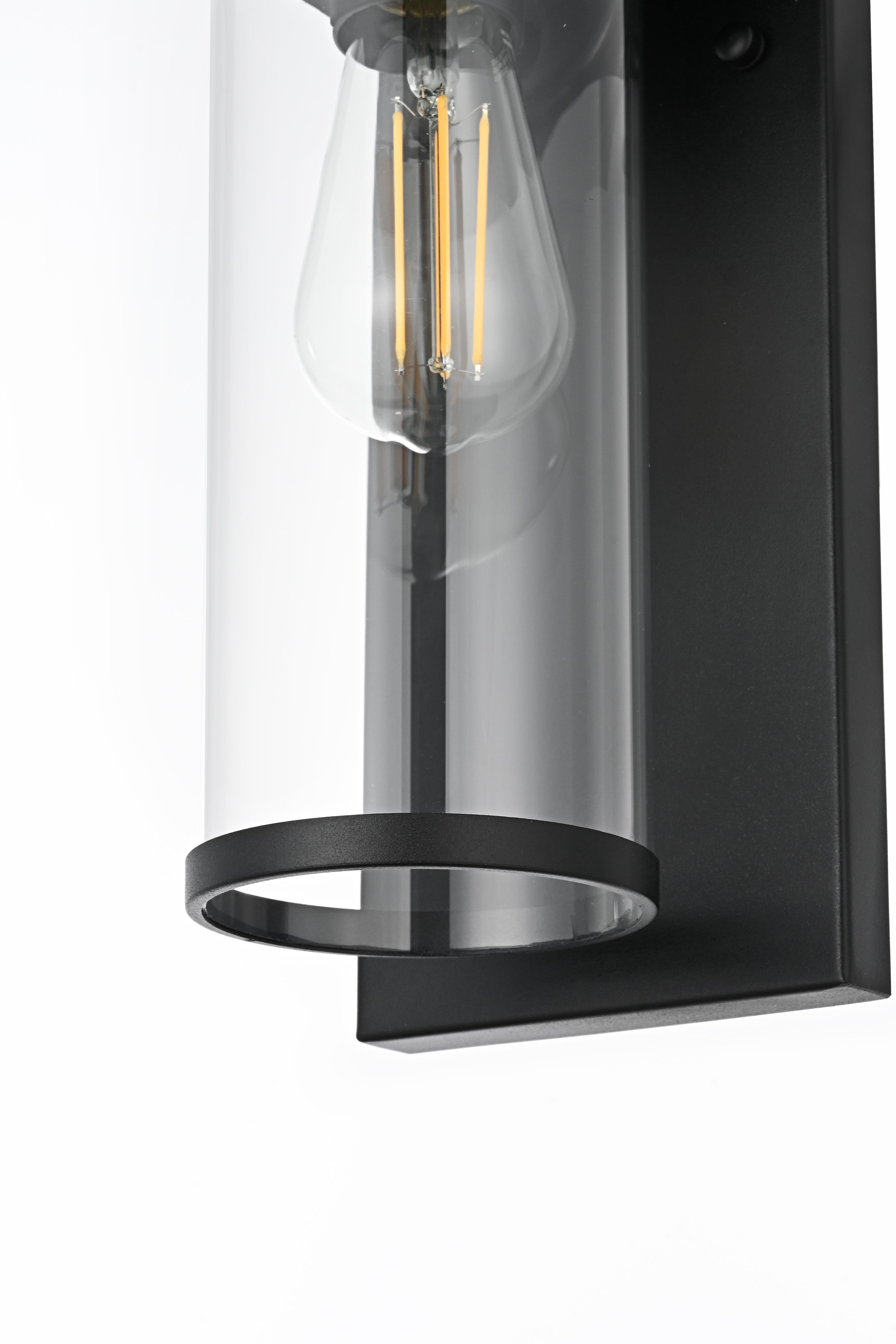 Bring a refined touch to your outdoor spaces with this modern wall sconce, thoughtfully designed to enhance any exterior setting. Constructed from robust iron, this wall sconce features a unique combination of cylindrical glass that culminates in a sophisticated metal ring trim, and a structured top composed of two sleek square sheets. The slim, extended backplate offers clean lines that perfectly complement the architectural elements of the fixture. The E26 socket accommodates various bulb types, letting you create your ideal level of lighting. Whether you want to brighten an entryway or add a decorative touch to a garden path, this sconce merges durability and striking style for an ideal outdoor lighting solution.