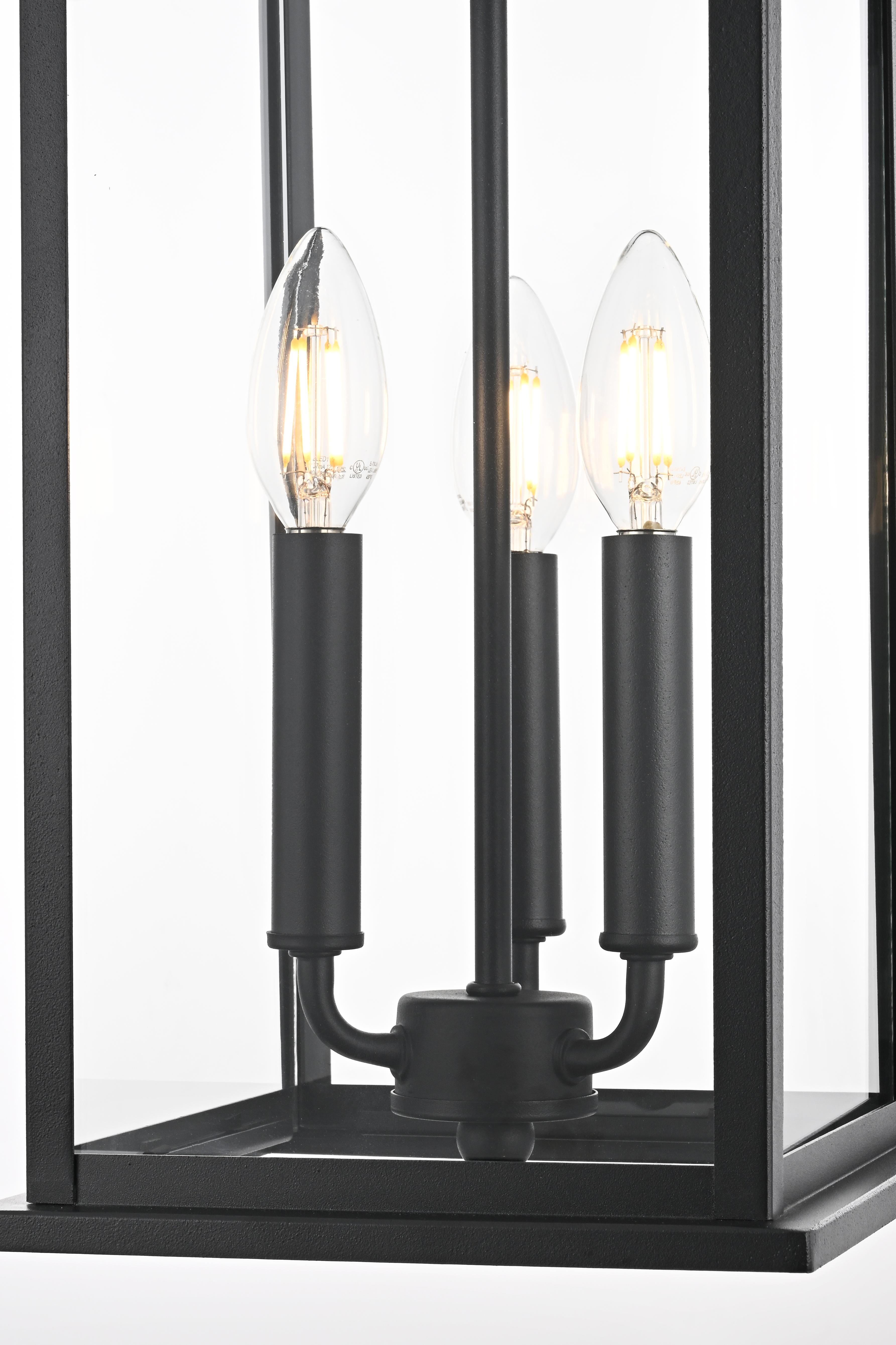 Add a striking centerpiece to your outdoor space with this exquisite hanging pendant light. Crafted from durable iron and clear glass, its tall, rectangular lantern design with a gracefully tapered roof exudes classic sophistication. The three candelabra-style bulbs offer a warm, radiant glow, amplified by the clear glass panels. Suspended by an adjustable matte black chain, this pendant light is as functional as it is visually captivating, making it an ideal choice for entryways, patios, or porches. Its weather-resistant build ensures it remains a standout feature season after season.