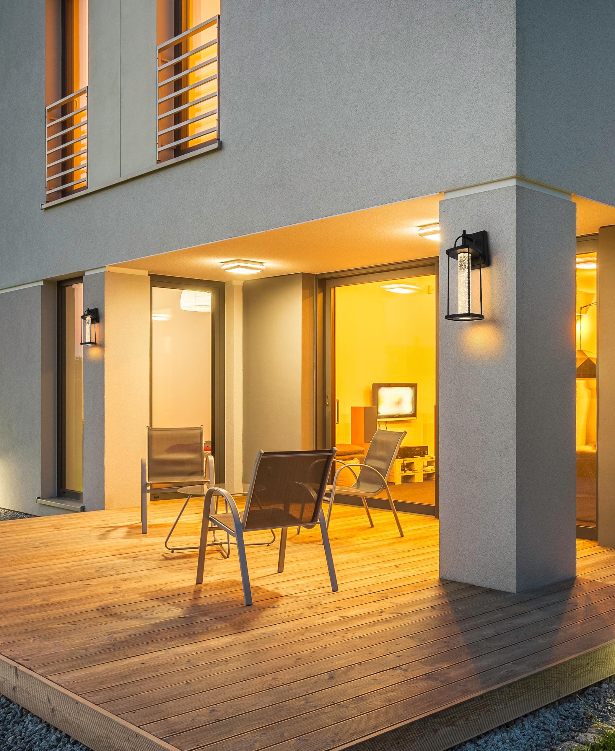 Elevate your outdoor space with this stunning LED Wall Sconce, a perfect blend of modern sophistication and timeless appeal. The black-finished iron and aluminum frame exudes contemporary elegance, while the thick 2-inch clear seedy glass cylinder enhances the ambiance with its unique texture and sparkling glow. Designed for both style and function, this sconce features an integrated 11W LED, delivering a warm 3000K light at 430 lumens for a welcoming atmosphere. Its dimmable feature lets you adjust brightness to suit any occasion. Built for durability and weather resistance, the ETL Wet Rated design ensures reliable performance in outdoor environments, making it ideal for entryways, patios, or garage exteriors. With a 120-degree beam angle and 90 CRI, it casts a wide, natural light, enhancing your home’s curb appeal. Hardwired for stability and easy installation, this statement fixture is a must-have for modern homes. Upgrade your outdoor lighting with this sleek, durable marine-grade wall sconce Perfect for adding a touch of elegance and long-lasting performance to your coastal or outdoor space.