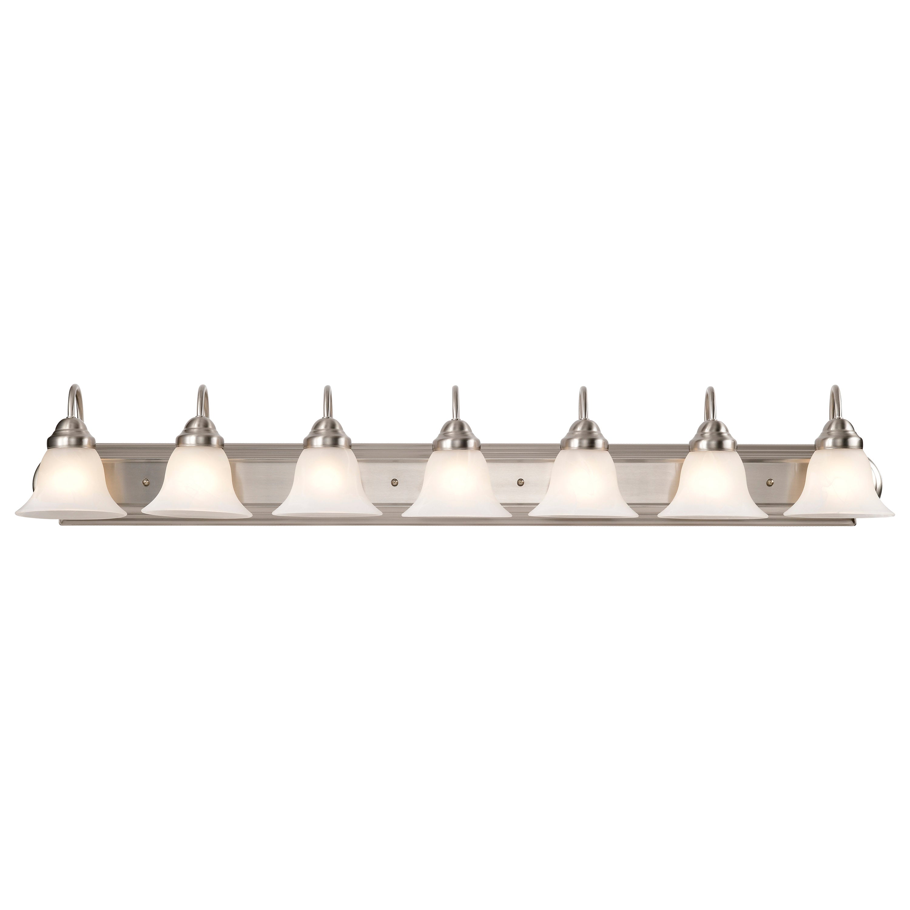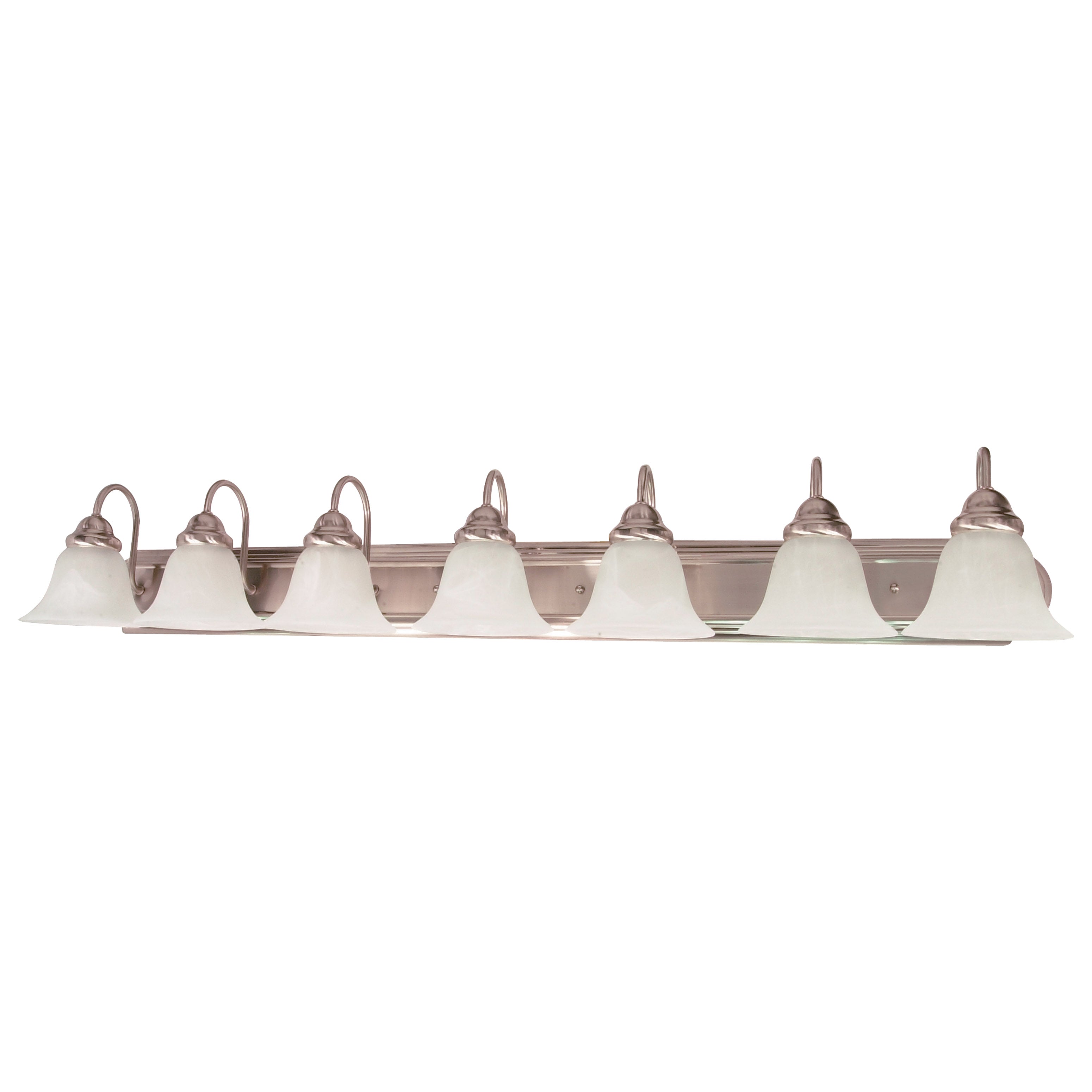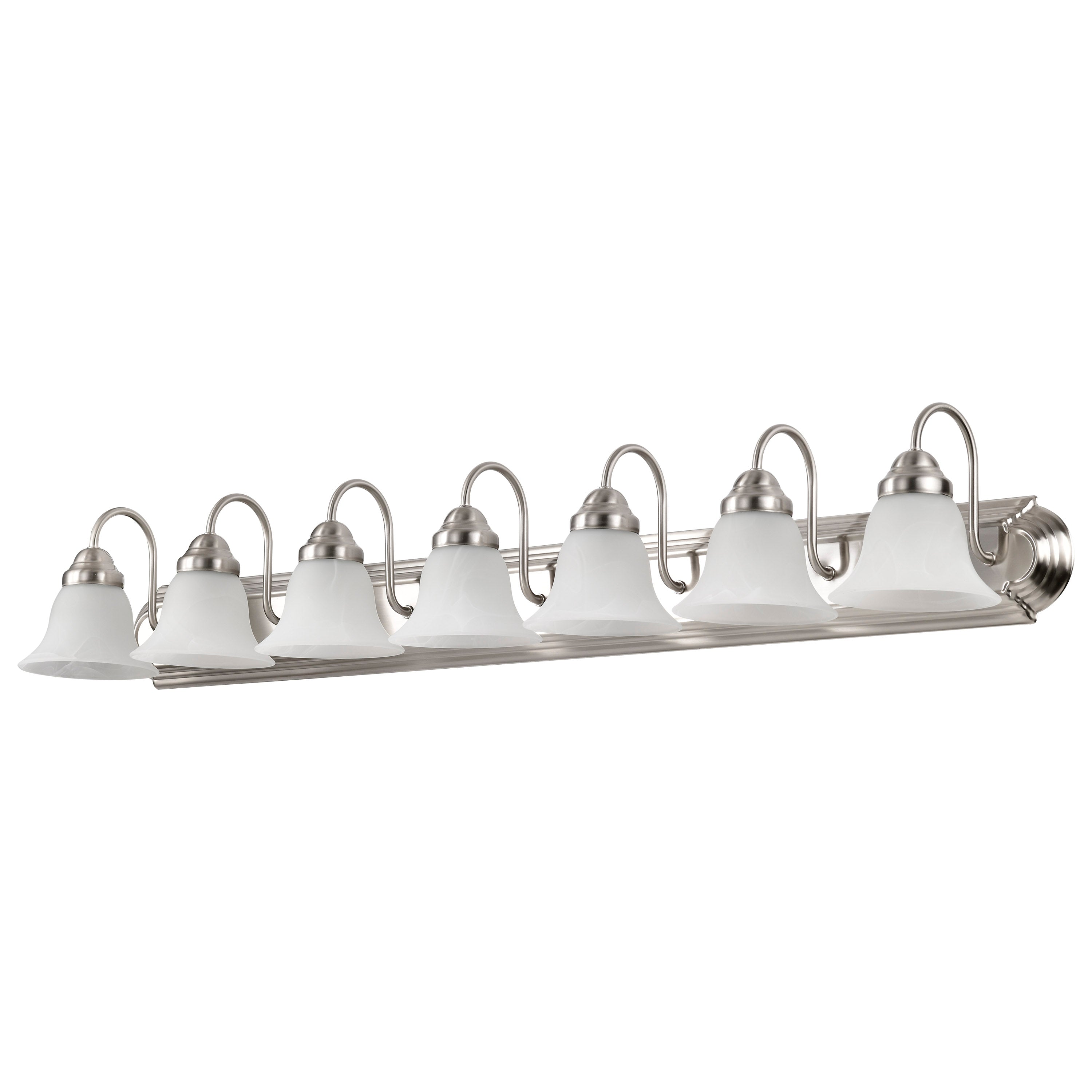 The Ballerina 7 light, 48 inch vanity fixture features a brushed nickel finish, accented with alabaster glass bell shades. Illuminate bathrooms, hallways, and foyers with this elegant lighting solution for the home. Sleek and traditional, impress your guests with this seven light vanity.