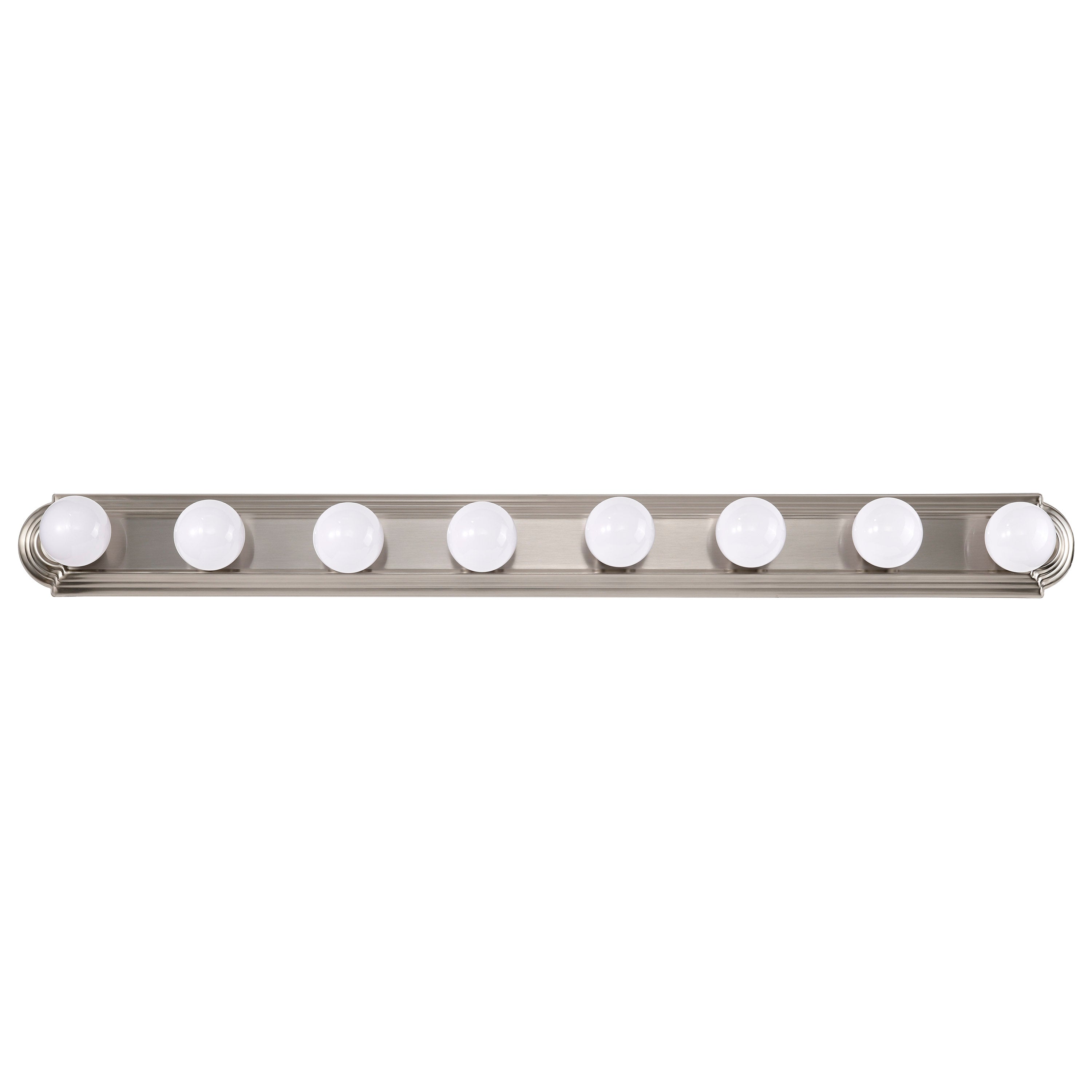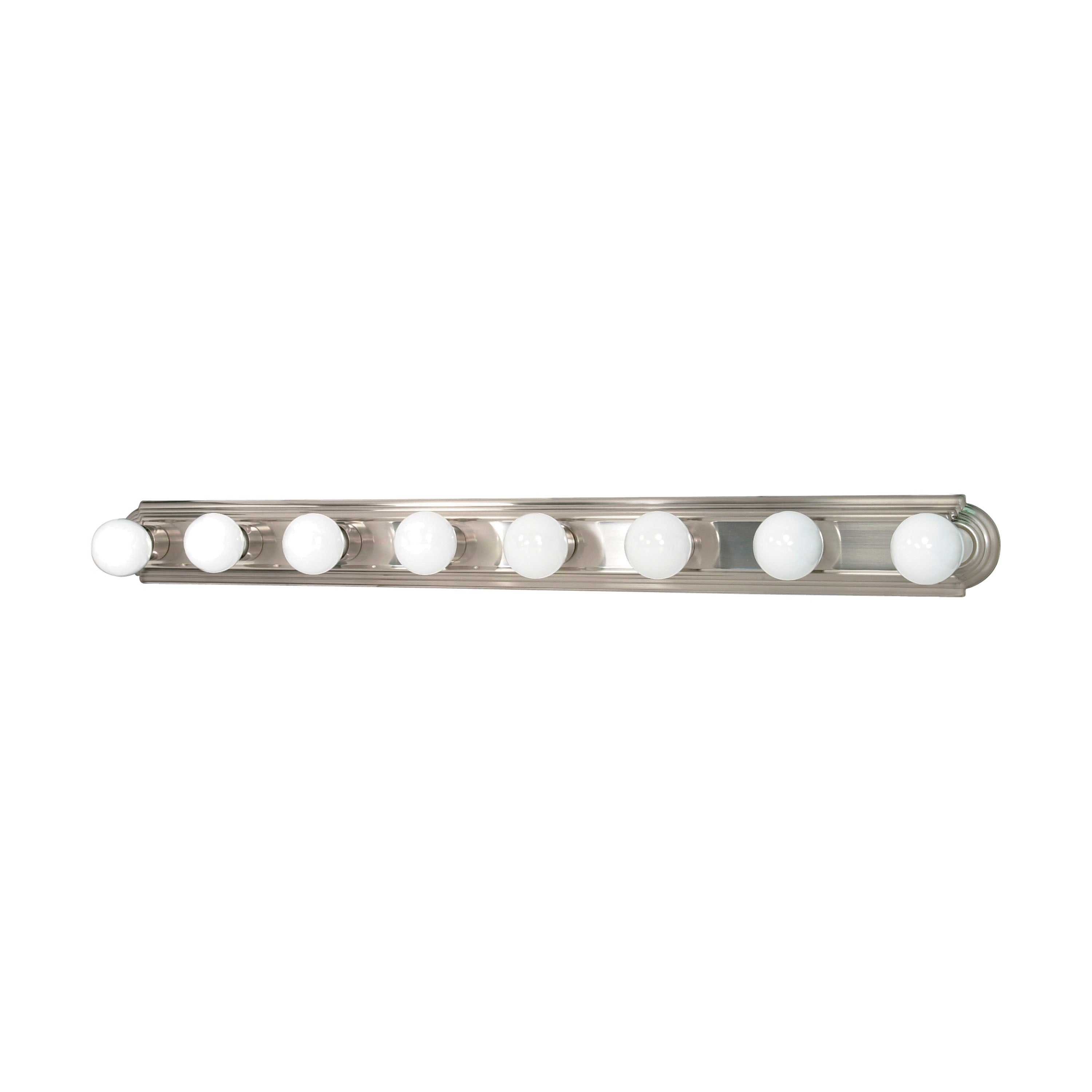 Satco's 100-watt, 8 light racetrack vanity is an elegant lighting solution for the home. Illuminate your bathroom, hallway or other interior spaces with the perfect combination of form and function. Designed to cast a soft white light over a wide area, this fixture, available in polished chrome, brushed nickel, old bronze, polished brass, and traditional white finishes is sure to impress your guests with its style and elegance.