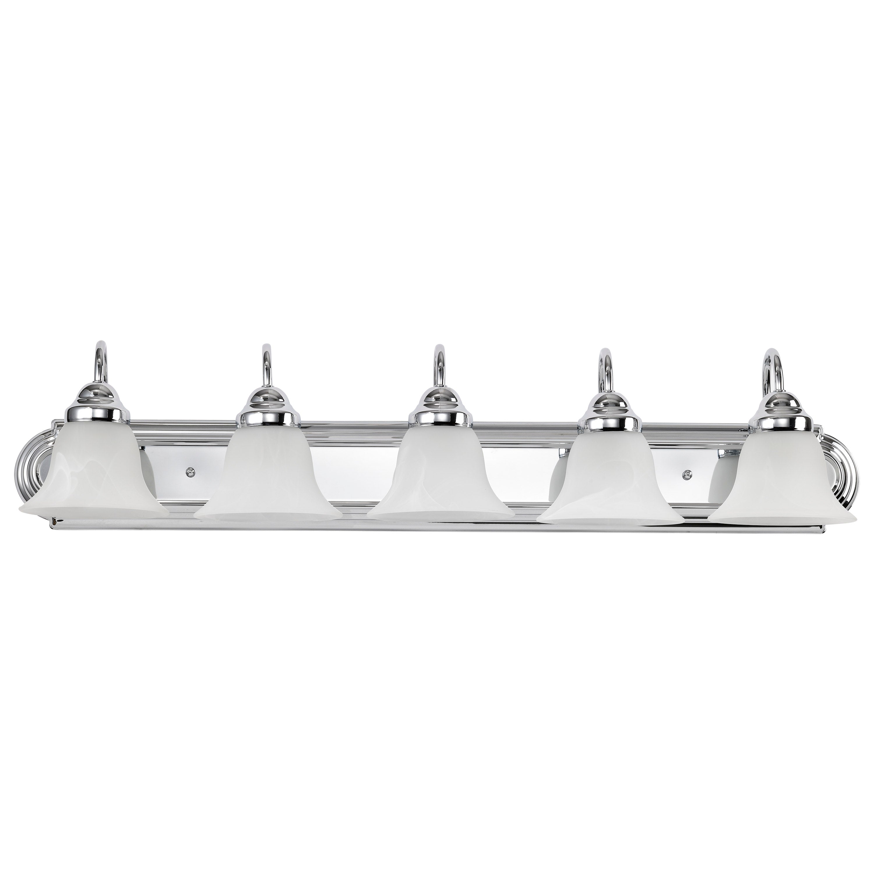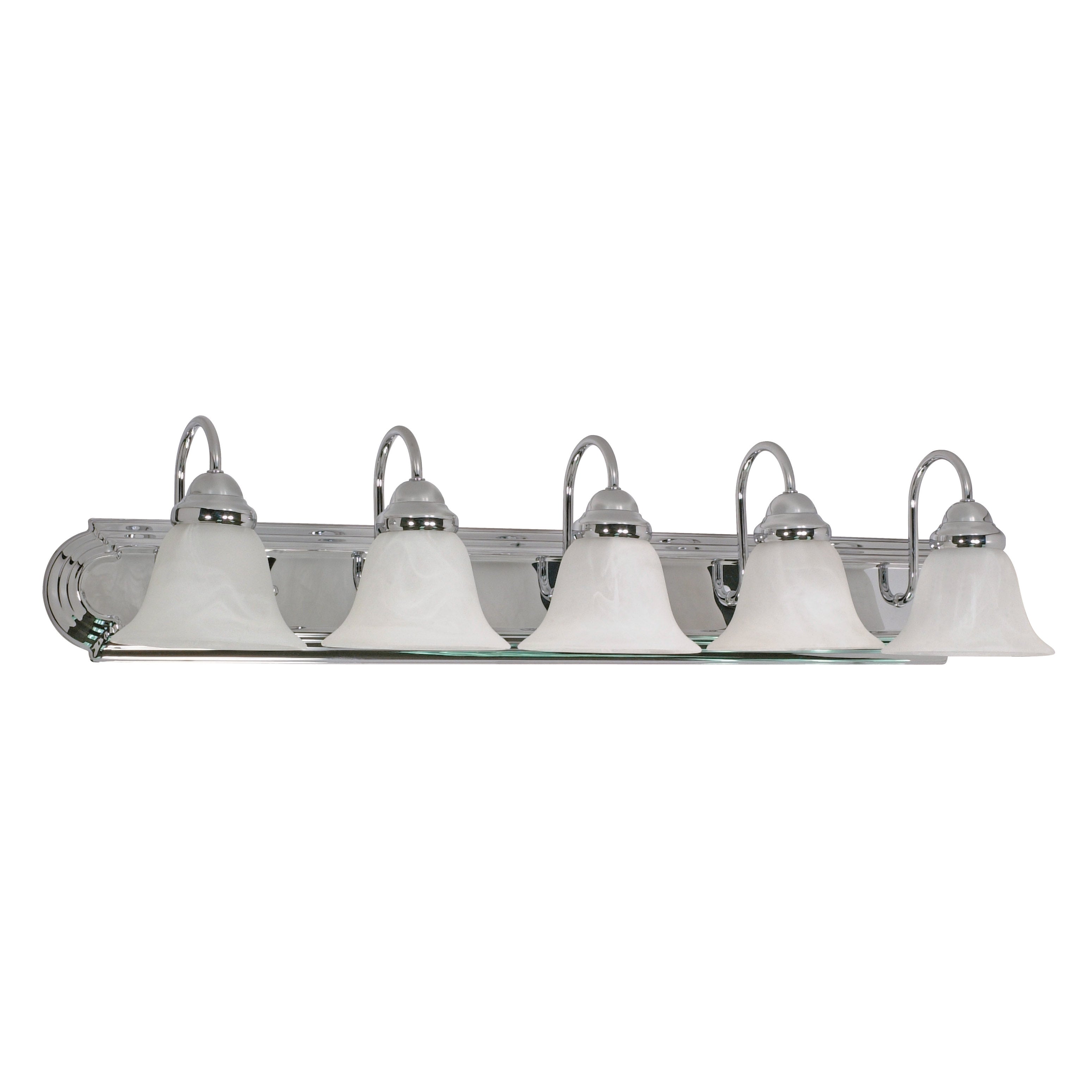 The Ballerina 5 light, 36 inch vanity features a polished chrome finish, accented by alabaster glass bell shades. Illuminate bathrooms, foyers, or any room in the home that could use some extra lighting with this five light vanity. Stylish and elegant, impress your guests with this sophisticated vanity fixture.