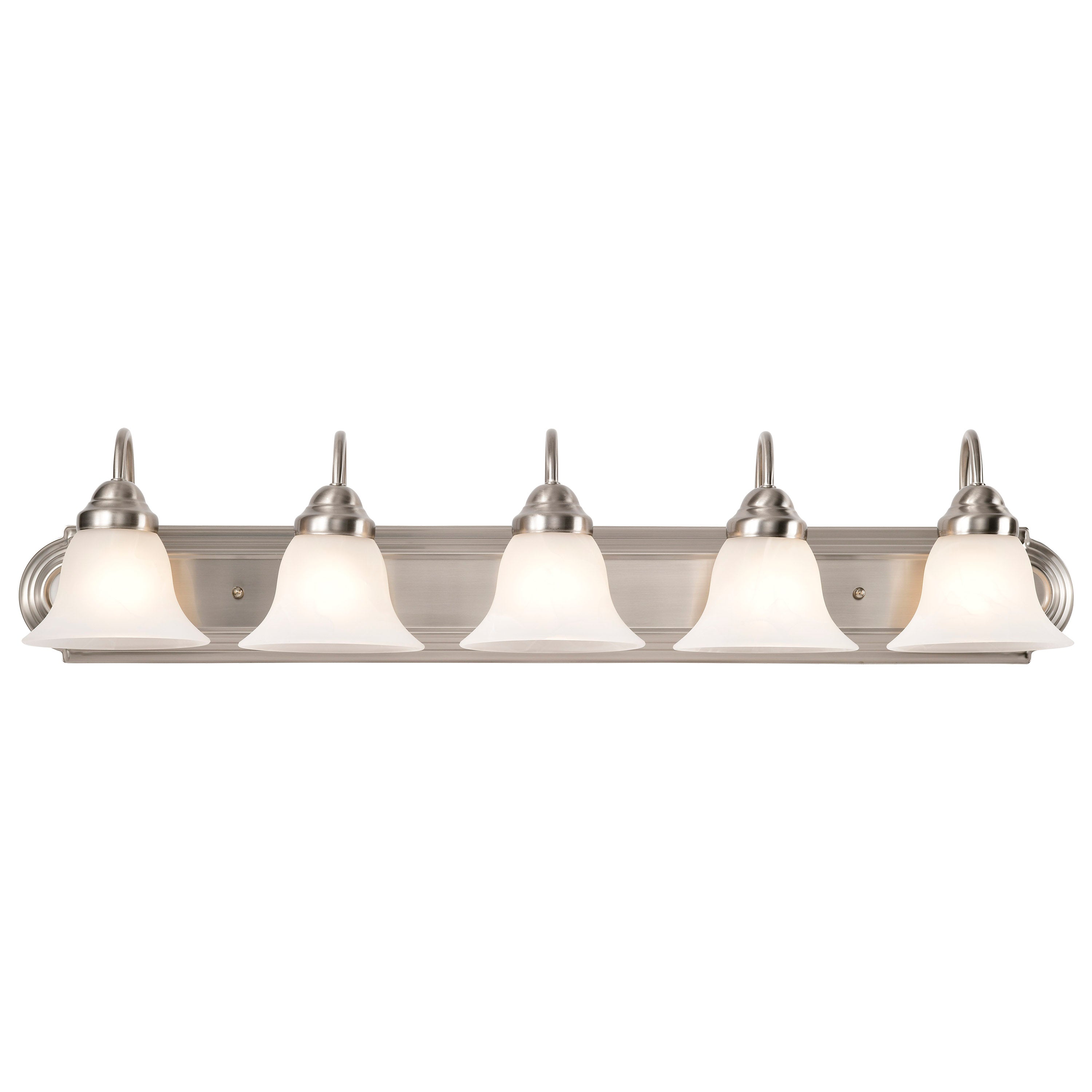 The Ballerina 5 light, 36 inch vanity features a brushed nickel finish, accented by alabaster glass bell shades. Illuminate bathrooms, foyers, or any room in the home that could use some extra lighting with this three light vanity. Stylish and elegant, impress your guests with this sophisticated vanity fixture.
