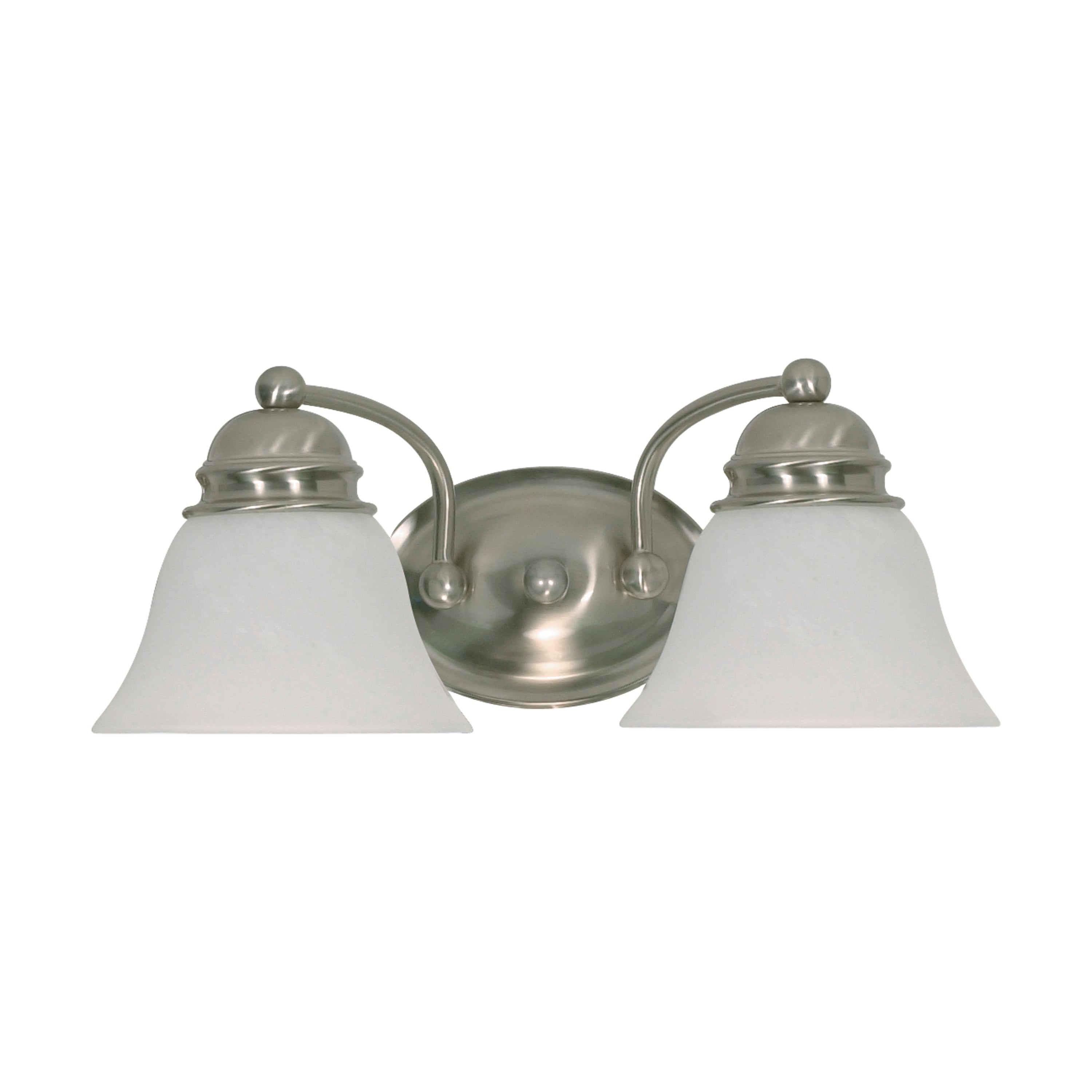 The Empire 2 light, 15 inch vanity features a brushed nickel finish, accented by alabaster glass bell shades. Illuminate hallways, foyers, or any room in the home that could use some extra lighting with this easy to install vanity. Stylish and elegant, impress your guests with this sophisticated vanity fixture.