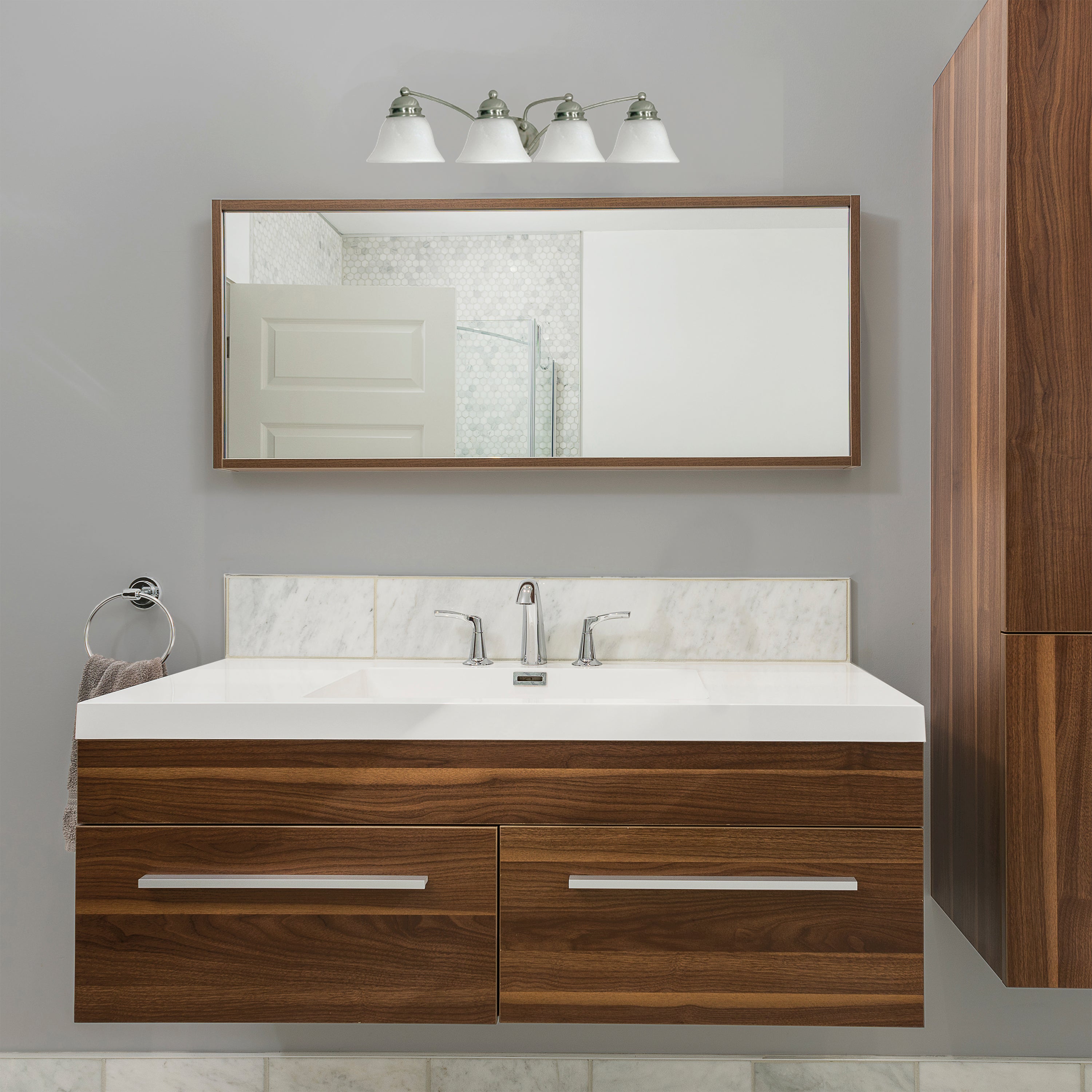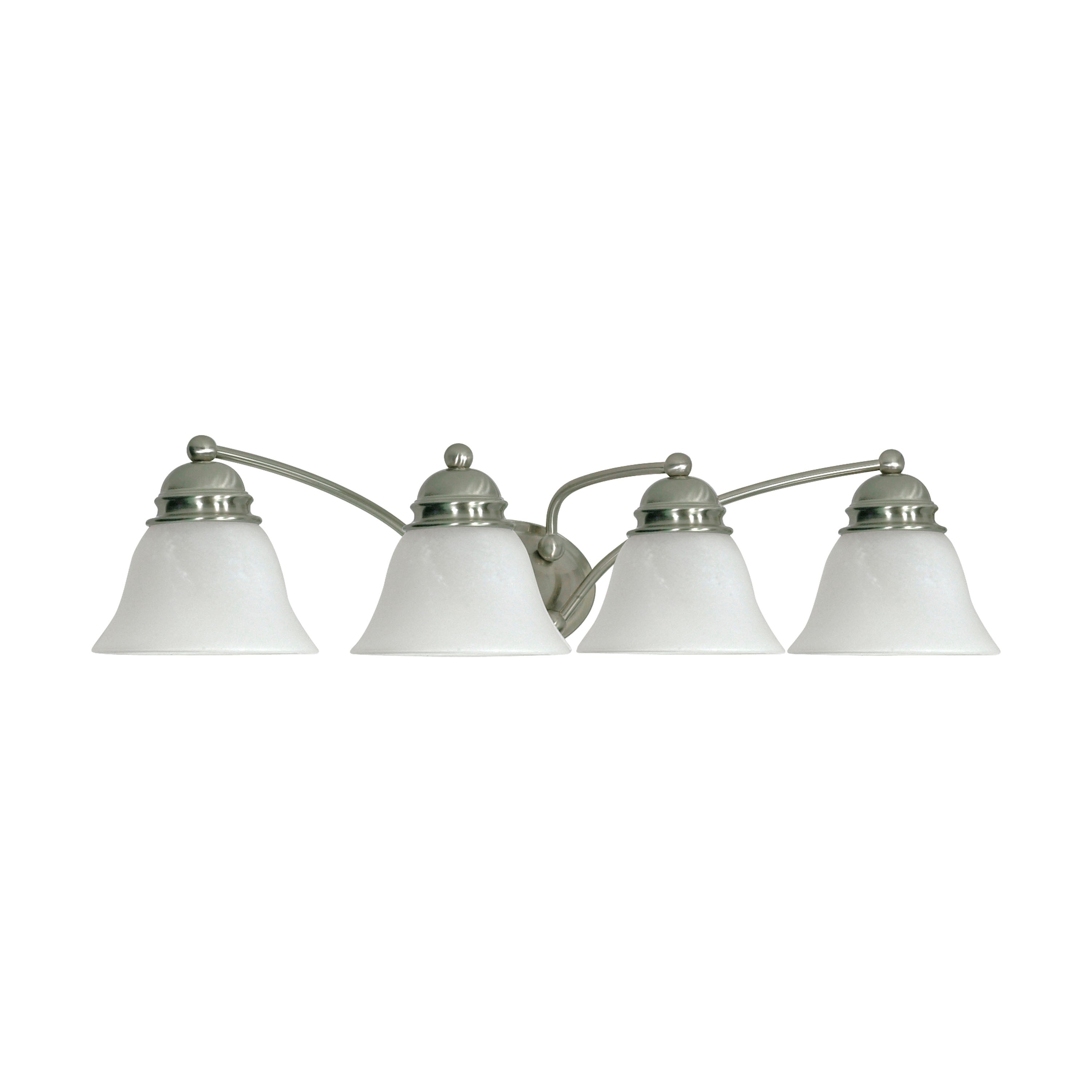 The Empire 4 light, 29 inch vanity features a brushed nickel finish, accented by alabaster glass bell shades. Illuminate hallways, foyers, or any room in the home that could use some extra lighting with this easy to install vanity. Stylish and elegant, impress your guests with this sophisticated vanity fixture.