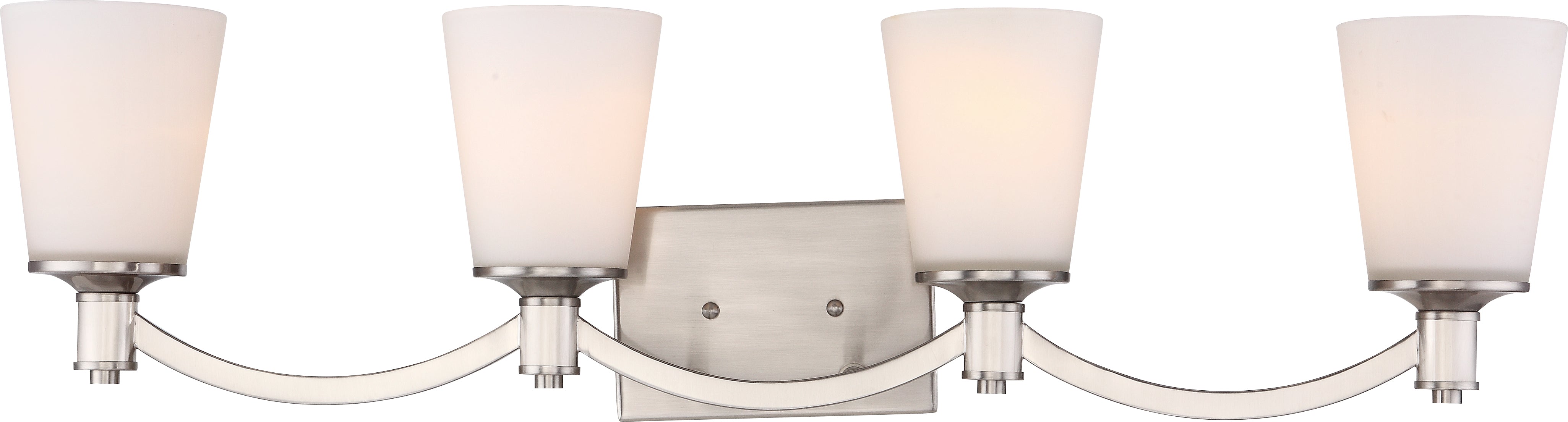 Nuvo's Laguna 4 light vanity fixture is an elegant lighting solution for inside the home. Illuminate dining rooms, living rooms, hallways, and foyers, with this brushed nickel vanity fixture. Four A19 bulbs are featured inside the white glass of this stylish vanity fixture that can be installed either up or down. Traditional and versatile, the Laguna collection adds style to any home decor.