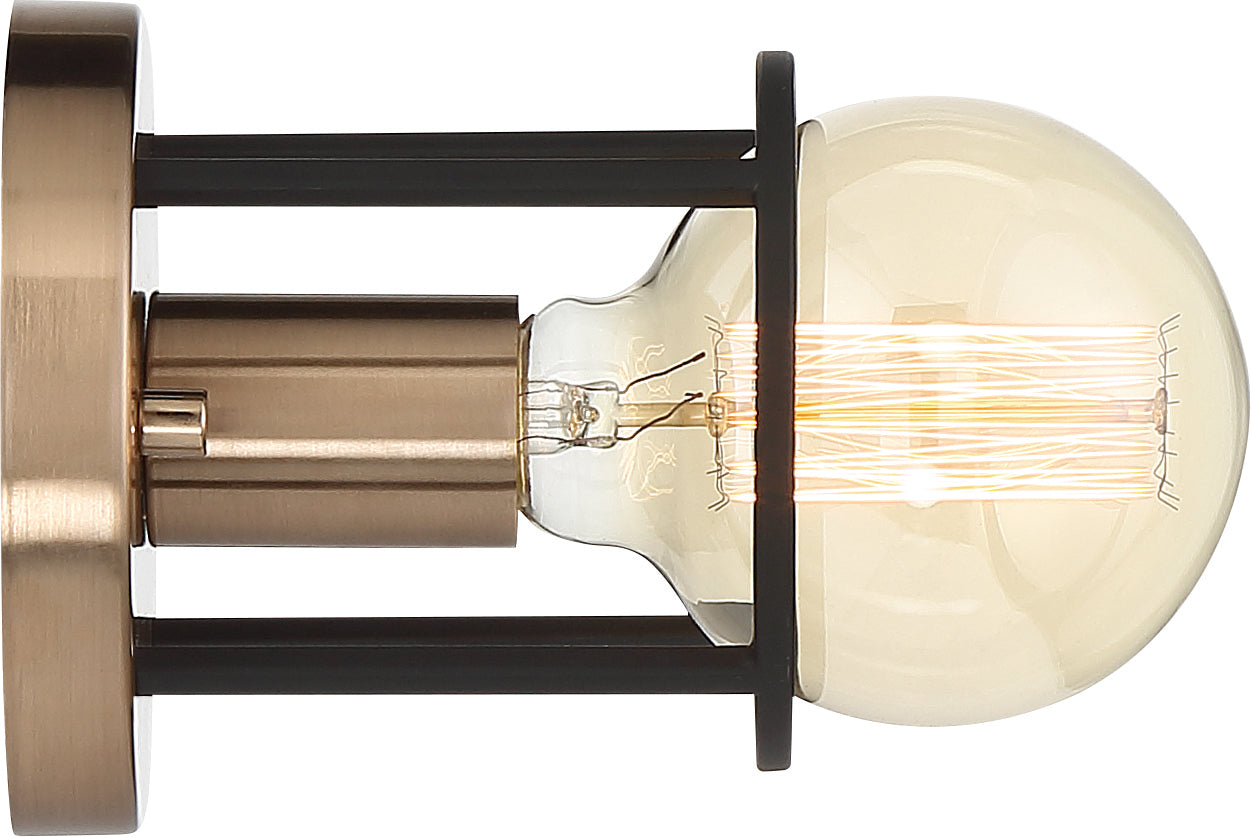 The Chassis 1 light wall sconce is a stylish lighting solution for the home. The industrial modern open concept shows off the vintage G25 Edison bulb surrounded by a singular matte black frame against a brushed brass backdrop finished in copper. Elegant and eye-catching, this 1 light wall sconce adds style to any home.