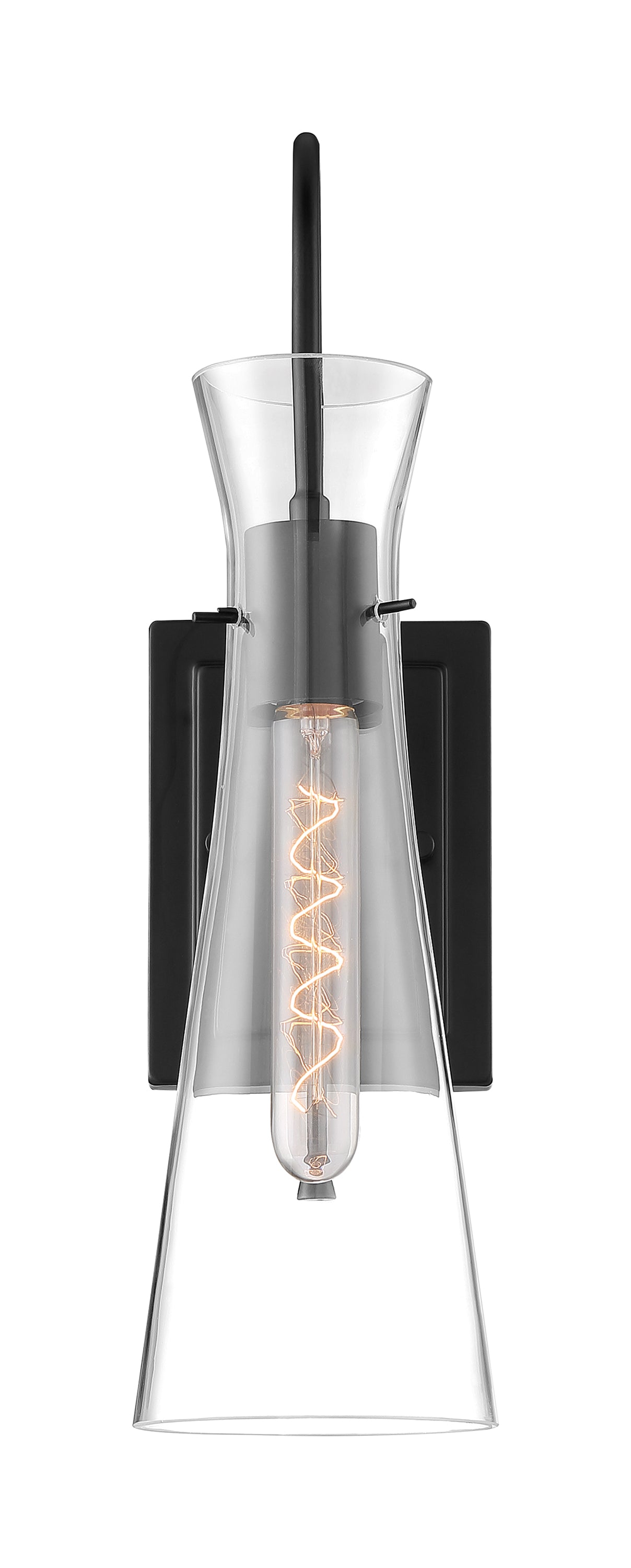 The Bahari one-light sconce sports a glass shade that resembles a tight waisted crystal clear, beaker that surrounds the single T9 light source. This provides a distinct visual appearance that is complemented by the Black finish. The 4.75 inches width and 17.5 inches overall height incorporates the glass, which is suspended by a three-point mount that extends from a delicate shepherd's hook, which extends 7 inches. The Bahari wall sconce is damp rated, making it versatile in application.