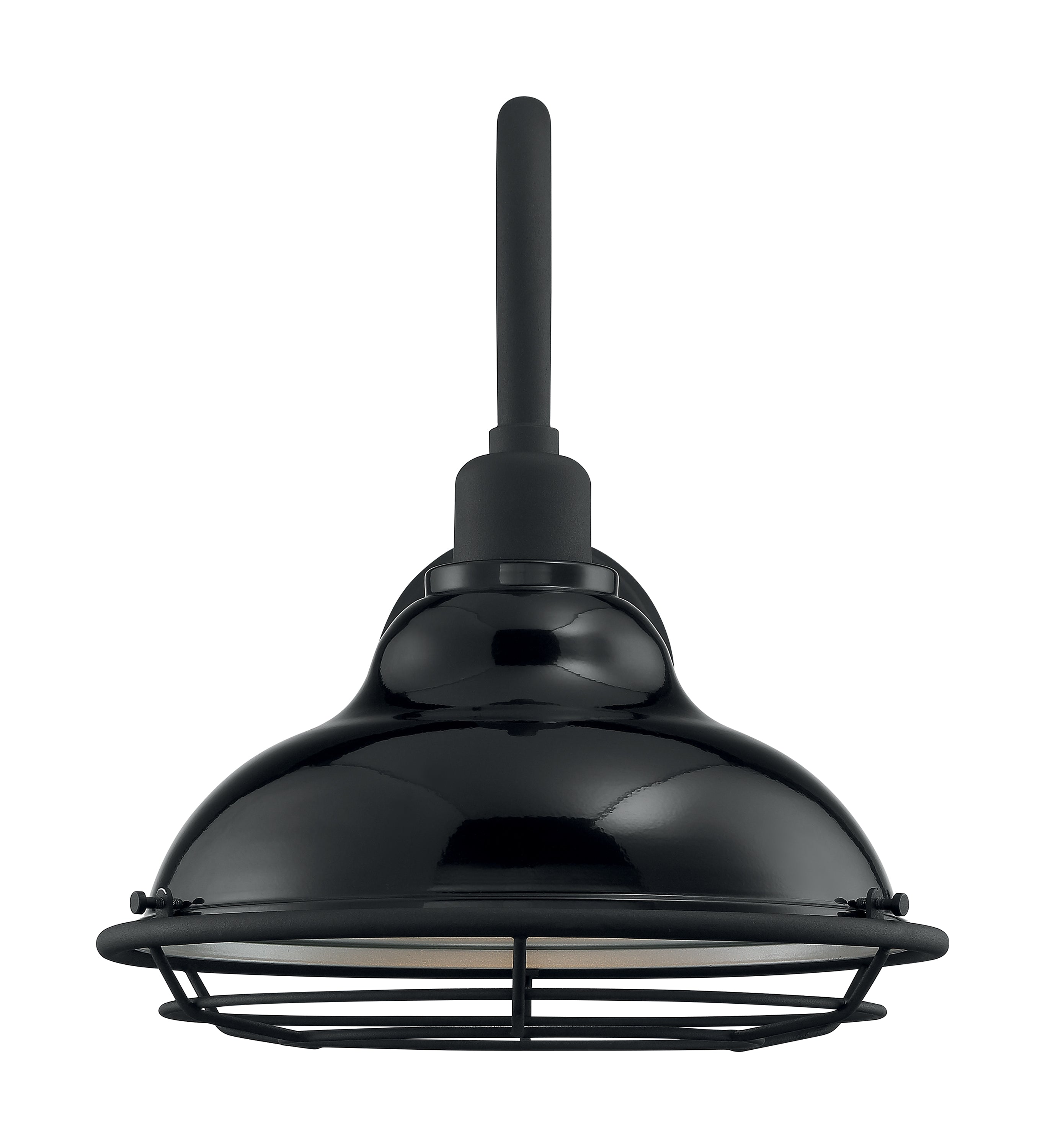 The one-light large Newbridge wall sconce is wet rated. It can be employed for both indoor and outdoor lighting applications. The Newbridge has a gooseneck arm extension that is 19.25 inches and a width of 12 inches. The choice to add the included cage will realize a true retro - industrial appearance; complemented by the Gloss and Textured Black finish, light is dispersed by the silver reflector.