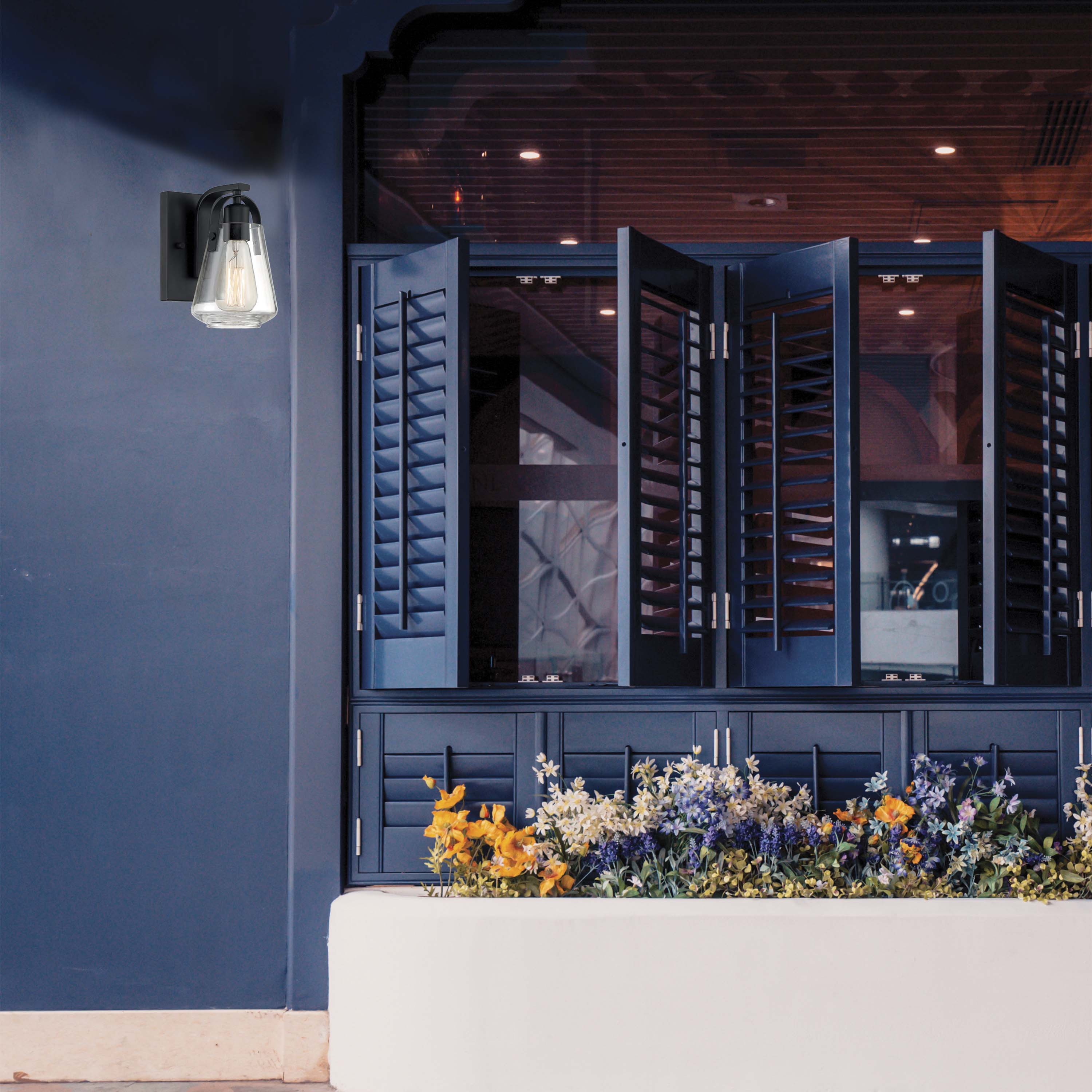 The clear glass goblet shade on the Skybridge highlights the Black finish on this one-light vanity light. The unique saddle style glass holder and geometric lines complement any transitional or modern design. Having a 5 inches width by 8.375 inches height, the Skybridge vanity light is damp rated and is the perfect light source as a hall sconce or flanking the bathroom mirror.