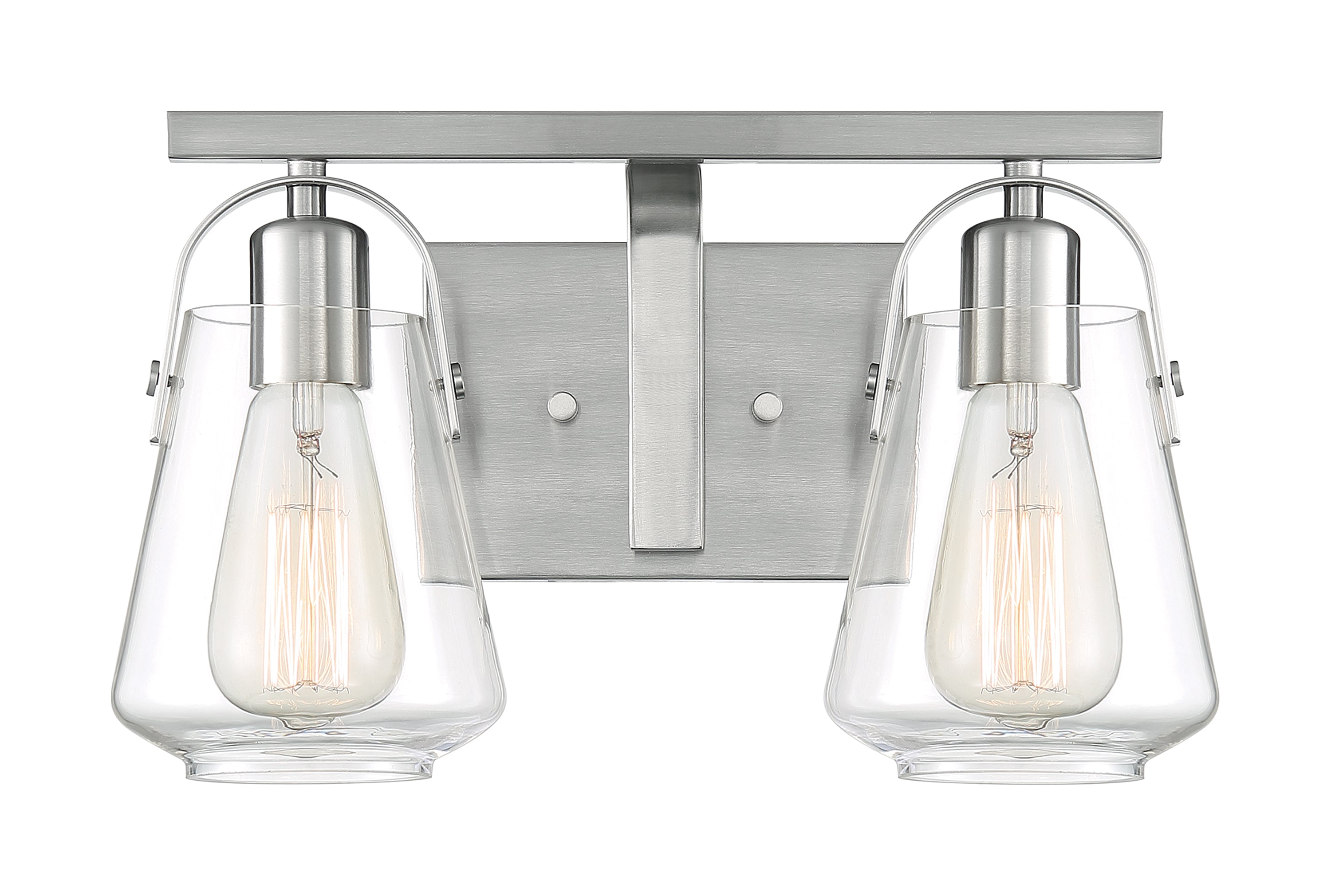 The clear glass goblet shade on the Skybridge highlights the Brushed Nickel finish on this two-light vanity light. The unique saddle style glass holder and geometric lines complement any contemporary or modern design. 14.125 inches in width by 8.375 inches in height, the Skybridge vanity light is damp rated and is the perfect light source over the bathroom mirror.
