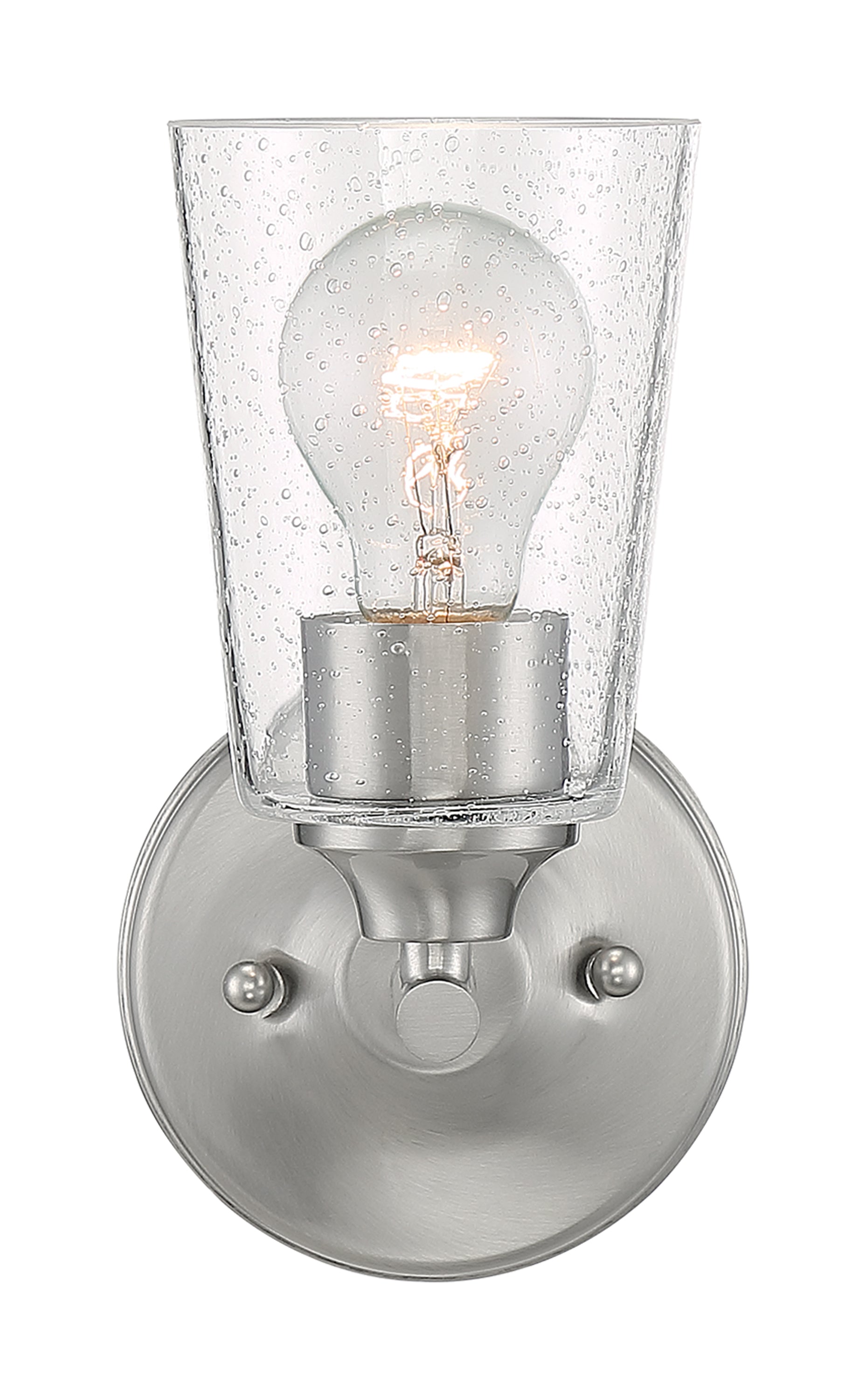 The seeded glass goblet shade accents the Brushed Nickel finish on the Bransel one-light vanity light. The sleek, streamlined appearance of the Bransel compliments both the popular modern farmhouse style or can be at home in a coastal setting. 4.875 inches wide by 8.875 inches high, the Bransel is damp rated and is the perfect light source flanking the bathroom mirror, and can be positioned either up or down.