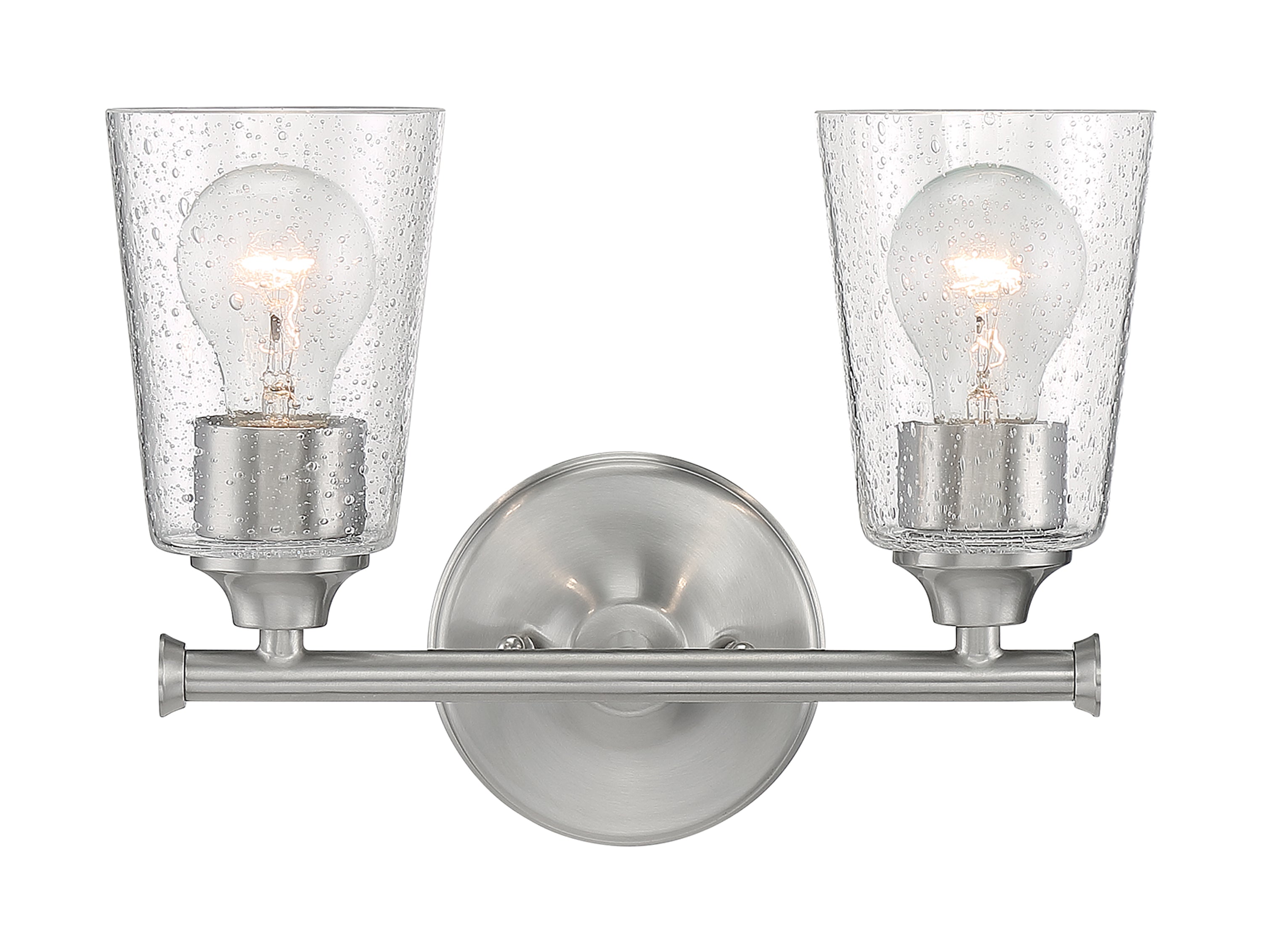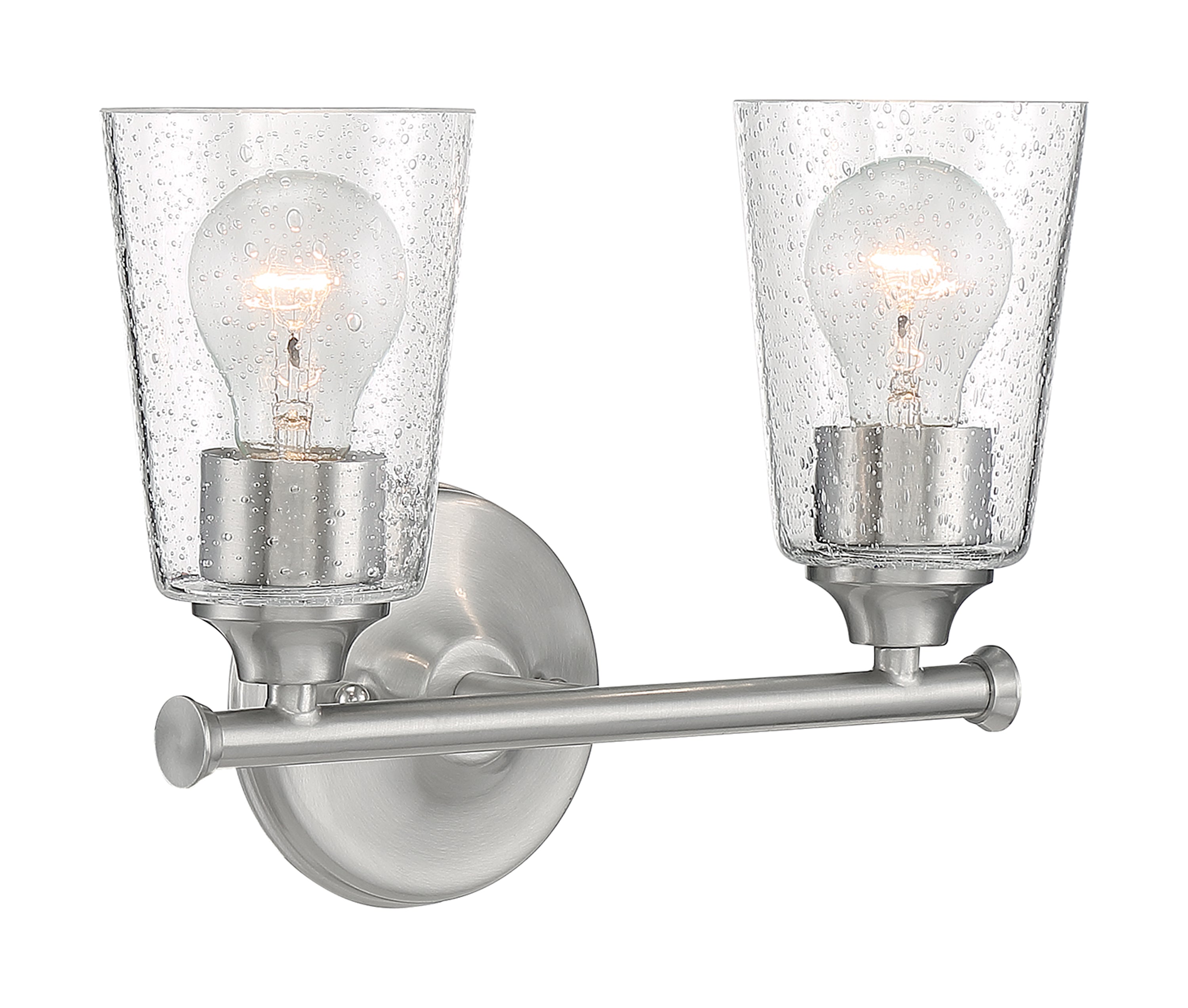 The seeded glass goblet shade accents the Brushed Nickel finish on the Bransel two-light vanity light. The sleek, streamlined appearance of the Bransel compliments both the popular modern farmhouse style or can be at home in a coastal setting. 12 inches wide by 8.875 inches high, the Bransel is damp rated and is perfect over the sink light source for the bath, and can be positioned either up or down.