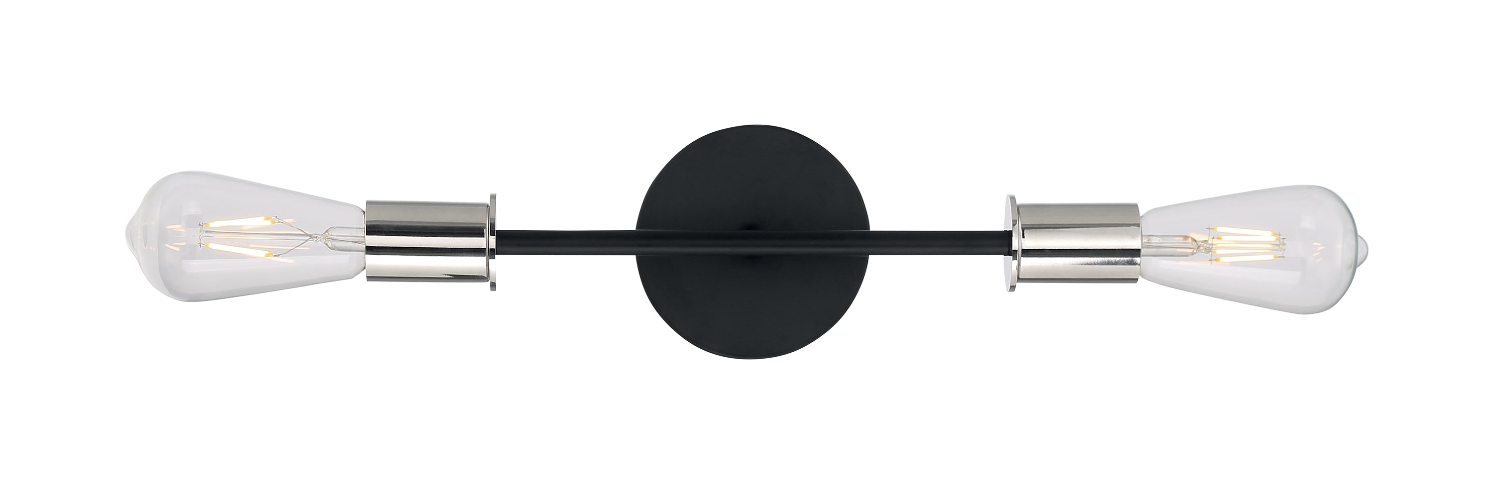 The Ryder two-light vanity is the retro-industrial bare bulb version of an over-mirror vanity light. The two-tone black and polished nickel finish is perfect for both industrial modern and minimalist designs. The coordinating finished socket enclosure adds to the vanity lights design while This provides a smooth transition to your selected nostalgic bulb.