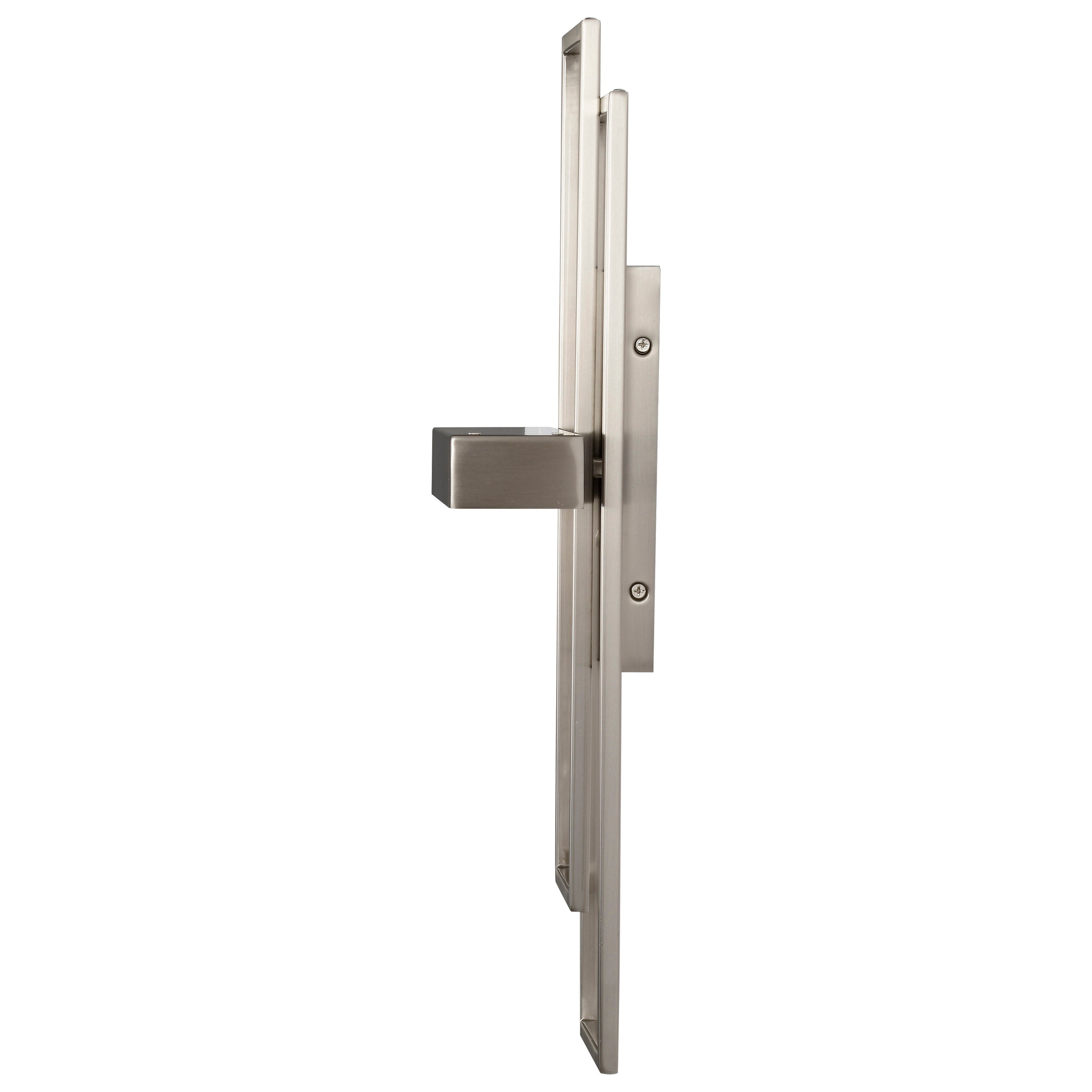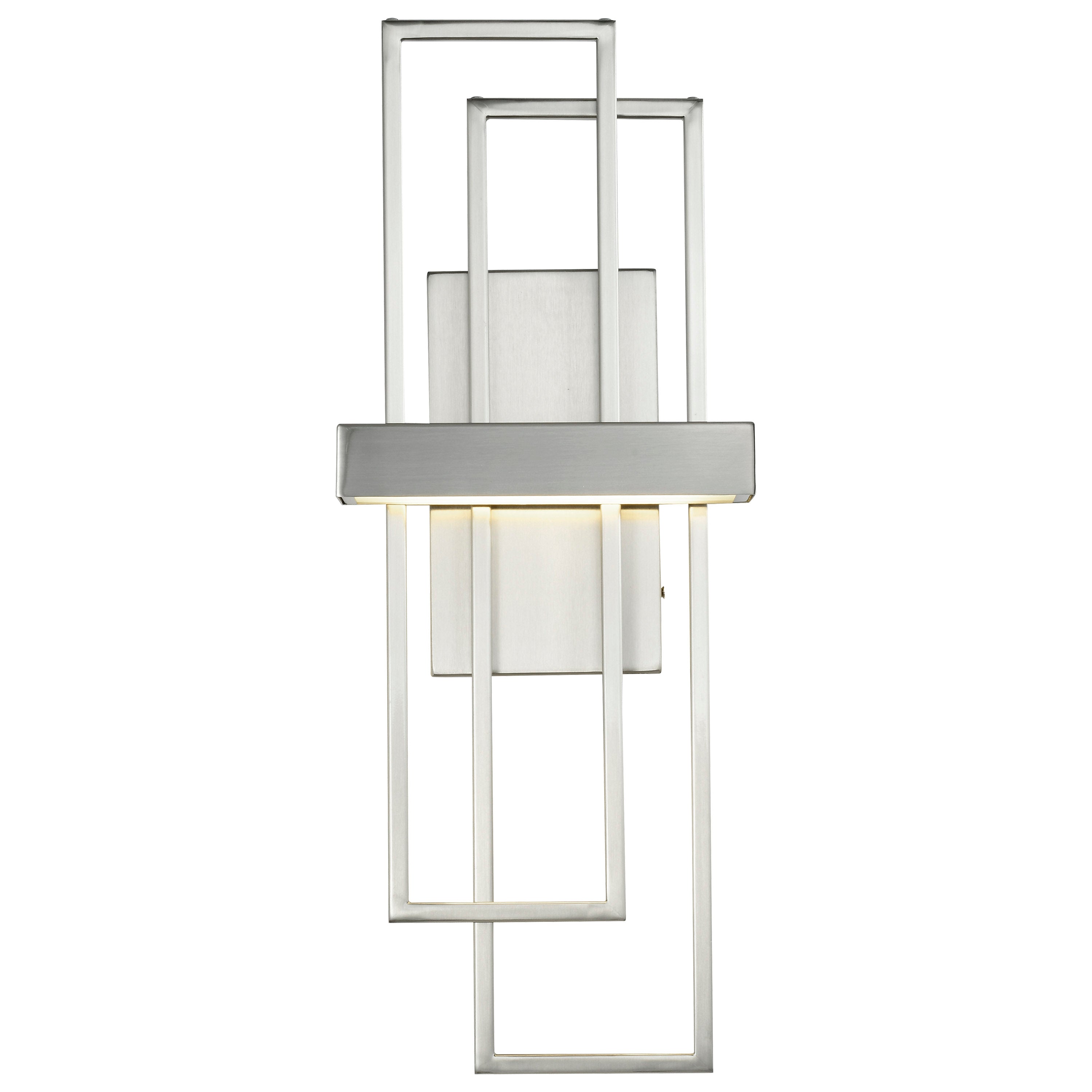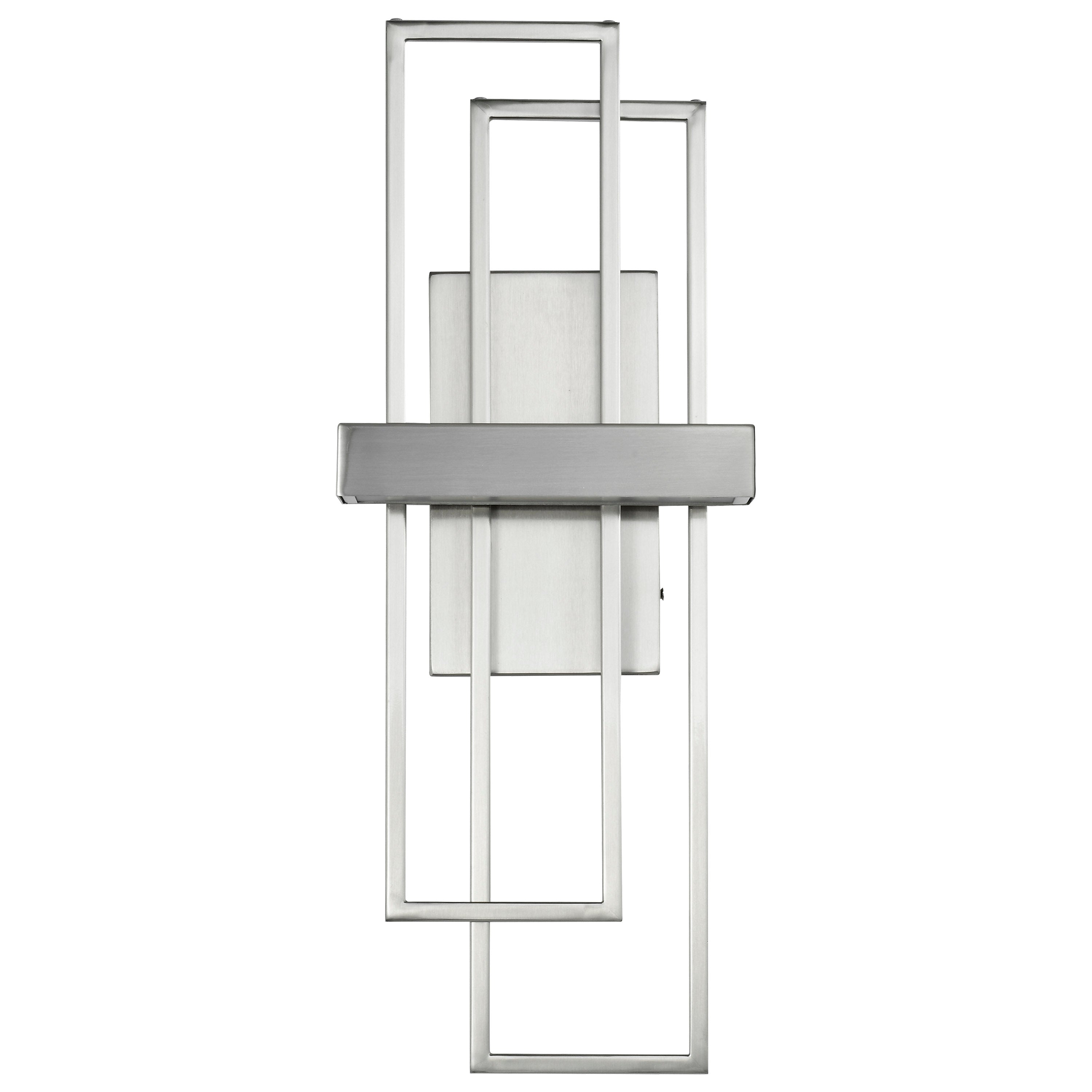 The Frame LED Wall Sconce offers contemporary style in a minimalist design. It features airy, open rectangles overlapping behind the integrated LED light source and is finished in a lustrous Brushed Nickel.