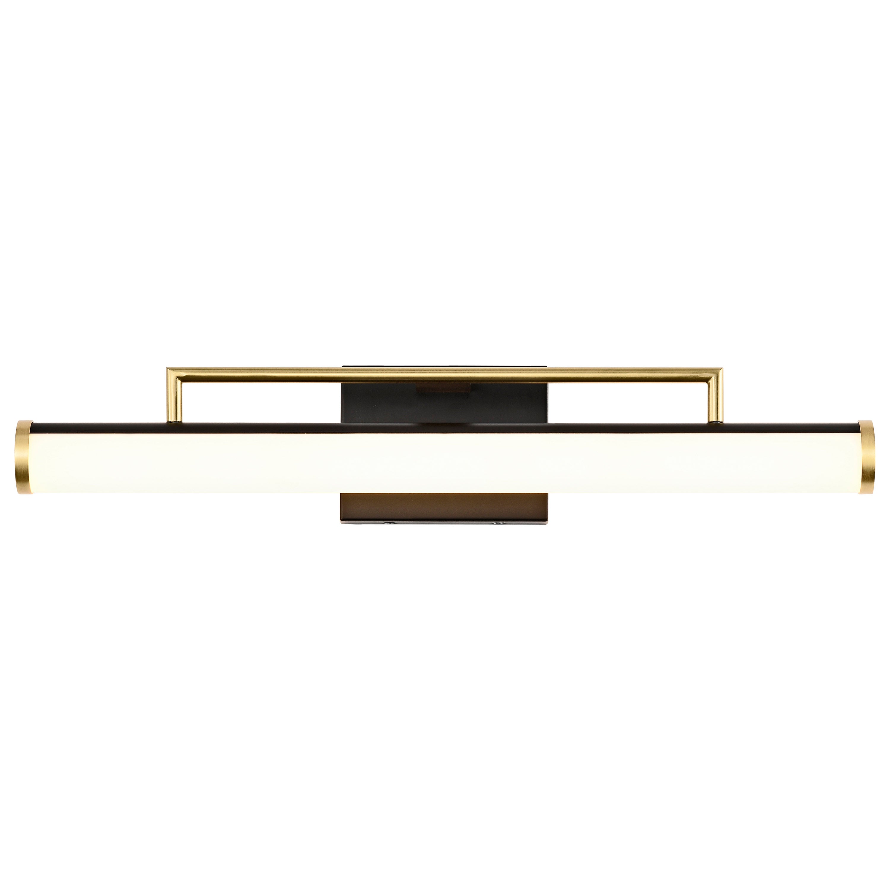 The design of the Solano integrated LED bathroom vanity lights series is sleek and minimalist, with a simple yet elegant shape. The stylish fixture is finished in black with brushed brass accents accentuate the clean lines and broad backplate. A white acrylic lens houses the diodes to softly diffuse the light for a warm and comfortable glow. Update a powder room or master bathroom with the Solano vanity lights, stunning lighting for today's home.