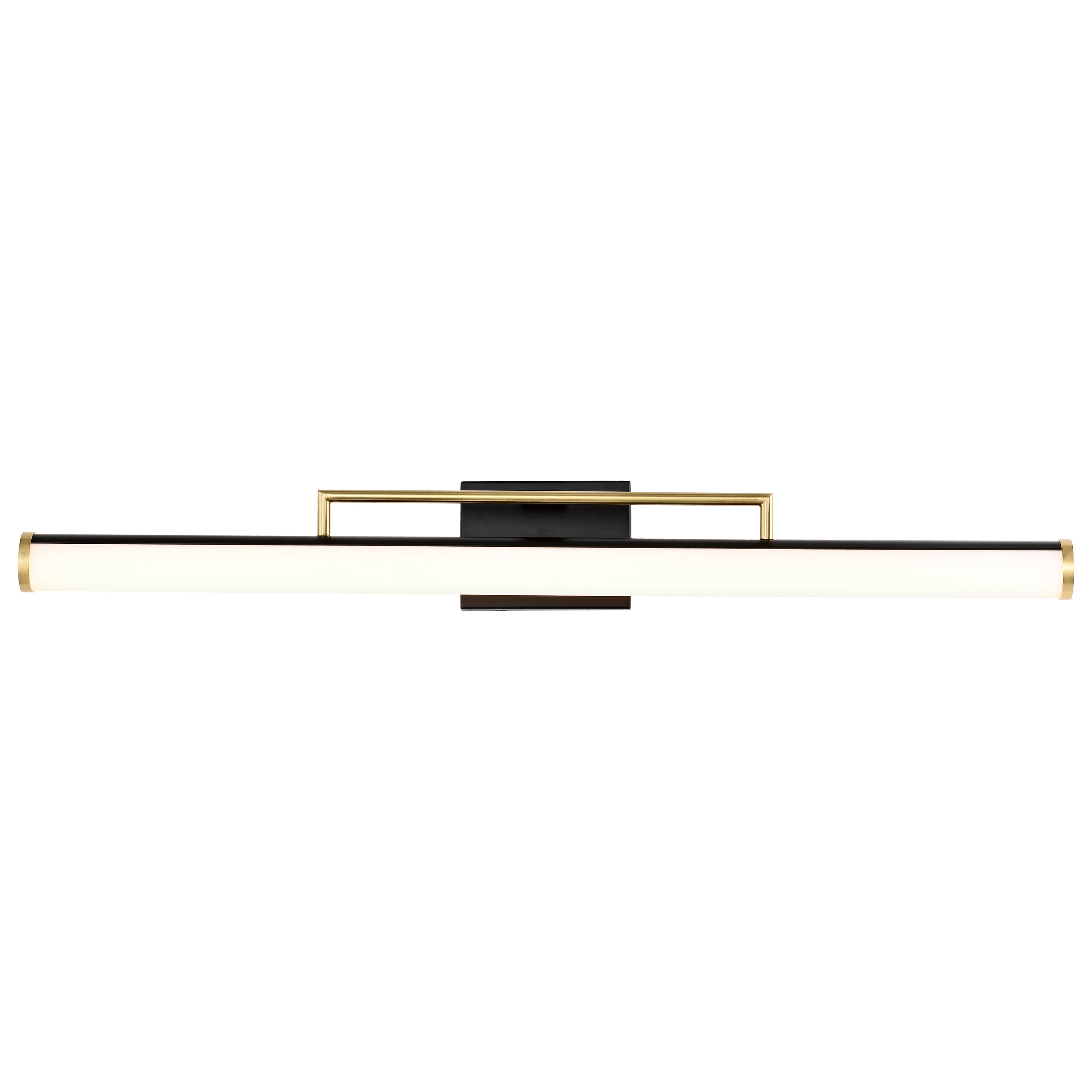 The design of the Solano integrated LED bathroom vanity lights series is sleek and minimalist, with a simple yet elegant shape. The stylish fixture is finished in black with brushed brass accents accentuate the clean lines and broad backplate. A white acrylic lens houses the diodes to softly diffuse the light for a warm and comfortable glow. Update a powder room or master bathroom with the Solano vanity lights, stunning lighting for today's home.