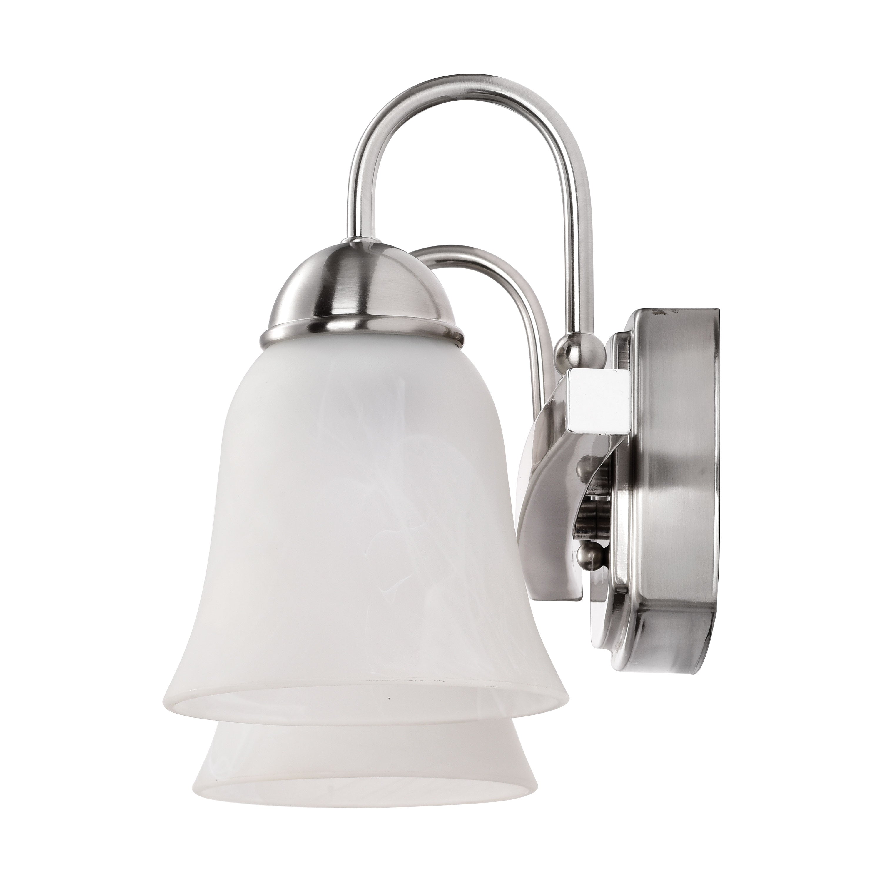 Satco's 15-watt, 2 light vanity is an elegant lighting solution for the home. Classic features and a traditional profile define the style double light vanity fixture. It features integrated LED and an alabaster glass shade, diffusing the light for a soft glow. Its versatile design and brushed nickel finish are perfect for a multitude of home decors.