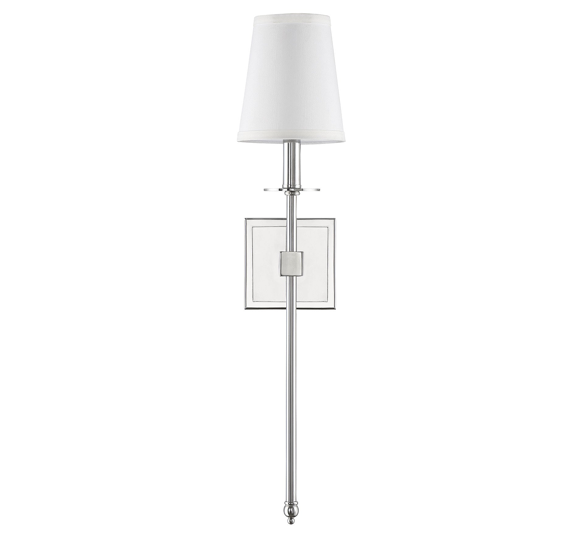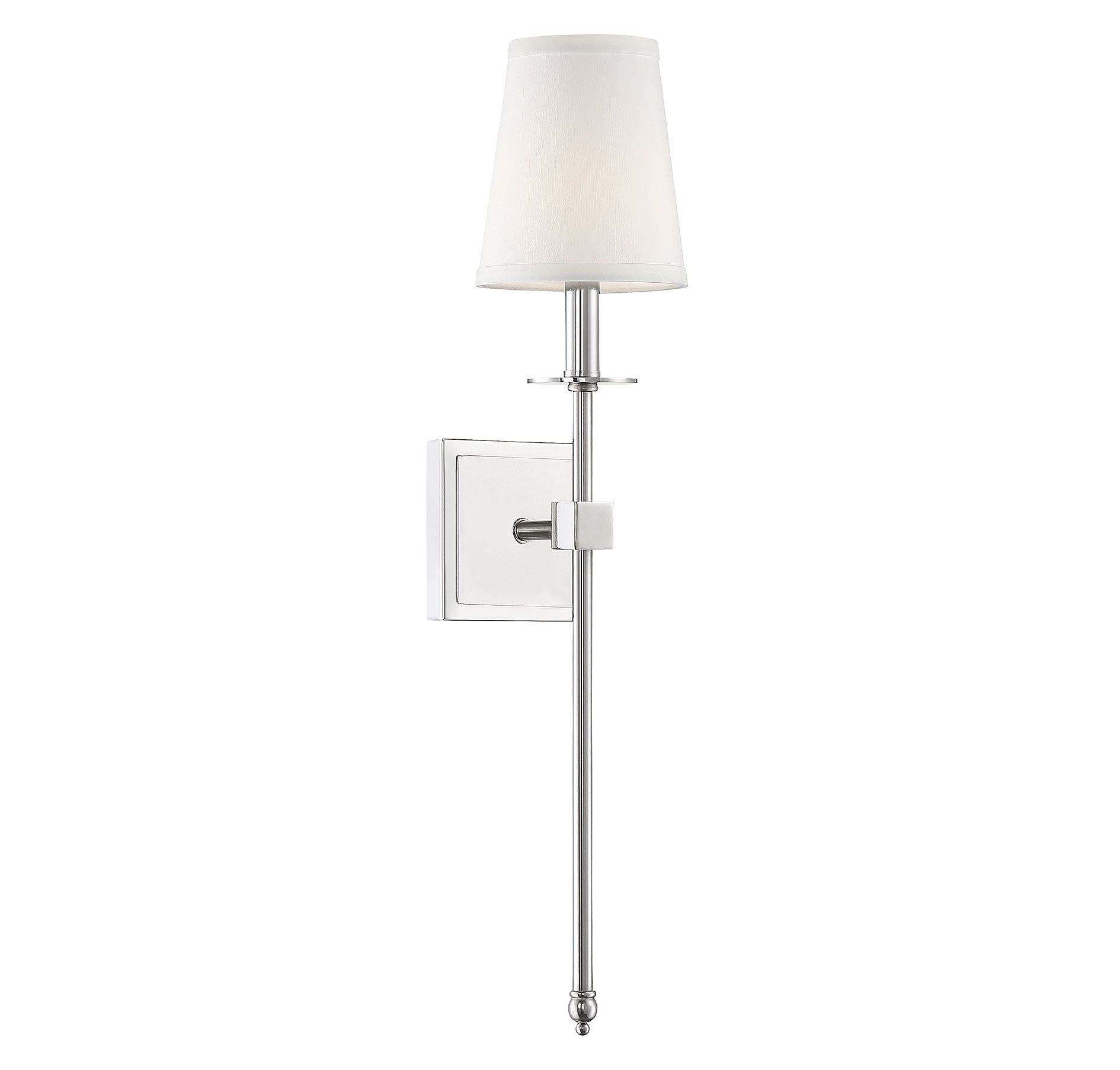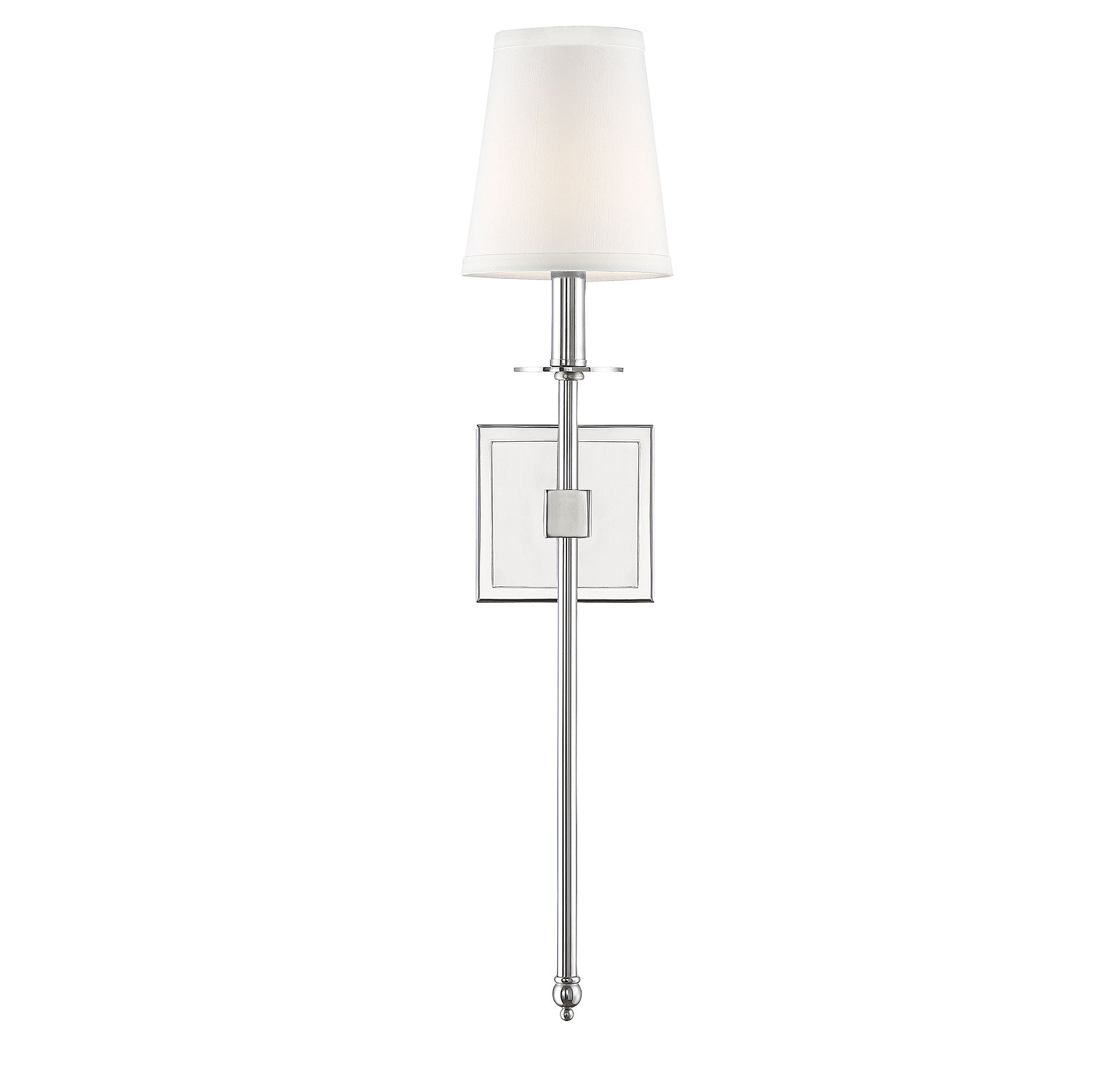 This Savoy House Monroe 1-light sconce features a long sleek body, a white fabric shade and a classy, contemporary silhouette. polished nickel finish. Sconces add a touch of style and light to any wall, including but certainly not limited to hallways, entryways, stairways, great rooms and dining rooms. You will also often see a pair of sconces flanking a bathroom vanity mirror to provide an even, flattering wash of light. Bulb not included. The polished nickel finish can be paired with nickel hardware or mixed with hardware in other finishes. Monroe is a perfect addition to rooms of any style, especially transitional or classic. When you choose a Savoy House lighting fixture, you can be certain you’ve selected a piece that will withstand the test of time.