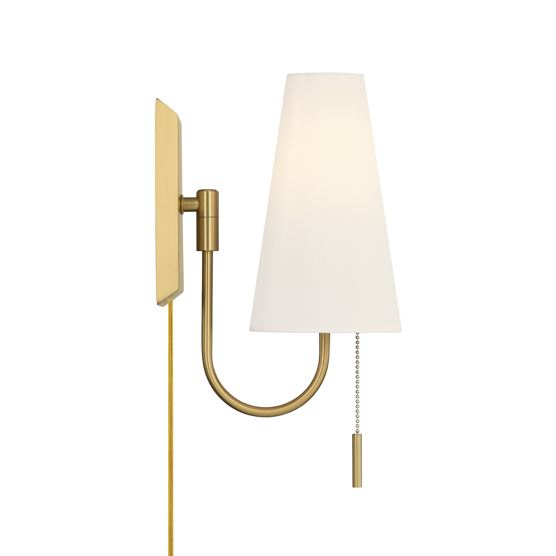The Savoy House Wilkes 1-light sconce, designed by award-winning interior designer Dann Foley, offers versatility and elegance in one beautifully executed piece. A Warm Brass finished arm and delicate pull chain strike a graceful note beneath the conical white fabric shade, making this fixture ideal for bedside lighting and reading nooks. Wilkes is 11.25" in height, 5" in width and extends 8" from the wall. It uses one standard size bulb of up to 60 watts. Bulb not included. Can be hard-wired or plugged in.