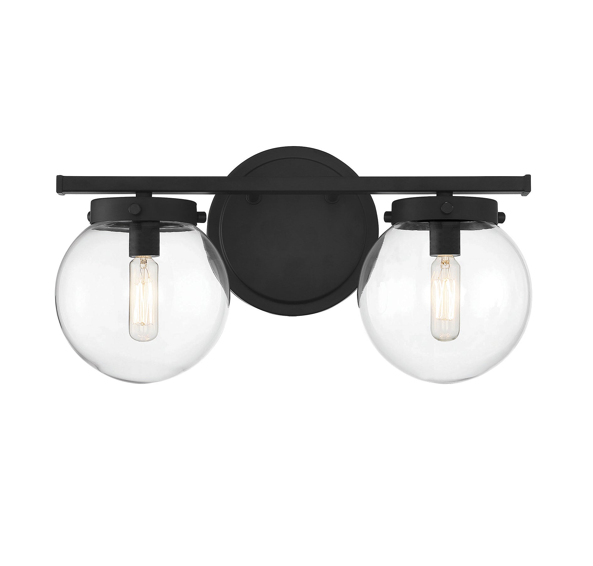 Add a bubbly look to your bath with this Meridian 2-light bath bar! Its streamlined design features globes of clear glass, a shape that is echoed in the circular backplate. This light will really pop in bathrooms with contemporary, modern and midcentury modern styles. Finished in matte black, it is also damp area rated. This bath light is 8" in height and 16" in width. It extends 7.25" from the wall and can be mounted with the shades facing up or down. It uses 2 candelabra size bulbs of up to 60 watts each, is dimmable and is LED compatible.