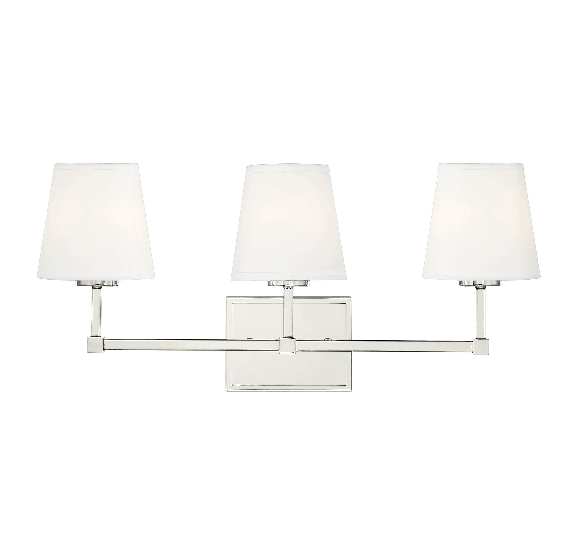 This Meridian 3-light bath vanity light takes traditional style and applies a contemporary touch, creating an updated look perfect for today's homes. Polished nickel finish with white linen fabric shades. 9.5" height, 24" width, extends 7" from wall. Max 60 watts per bulb, candelabra size C11 bulbs recommended. LED bulb compatible. Damp area rated.