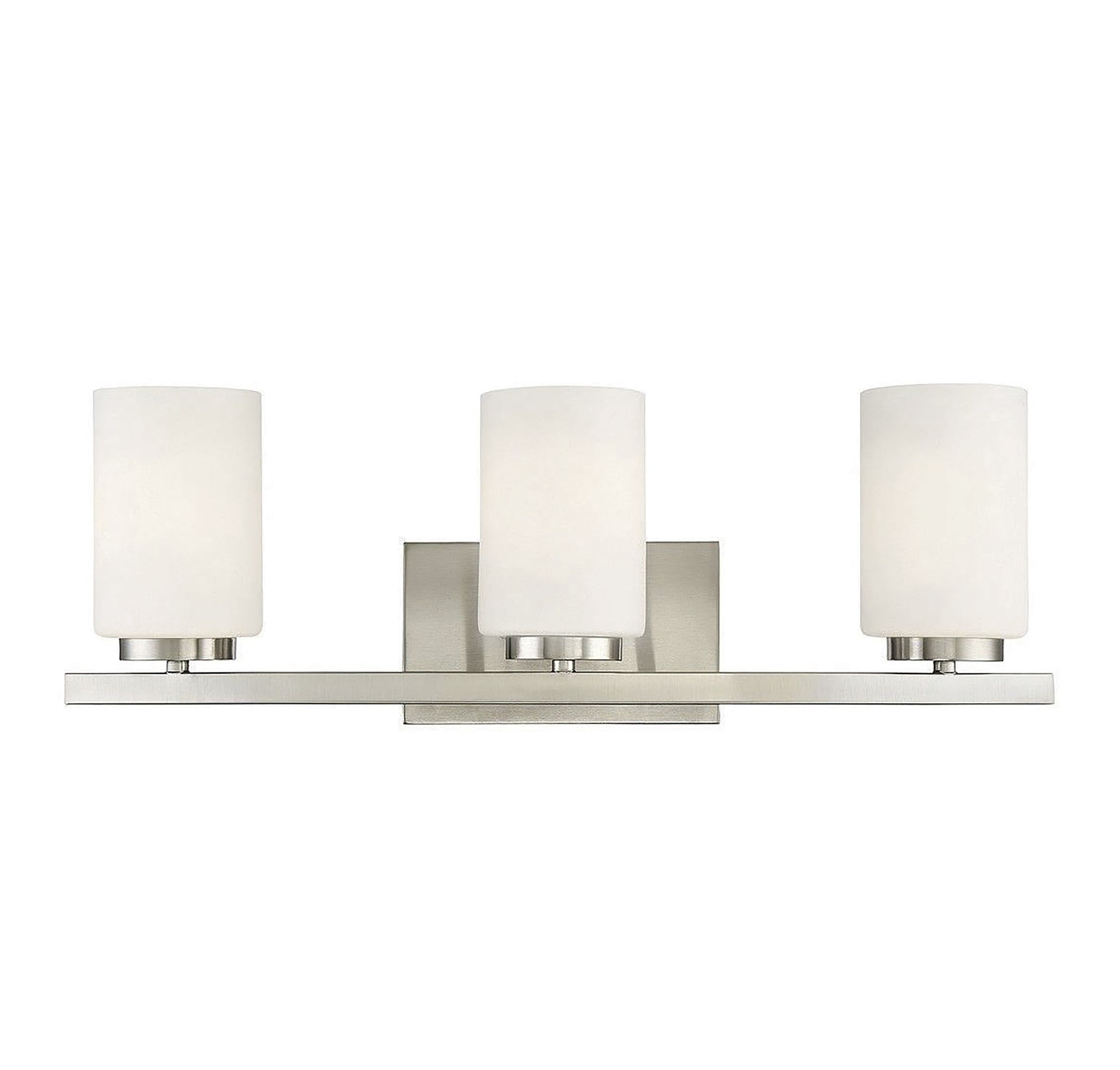 This Meridian 3-light bath vanity light is a surefire way to brighten up your bath and start every day a little bit better. Its white opal etched glass shades and brushed nickel finish ensure bright, even illumination. 8" height, 24" length, 6.5" width. Max 60 watts per bulb, standard size A19 bulbs recommended. Damp area rated.