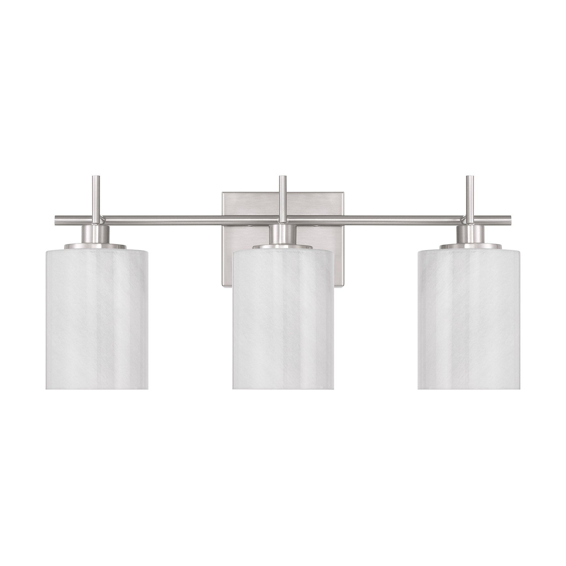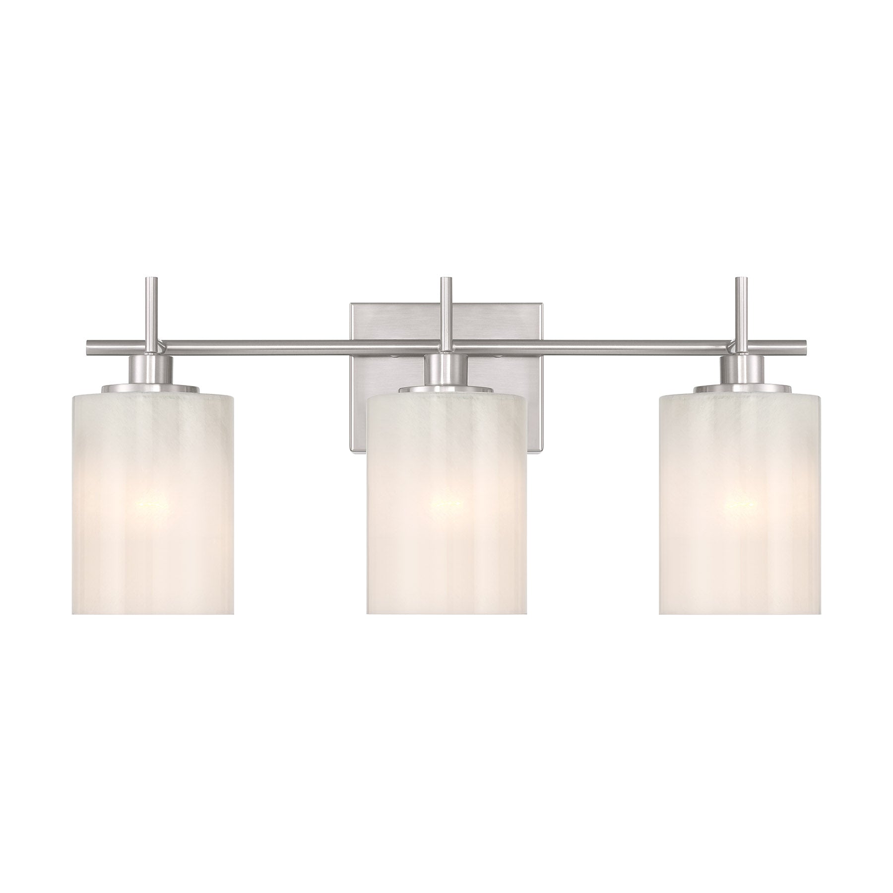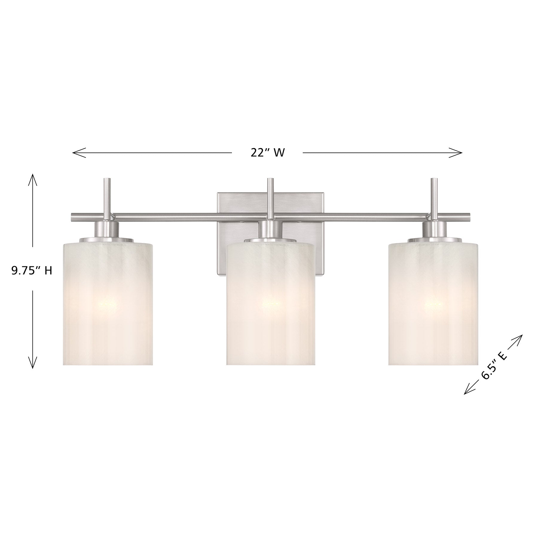 Brighten up your bath easily and beautifully with this 3-light bath bar, which showcases shades of strie glass featuring dazzling swirls that draw the eye, soften the glow and work beautifully with the Brushed Nickel finish. It is 9.75" in height, 22" in width and extends 6.5" from the wall. Uses three standard size bulbs of up to 60 watts per bulb. Bulbs not included.