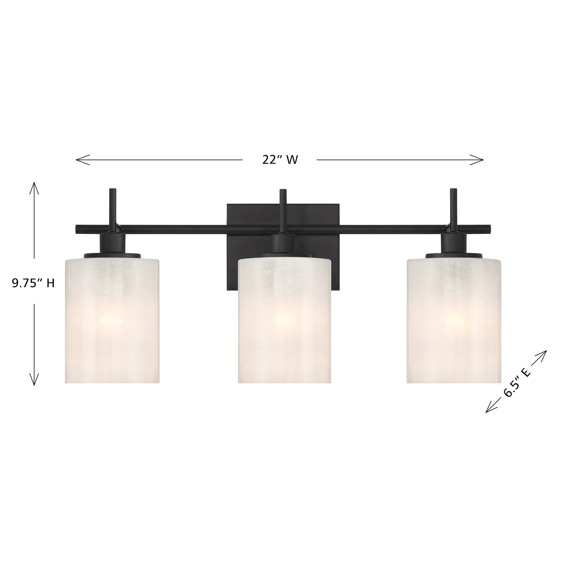 Brighten up your bath easily and beautifully with this 3-light bath bar, which showcases shades of strie glass featuring dazzling swirls that draw the eye, soften the glow and work beautifully with the Matte Black finish. It is 9.75" in height, 22" in width and extends 6.5" from the wall. Uses three standard size bulbs of up to 60 watts per bulb. Bulbs not included.