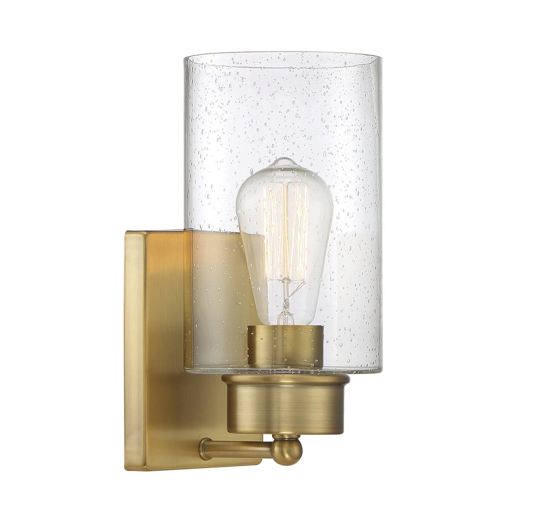 The cylindrical clear seeded glass shade on this 1-light sconce gives off bold light and pairs well with the Natural Brass finish. 10.5" in height and 5" in width. Extends 6.25" from the wall.