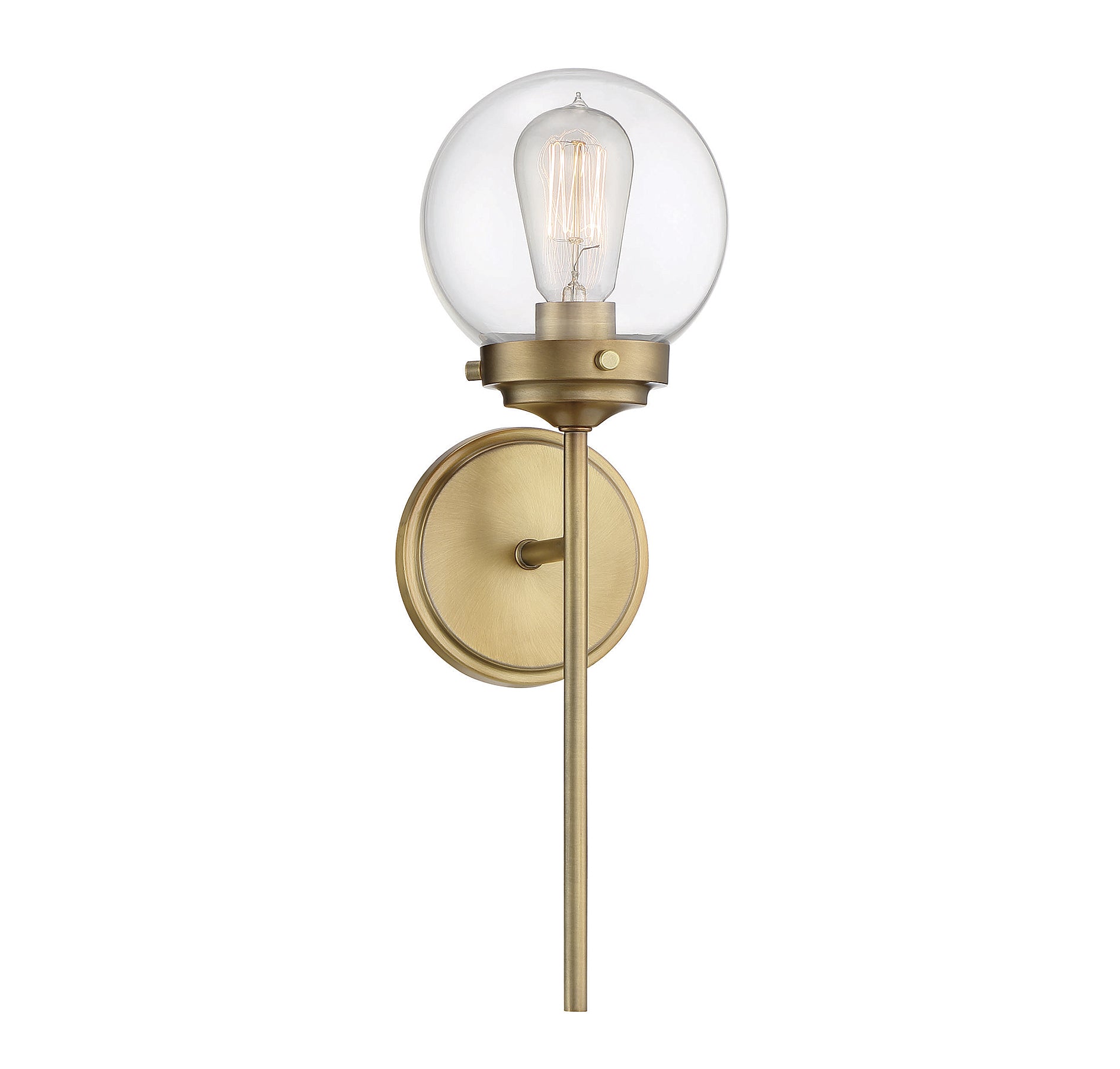 Get industrial with this bold 1-light sconce, offering a long arm, an orb-shaped shade of clear glass and a Natural Brass finish. 18" in height and 6" in width. Extends 6.88" from the wall.
