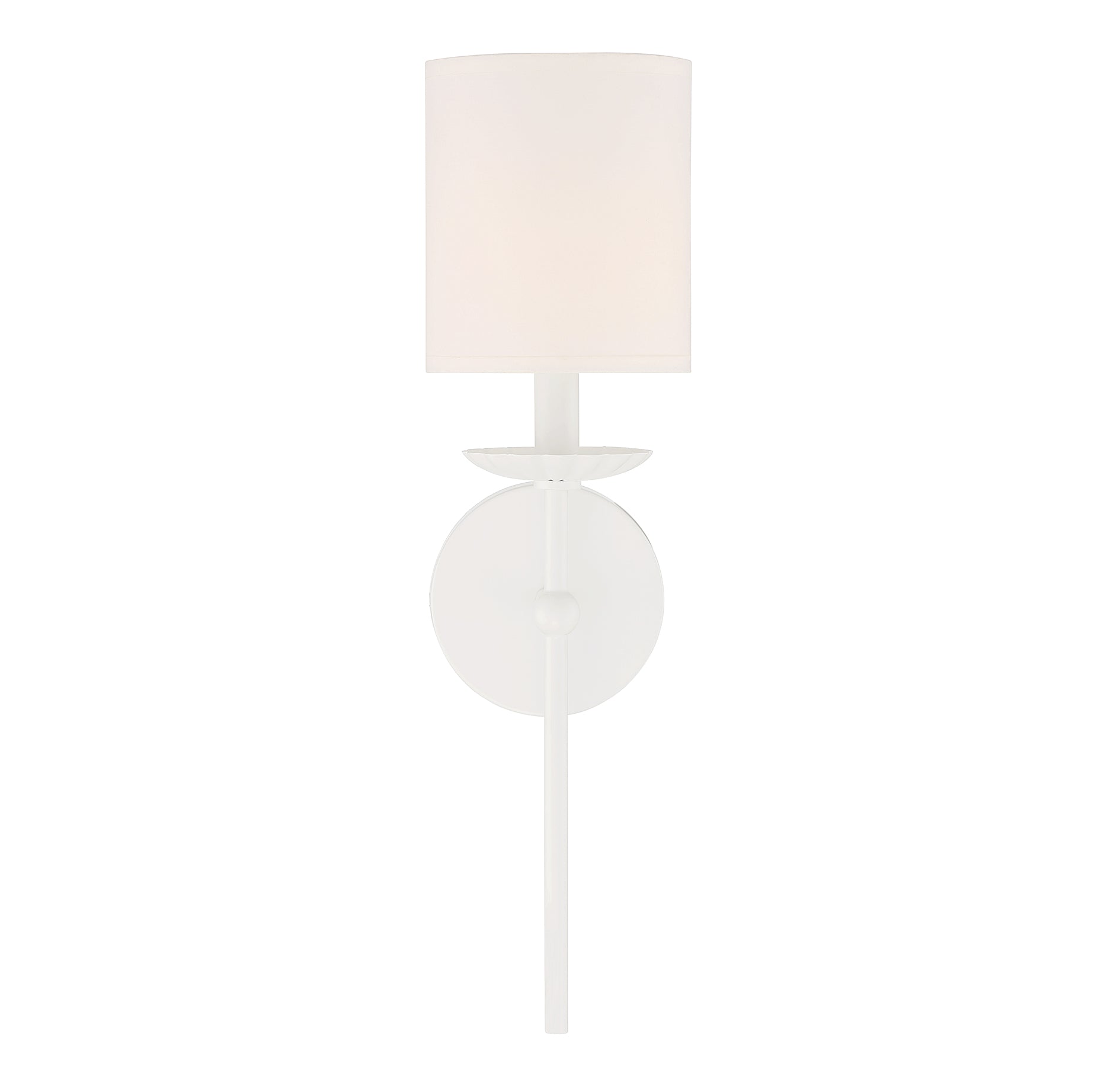 This Meridian 1-light wall sconce features a simply sleek look with a flower-like bobeche beneath the white linen shade. The white finish creates consistent cool. This sconce looks great when used solo or in groupings! 18.5" height, 5" width, extends 6.25" from the wall. Max 60 watt bulb, candelabra size C11 bulb recommended. LED bulb compatible. Damp area rated.
