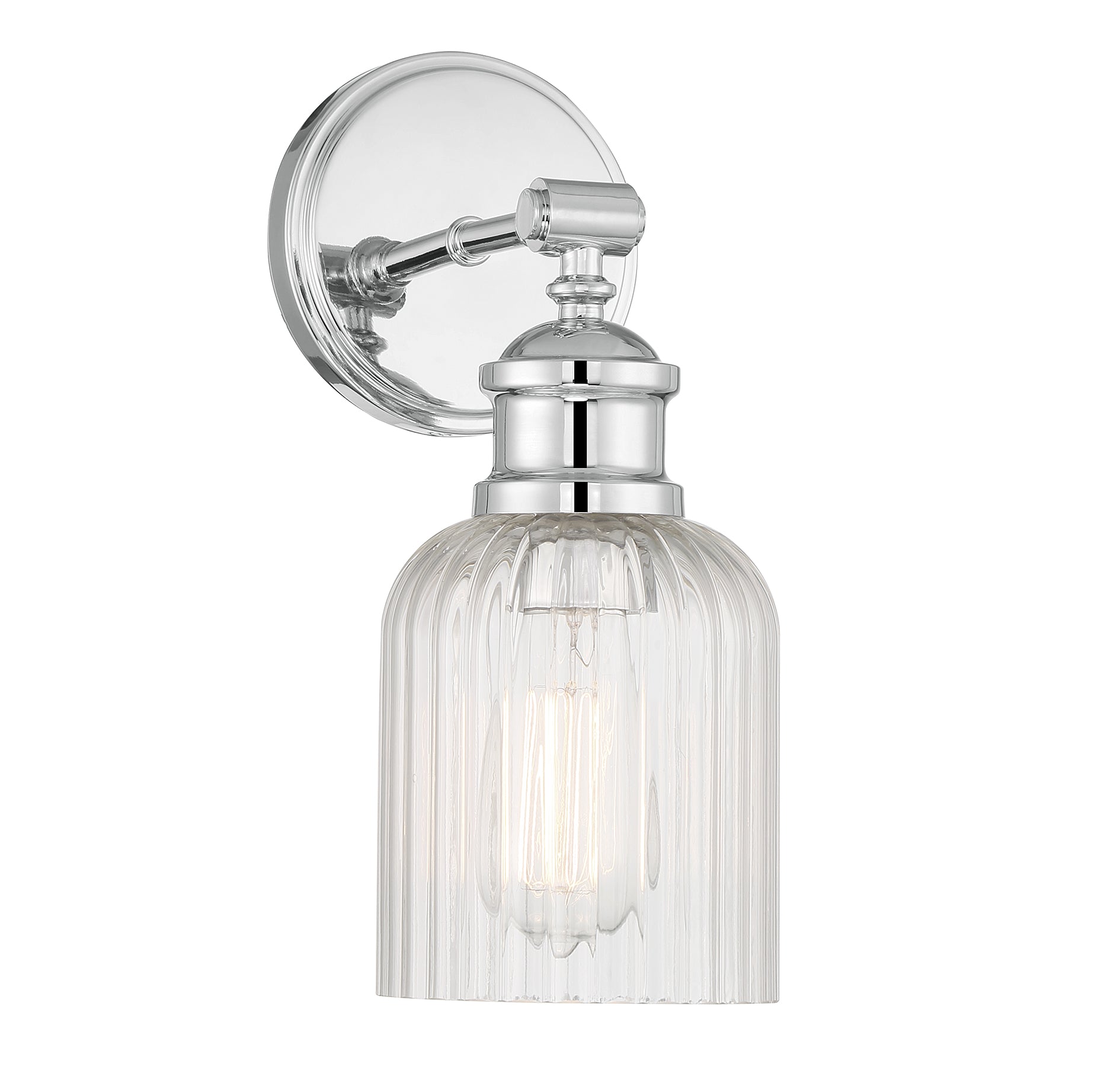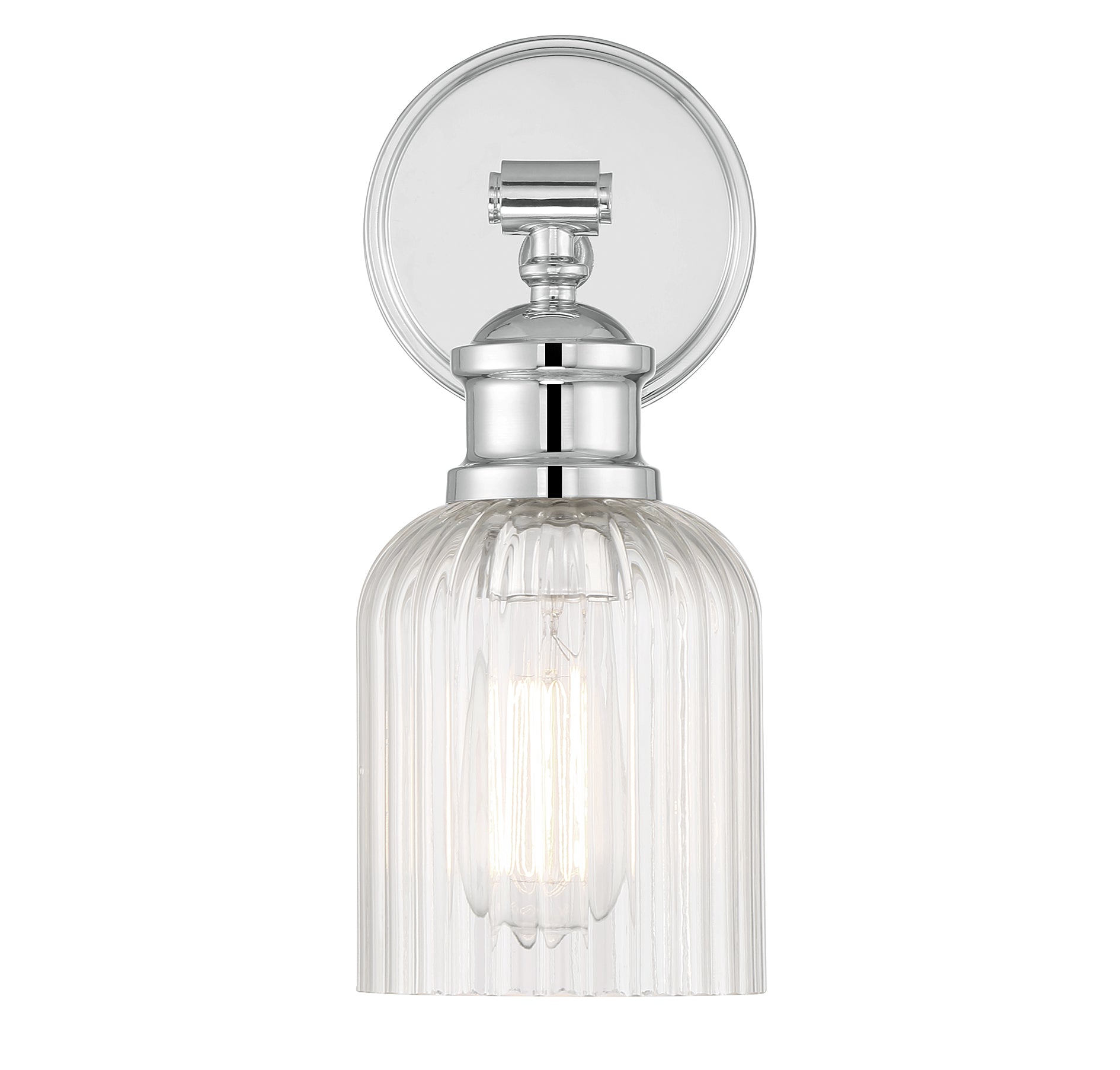 A clear ribbed glass shade adds texture and intrigue to this vintage-inspired Meridian 1-light wall sconce, which is finished in chrome. Perfect when used solo or in groupings. 12" height, 5" width, extends 6.75" from the wall. Max 60 watt bulb, standard size A19 bulb recommended. LED bulb compatible. Damp area rated.