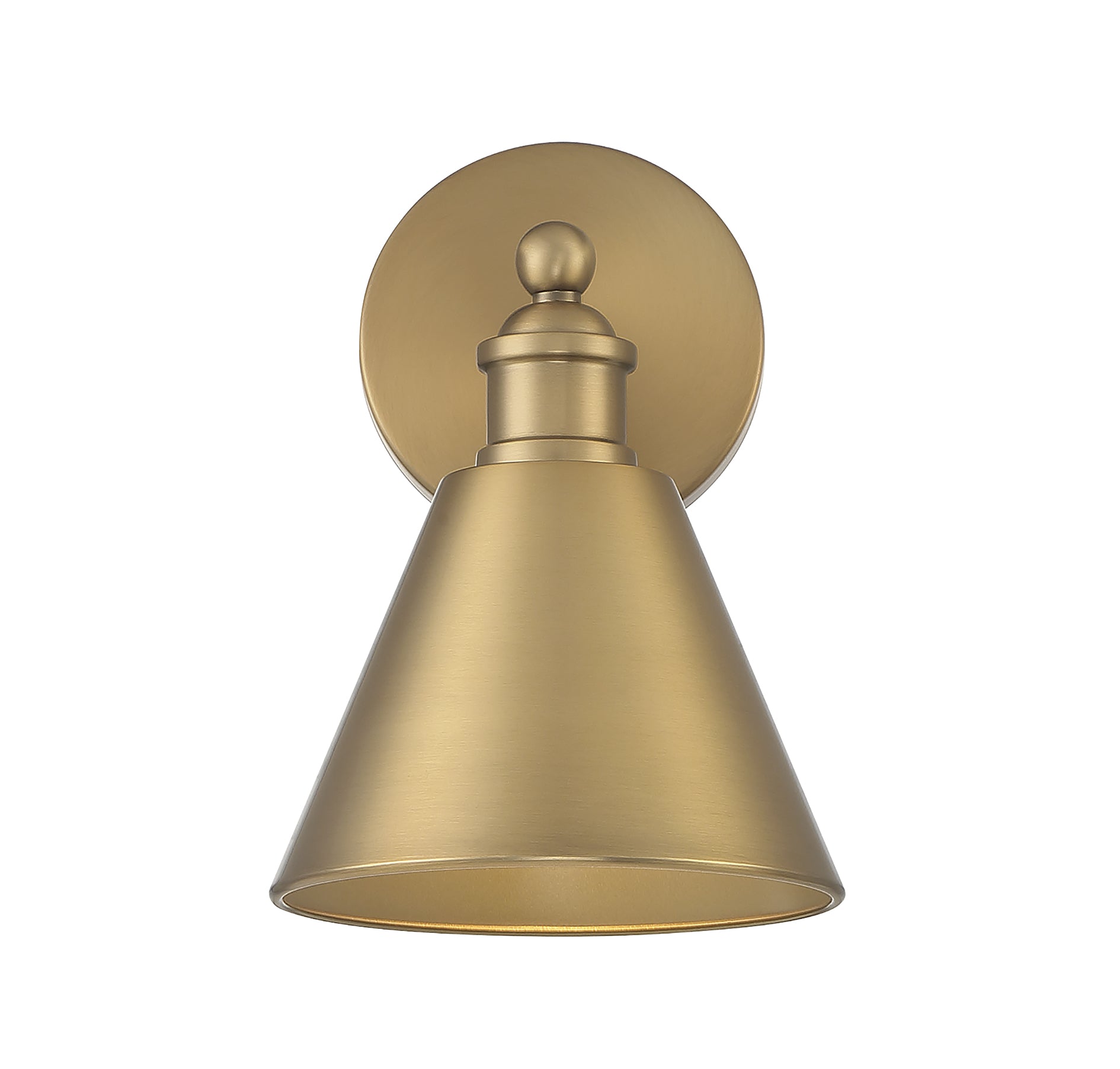 This totally natural brass Meridian 1-light wall sconce is sure to add bright drama in any room. From the backplate to the bottom of the metal shade, everything on this sconce brings a big dose of metallic magic. 10" height, 6.75" width, extends 9" from the wall. Max 60 watt bulb, standard size A19 bulb recommended. LED bulb compatible. Damp area rated.
