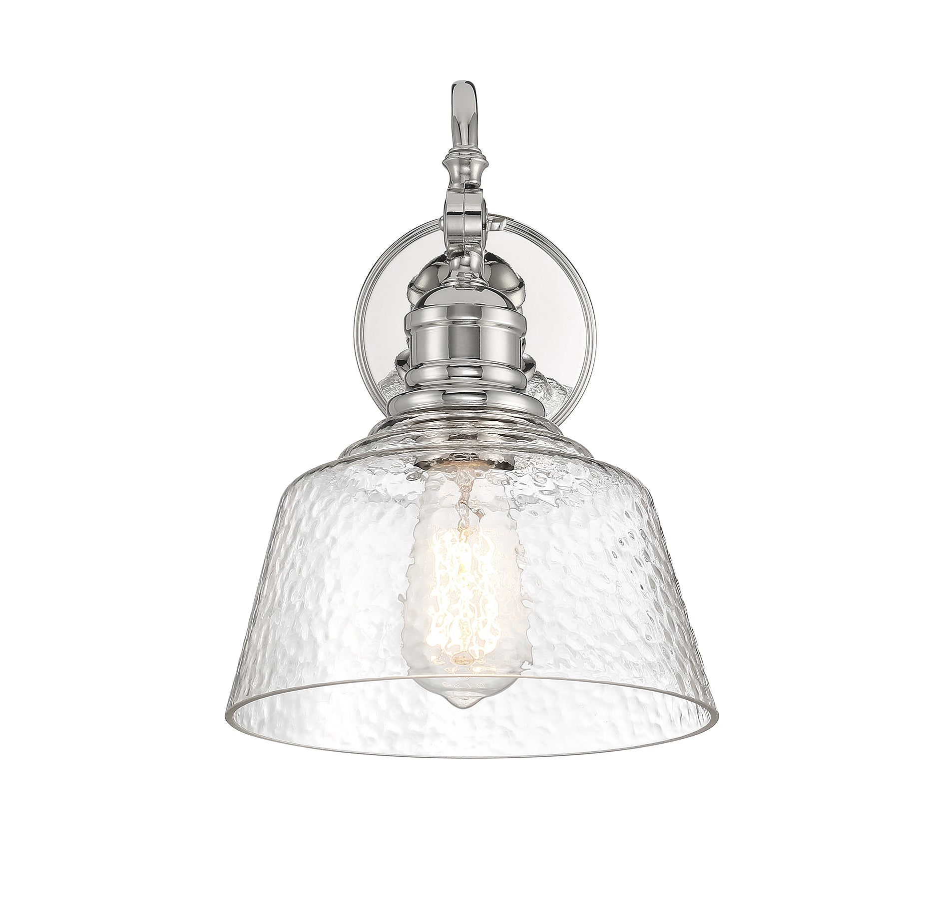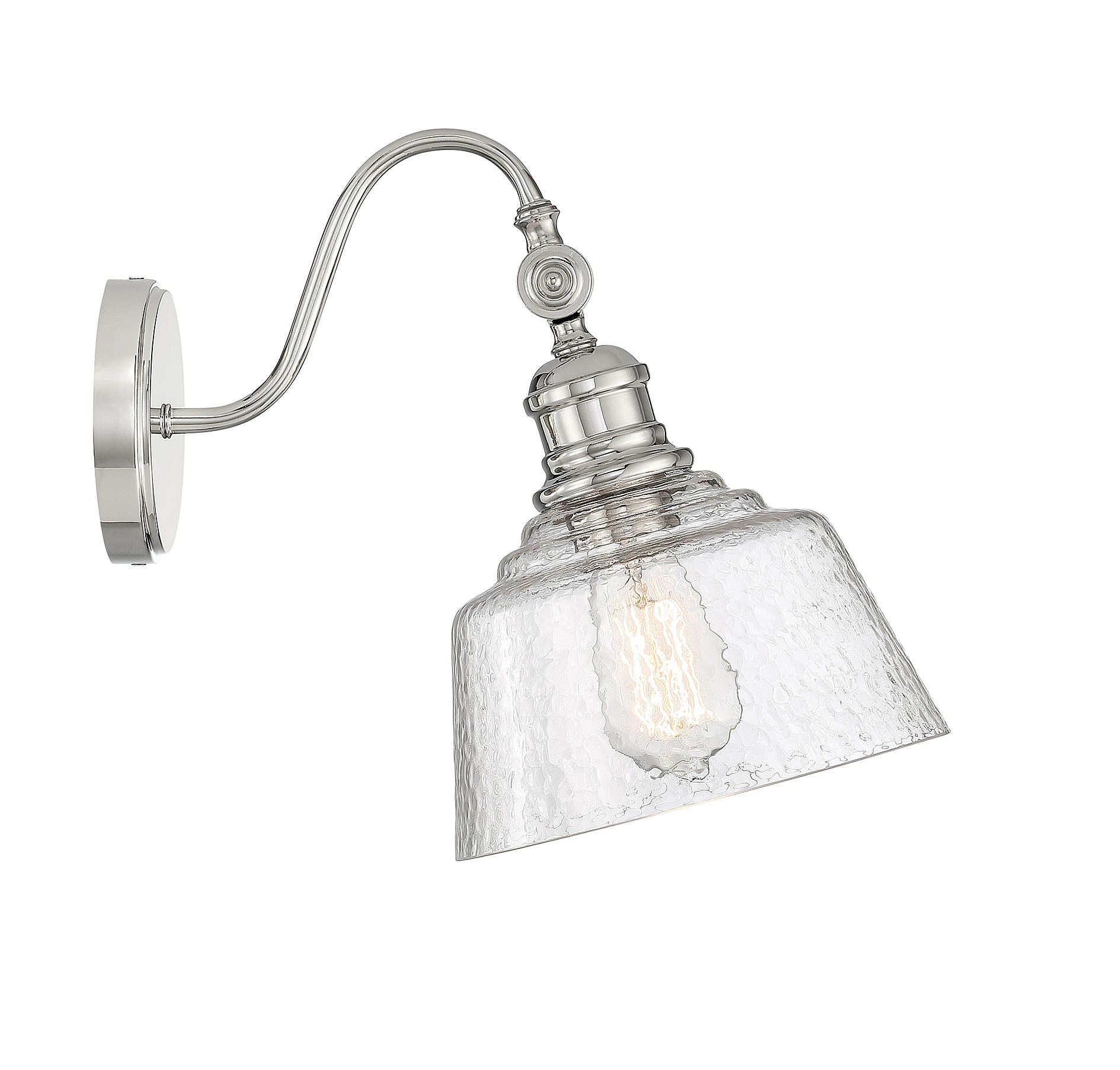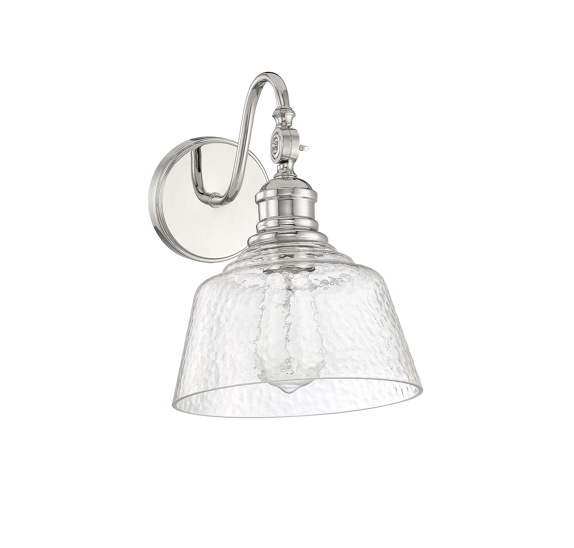 Bring a bold touch of vintage industrial style to any space with this 1-light adjustable sconce. It features a highly textured shade of glass, eye-catching detailing and a polished nickel finish. 11.5" height, 9" width. Uses standard size bulb, max 60 watts. LED bulb compatible.