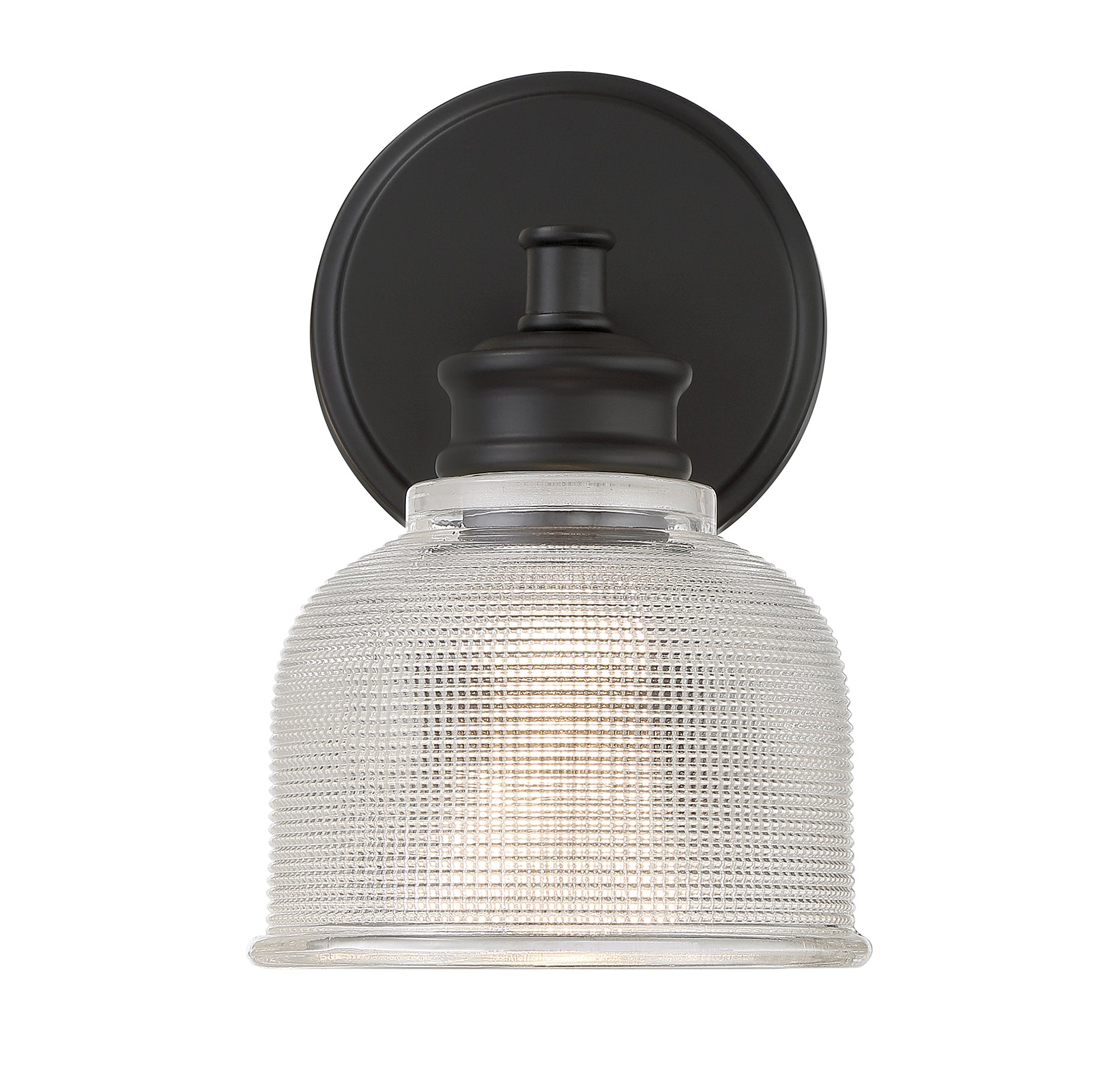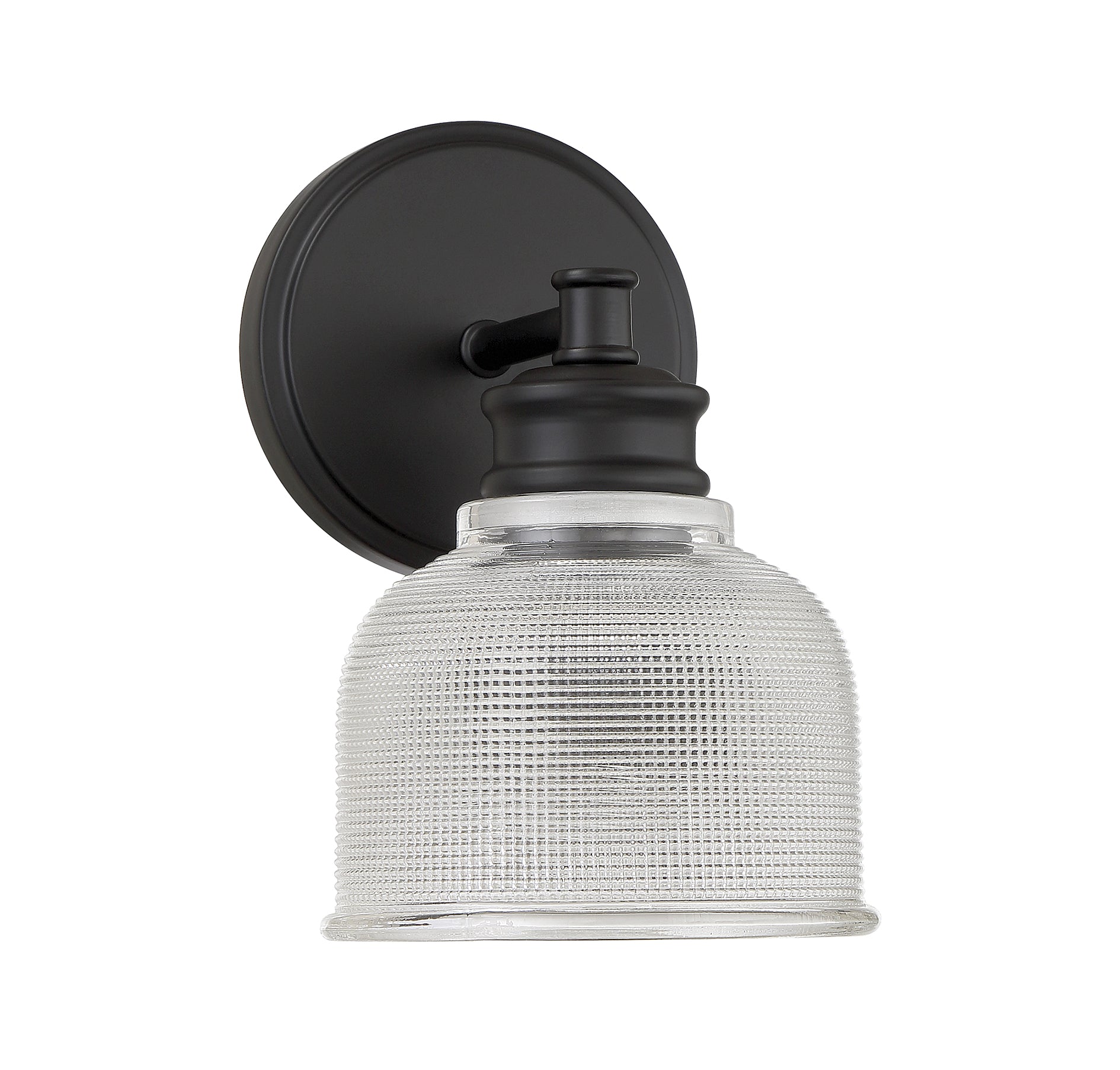This 1-light sconce helps you bring a touch of vintage inspiration to any space. It has a highly textured shade of glass and a matte black finish. 9.5" height, 5" width. Uses standard size bulb, max 60 watts. LED bulb compatible.