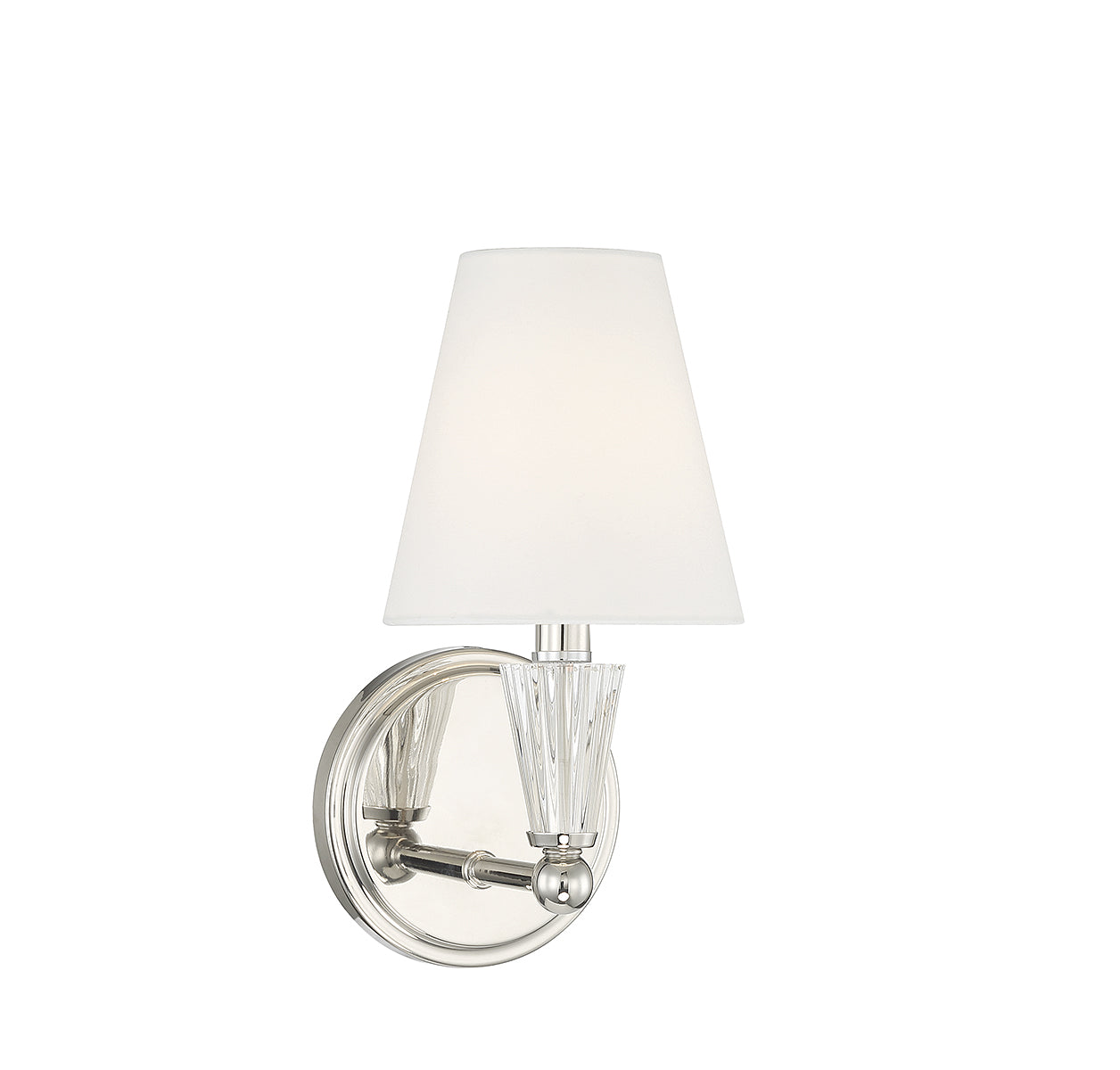 This 1-light sconce features a touch of sparkle that adds a big dose of glamour to any space! A faceted crystal accent sits on the arm, its shape echoing the white fabric shade. Polished Nickel finish. 11.5" height, 5.5" width, extends 7" from the wall. It uses 1 candelabra size bulb with a max of 60 watts (not included). Damp area rated. Install as shown.